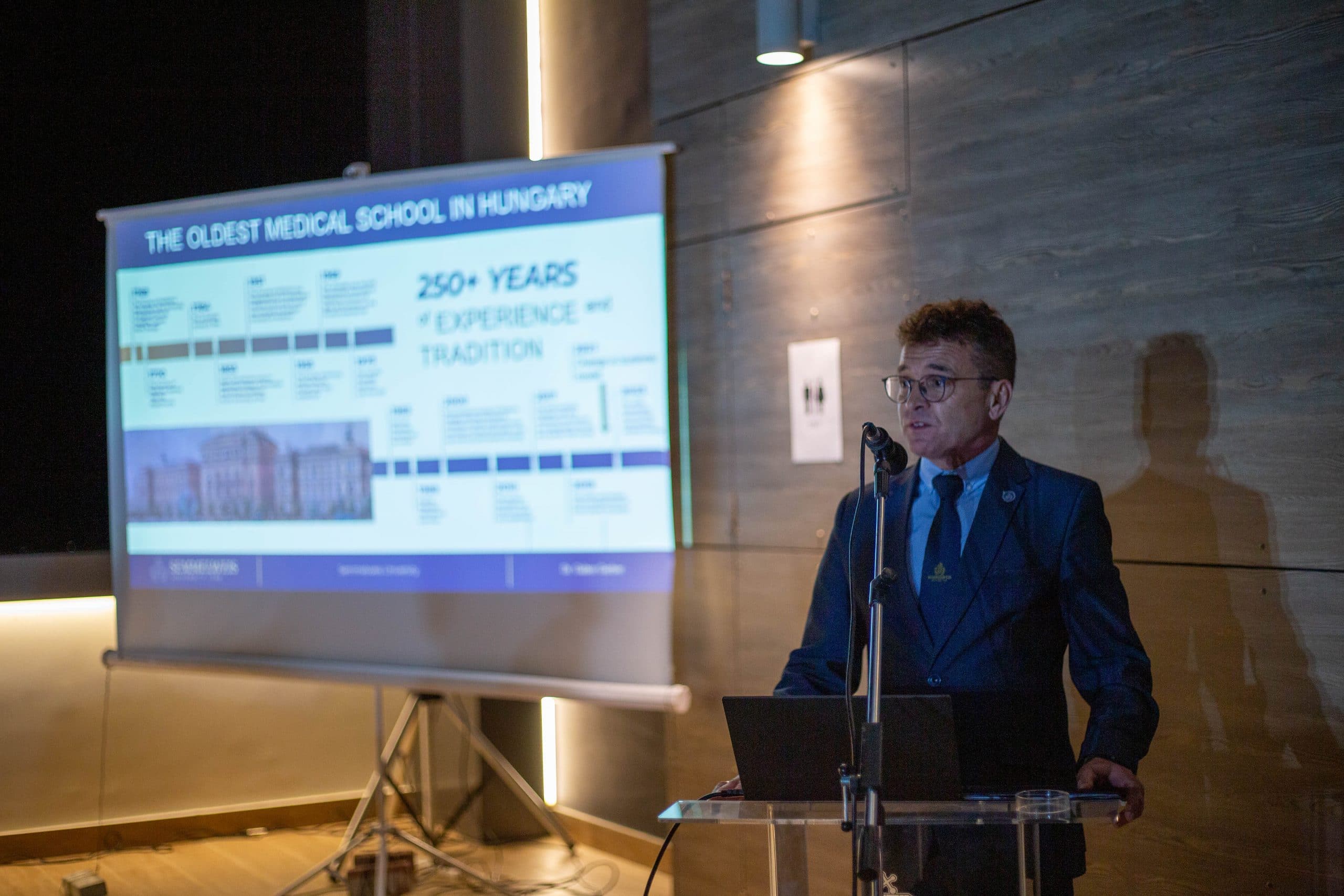 A műsort követően dr. Gerber Gábor dékán üdvözölte a körülbelül hetvenfős vendégséget, az egyetem végzett hallgatóit és kollégáit, majd előadásában ismertette a Semmelweis Egyetem történetét, misszióját, fejlesztéseit, céljait és nemzetközi kapcsolatait.