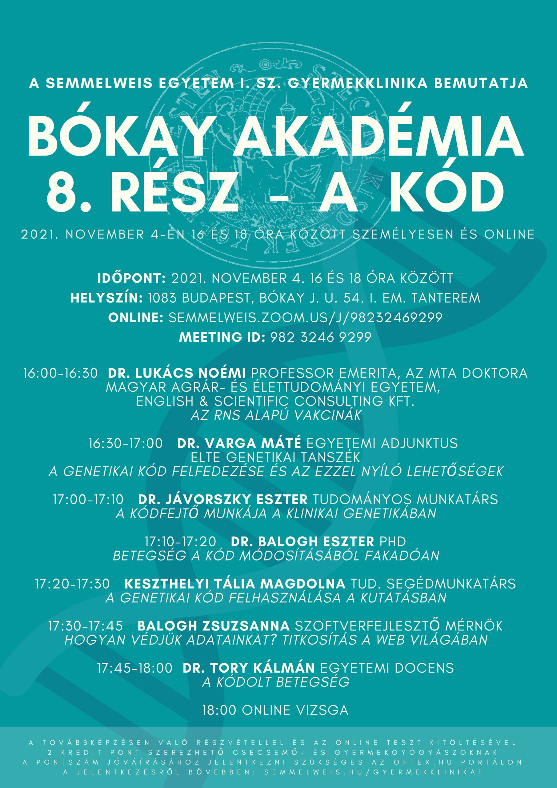 Szeretettel meghívunk minden érdeklődőt a régi hagyományokat új technikai eszközökkel felelevenítő, nagy sikerű rendezvénysorozat következő alkalmára. A Bókay Akadémia a Semmelweis Egyetem I. sz. Bókay Gyermekklinikájának a továbbképzése, mely a Bókay Délután és Rezidens Szalon hagyományait követve az orvostudomány és egyéb tudományterületi ágakat kapcsolja össze.
