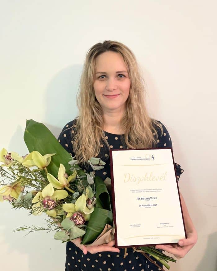 A Petényi-díjat dr. Herczeg Vivien kapta, a Frontiers in Endocrinology folyóiratban megjelent tanulmányáért (Increasing prevalence of thyroid autoimmunity in childhood type 1 diabetes in the pre-COVID but not during the COVID era). Kutatása nemzetközi szinten is hozzájárul a gyermekkori autoimmun betegségek jobb megértéséhez.