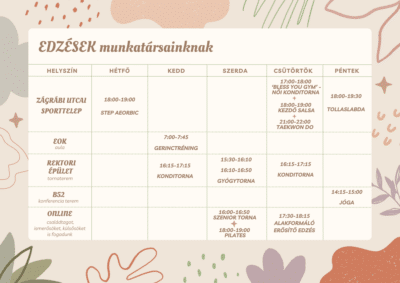 Az edzések (a tollaslabda kivételével) munkatársaink számára ingyenesek. A tollaslabda edzésen történő részvételhez csatlakozzon a Semmelweis Egyetem Sport Klubjának Tollaslabda Szakosztályához.