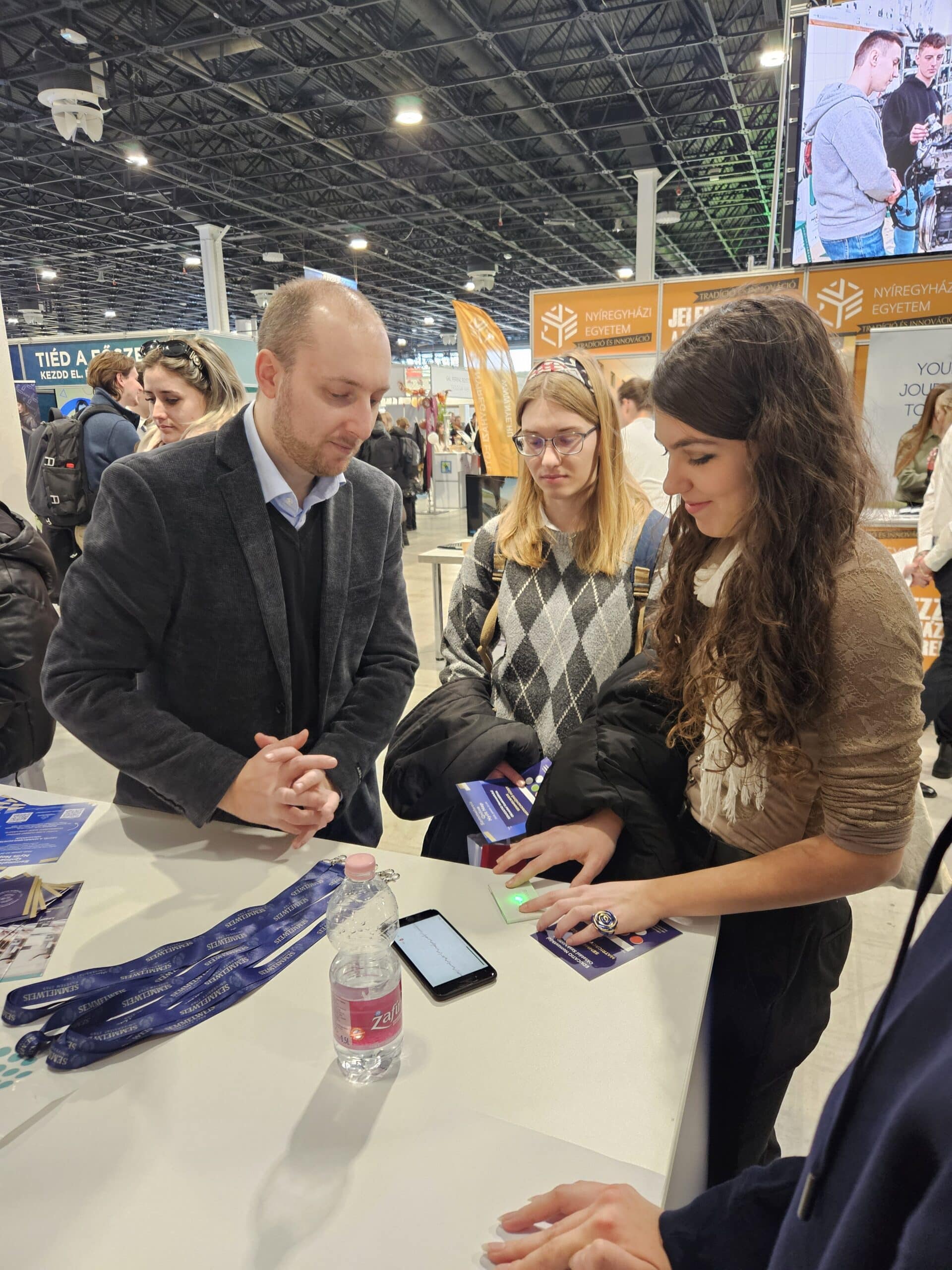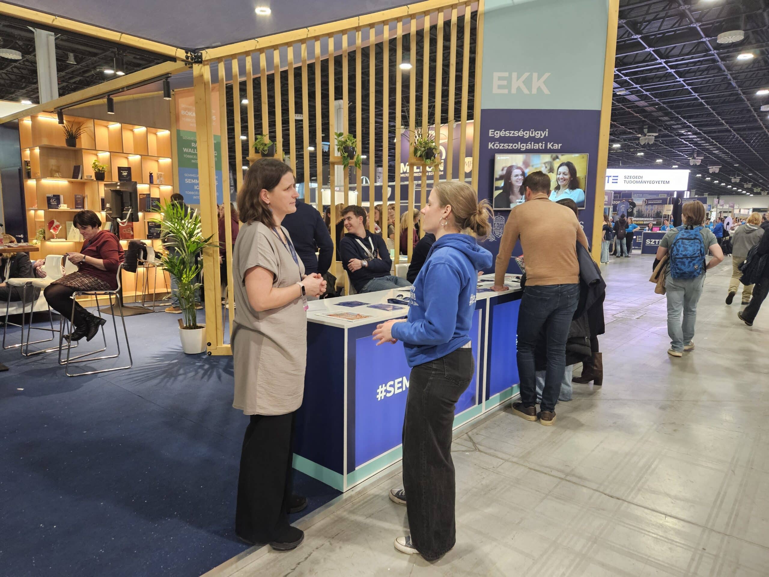 Az Egészségügyi Közszolgálati Kar standjánál Prof. Dr. Pethesné Dávid Beáta dékán asszony, Dr. Bóné Veronika dékánhelyettes, a Mentálhigiéné Intézet képviseletében, Sinka Lászlóné Adamik Erika az Egészségügyi Menedzserképző Központ, míg Dr. Palicz Tamás a Digitális Egészségtudományi Intézet vezetőjeként beszélgetett az érdeklődő diákokkal és esetenként a szülőkkel, hogy a mai egészségügyi munkaerőpiacon milyen kilátásai vannak a karunkon végzett Bsc vagy Msc végzettségű hallgatóknak.