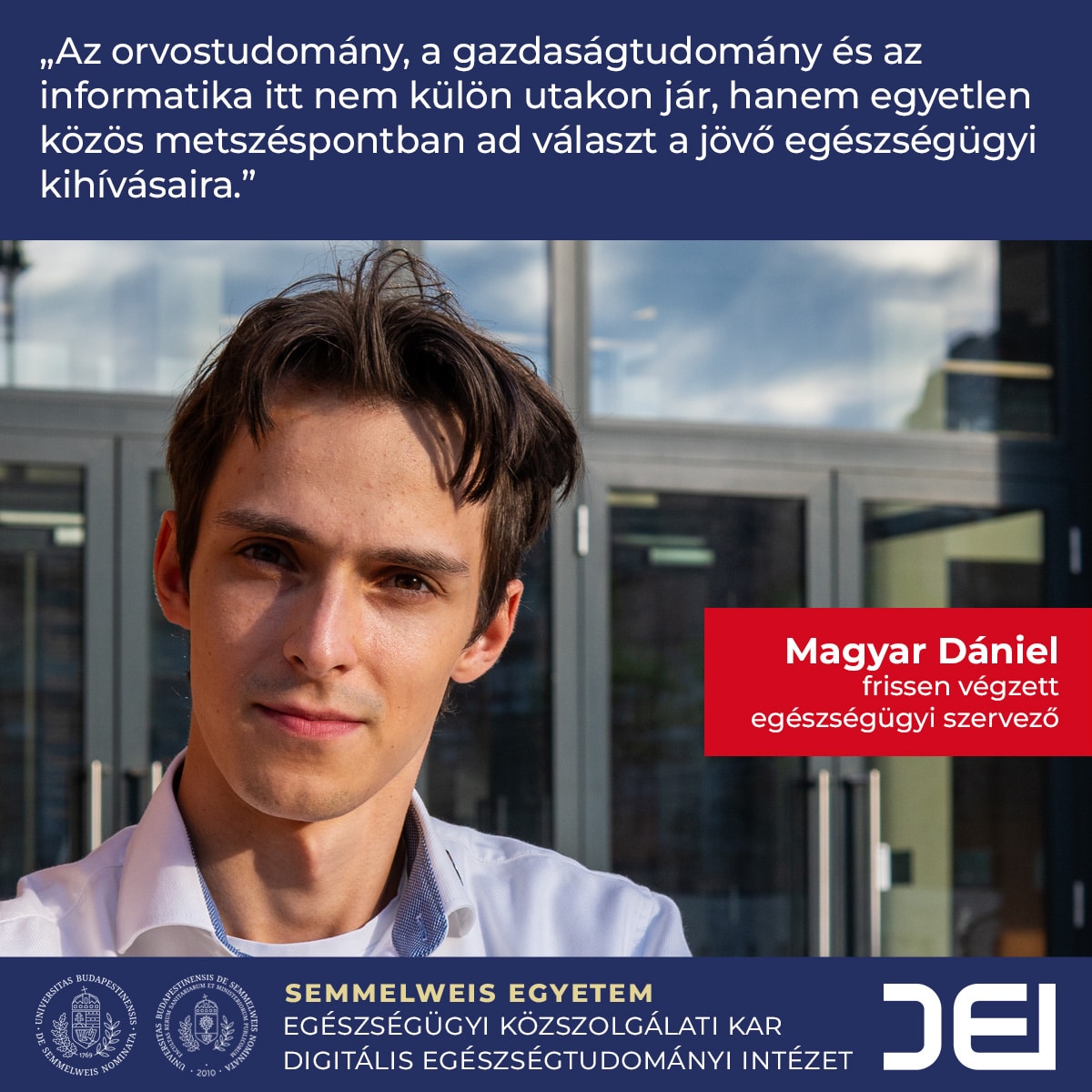 Ami a Semmelweis Egyetem, Egészségügyi Közszolgálati Karát igazán egyedivé tette számomra, az a hármas fókusz. Az orvostudomány, a gazdaságtudomány és az informatika itt nem külön utakon jár, hanem egyetlen közös metszéspontban találkozik, és ebből a metszéspontból ad választ a jövő egészségügyi kihívásaira. Ez a szemlélet végig ott volt a tantárgyak logikájában, a projektekben és a közös munkákban is: egyszerre kellett érteni a szakmai tartalmat, a szervezeti és finanszírozási realitásokat, valamint a digitalizáció lehetőségeit. Úgy érzem, ez a komplex, integrált megközelítés teszi az EKK-t olyan hellyé, ahol nemcsak diplomát szerez az ember, hanem barátokat, jó emlékeket és valódi szakmai identitást is.