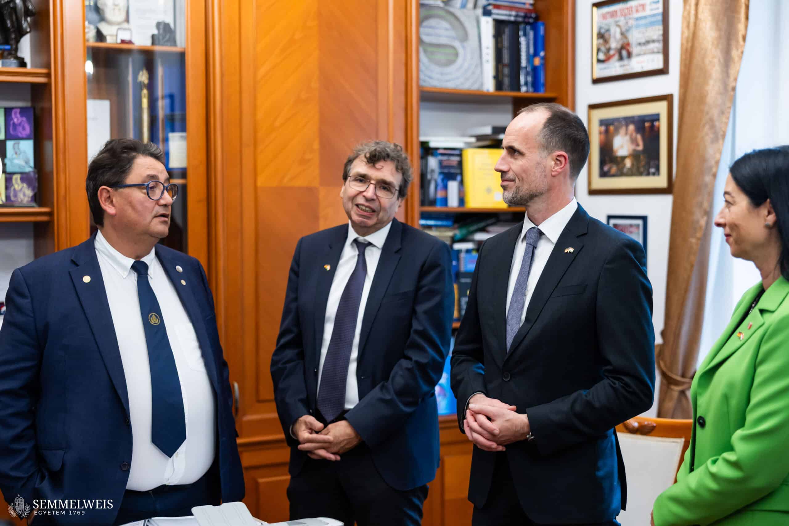 Im Rahmen der zweitägigen Gesprächsreihe empfing Rektor Dr. Béla Merkely die Mitglieder der Delegation, darunter Herrn Clemens Hoch, Staatsminister des Landes Rheinland-Pfalz und Minister für Wissenschaft und Gesundheit des Landes Rheinland-Pfalz, Frau Hannah Herkel, Abteilungsleiterin für Hochschulwesen im Ministerium für Wissenschaft und Gesundheit des Landes Rheinland-Pfalz, Herrn Christian Gölz, Referatsleiter für Hochschulzulassung und Hochschulkapazitätsrecht, sowie Herrn David Freichel, Pressesprecher des Ministeriums.