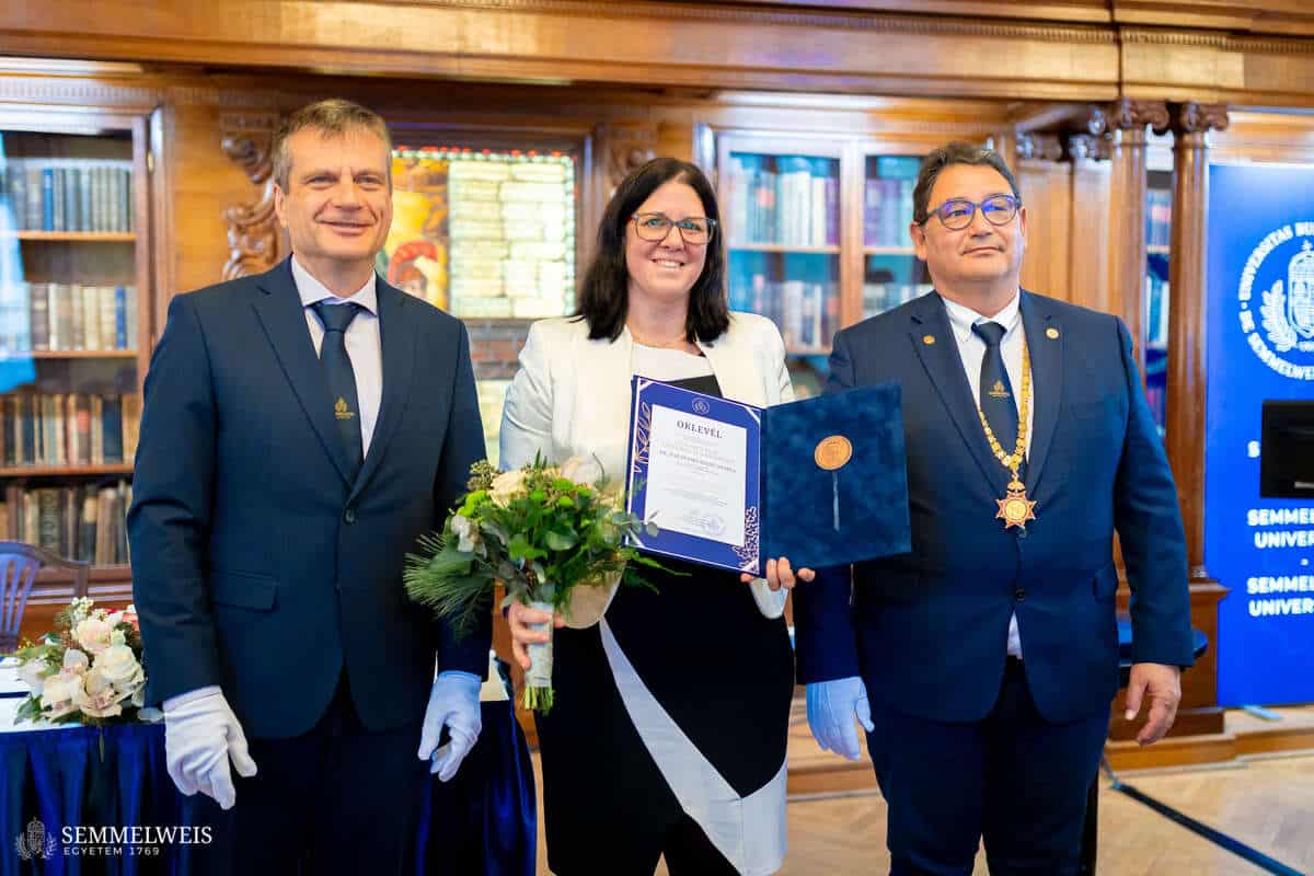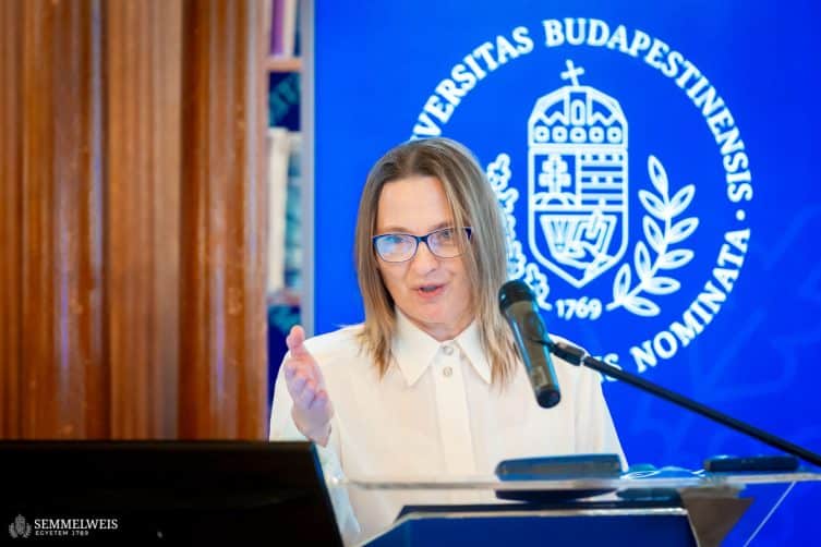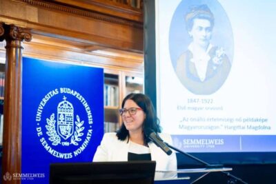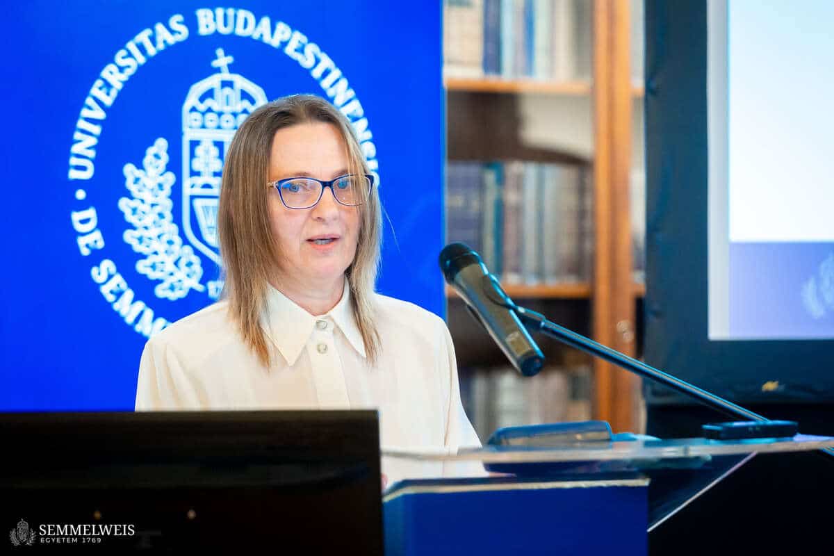 The Hugonnai Vilma Medal, with which the university recognizes the outstanding work of female lecturers, researchers, and healers, was awarded this year to Dr. Angéla Jedlovszky-Hajdú, Associate Professor at Semmelweis University’s Department of Biophysics and Radiation Biology and Head of the Laboratory of Nanochemistry. Throughout her career, she has researched the biomedical applications of biocompatible nanosystems, and her research is groundbreaking in the fields of MRI contrast agents, artificial tissues, wound dressings, and magnetic hyperthermia. In addition, she is passionate about nurturing talent, according to her laudation. In her presentation, Dr. Angéla Jedlovszky-Hajdú said that the goal of their research was to develop nanocomposite fiber systems using nanotechnological methods such as electrostatic fiber formation.