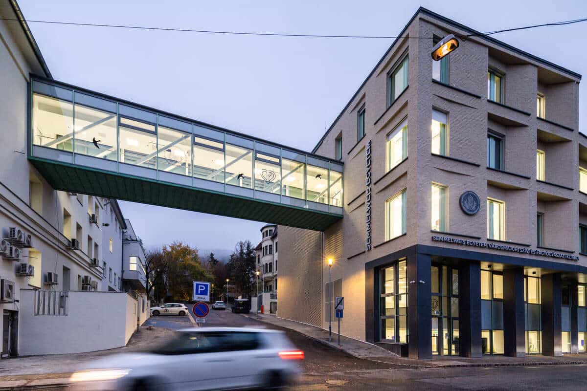 “Today we celebrate the completion of an extraordinary building, which is the result of the dedicated work, patience, and cooperation of many people, and is a good example of how a technical task can become a truly people-oriented mission,” said István Szeivolt, CEO of the contractor Épkar Plc. He shared some telling statistics: The constructions began 16 meters below ground, and nearly 15,000 cubic meters of soil had to be excavated from the plot, which was only 1,000 square meters in size. 1,100 cubic meters of concrete and 120 tons of reinforcing bar were used to construct the foundation slab. The new wing and the main building are connected by a 9-ton steel bridge, which provides a closed, secure passage between the two facilities.