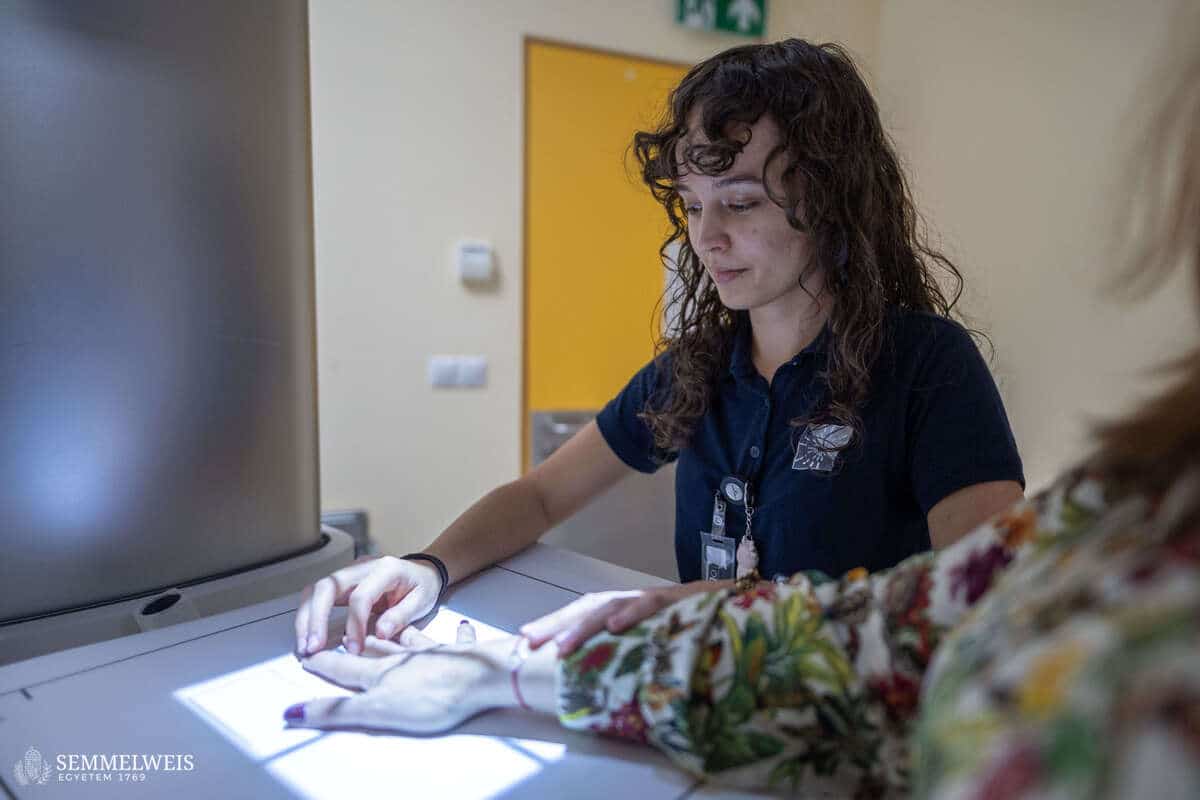When it came to choosing a career path, something drove her even further; she felt that she wanted to delve deeper into healthcare and get even closer to patient care. “I have been interested in emergency medical services for a long time, so I obtained my paramedic qualification, but this was during the COVID pandemic, when we could gain much less practical experience due to the lockdown. However, we had amazing theoretical instructors, and that’s how I fell in love with radiology. I had an epiphany: As an extremely active child and then an athlete, I was somewhat familiar with the world of medical imaging. I had been to the X-ray lab quite a few times and remembered being fascinated by it even back then. That’s how I became a qualified radiology assistant, and since I had already caught the attention of the staff during my internship, I started working at OKK immediately after graduating,” she recalled.