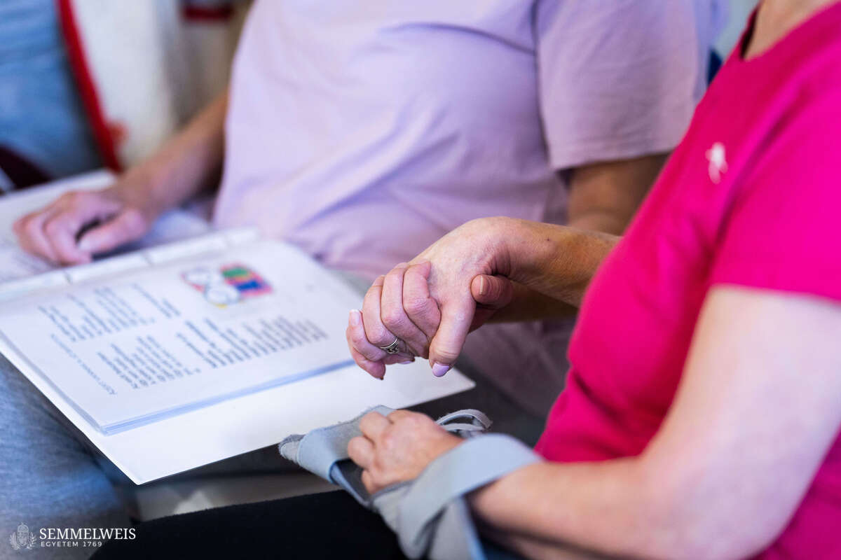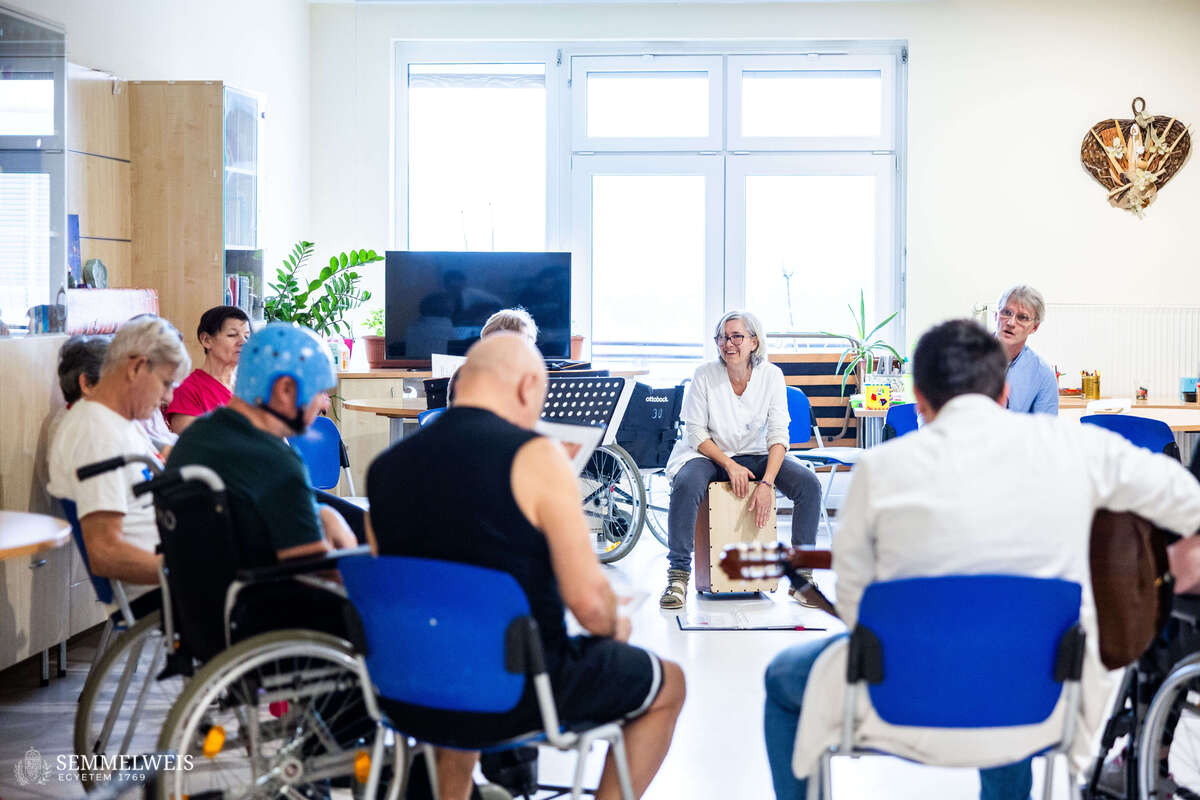“We’d like to ask you to hum the following song with us. If you recognize it and know the lyrics, please don’t say them yet because we’ll be doing some articulation exercises first,” asks Zsófia Fekete, guitar in hand, of those sitting around her. She then turns to the man sitting next to her and asks him to say a vowel. He struggles to produce the requested sound, until Zsolt Cselenák gently guides him to the note E, which he can now hold steadily. Then, turning to the other patients sitting in the circle, he invites them to sing the note E together and tap their feet to the rhythm. Accompanied by Zsófia on guitar, about a dozen patients from the department’s Stroke Rehabilitation Ward clap their hands, stomp their feet, and hum a Hungarian folk song together in the E key.