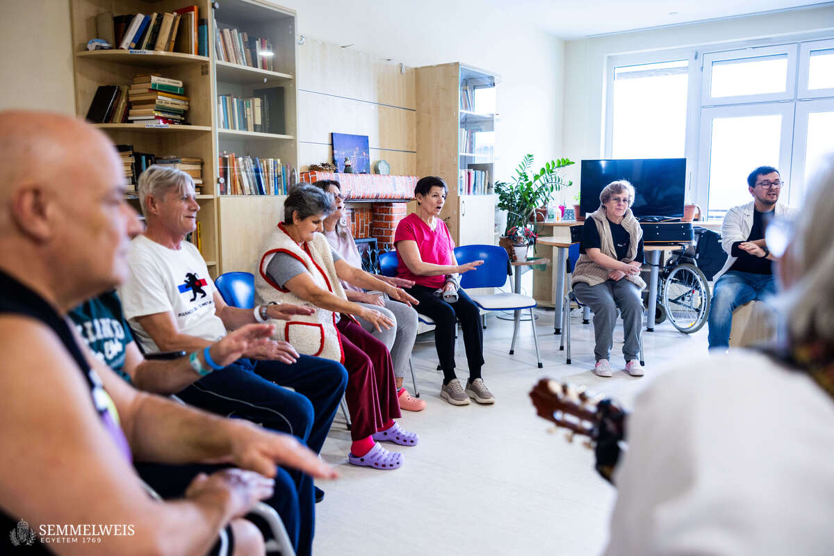 “We’d like to ask you to hum the following song with us. If you recognize it and know the lyrics, please don’t say them yet because we’ll be doing some articulation exercises first,” asks Zsófia Fekete, guitar in hand, of those sitting around her. She then turns to the man sitting next to her and asks him to say a vowel. He struggles to produce the requested sound, until Zsolt Cselenák gently guides him to the note E, which he can now hold steadily. Then, turning to the other patients sitting in the circle, he invites them to sing the note E together and tap their feet to the rhythm. Accompanied by Zsófia on guitar, about a dozen patients from the department’s Stroke Rehabilitation Ward clap their hands, stomp their feet, and hum a Hungarian folk song together in the E key.