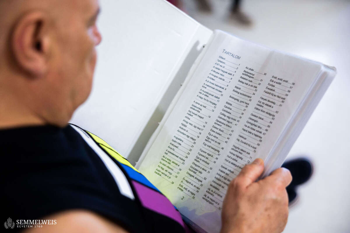 They continue humming the same folk song, but now with a different note provided by another patient, and at Zsolt’s request, they move their arms and legs in a criss-cross pattern. The patients, who are struggling with remaining symptoms and aphasia following their strokes, then take turns trying to say the lines of the song, after which Zsolt leads them in breathing exercises. This is followed by group singing at an accelerating pace, and the sole prop of the music therapy sessions is brought out: Zsófia and Zsolt’s 160-page songbook, compiled over many years of work, which everyone clearly knows well and which offers a wide selection ranging from folk songs to pop hits, so that everyone can find something to their liking.