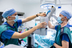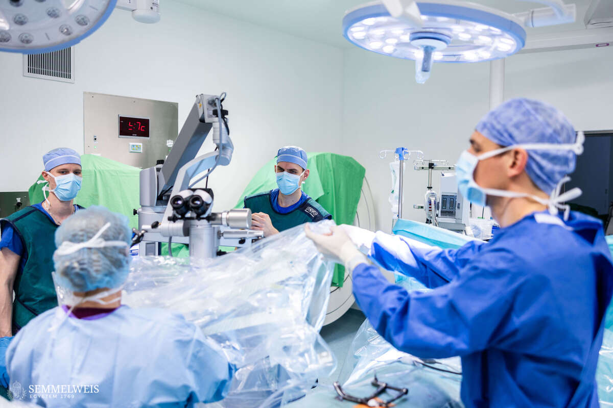 Csongor participates as an operating room assistant in positioning the intraoperative CT (O-arm) to capture a 3D image of the patient suitable for navigation. The O-arm system used at the Department of Traumatology is one of the key technologies in modern, navigation-assisted surgery. Intraoperative CT provides real-time imaging that forms the basis of surgical navigation, which can improve the accuracy of procedures and reduce the need for postoperative corrections. The use of this method is becoming increasingly widespread in spinal surgery and complex trauma care.