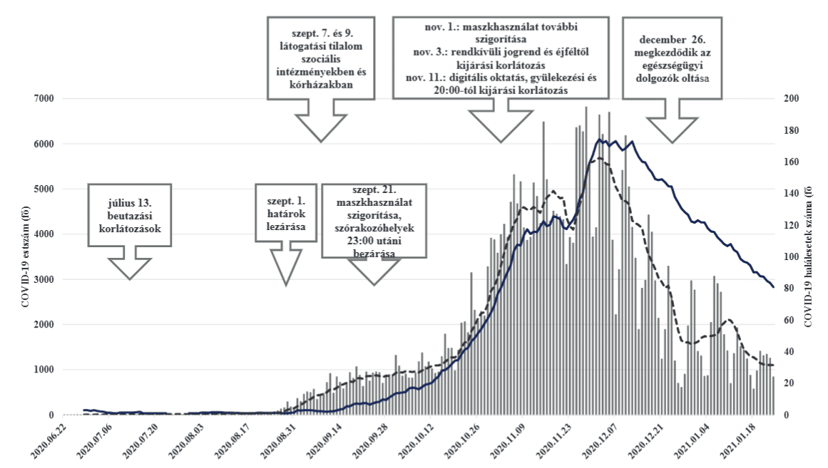 - ábra: Megerősített COVID–19 esetek (a fertőzés igazolásának dátuma alapján) és halálesetek száma (a halálozás ideje alapján), valamint a fontosabb kormányzati intézkedések a 2. járványhullám idején, Magyarország, 2020. június 22. – 2021. január 24.