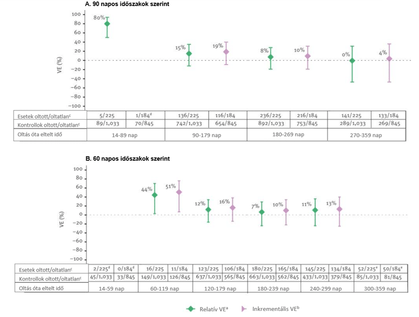 b Az inkrementális védőoltás-eredményességet (iVE) azok között hasonlították össze, akik megkapták az alapimmunizálást és két emlékeztető oltást, melyek közül a második bivalens oltóanyag volt („oltottak”), illetve azok között, akik még > 6 hónappal a bivalens oltási kampány kezdete előtt megkapták az alapimmunizálást és egy monovalens emlékeztető oltást („nem oltottak”). Az, hogy egy oltást bivalensnek vagy monovalensnek tekintettek, attól függött, hogy mikortól kezdték alkalmazni a bivalens oltásokat az adott országban.