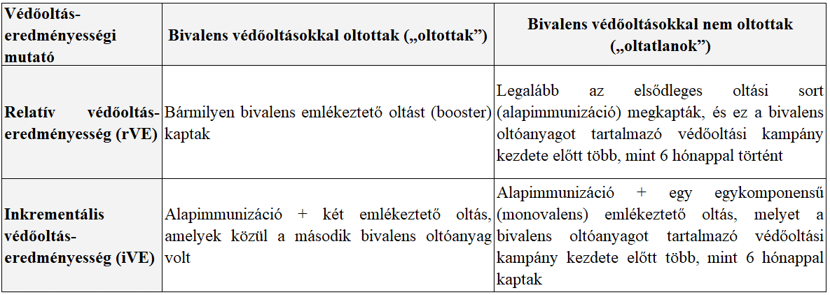 a A relatív védőoltás-eredményességet (rVE) azok között hasonlították össze, akik bivalens emlékeztető oltást kaptak („oltottak”), és azok között, akik nem kaptak bivalens oltást, de korábban legalább az elsődleges oltási sort (alapimmunizálás) még > 6 hónappal a bivalens oltási kampány kezdete előtt megkapták („nem oltottak”). Az, hogy egy oltást bivalensnek vagy monovalensnek (egykomponensűnek) tekintettek, attól függött, hogy mikortól kezdték alkalmazni a bivalens oltásokat az adott országban.