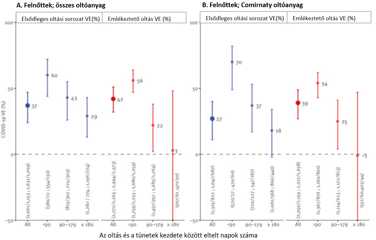 Felnőttek körében az elsődleges oltási sorozat védőoltás-eredményessége (VE) átlagosan 37% volt, míg az emlékeztető oltások VE-e 42%. Az oltás óta eltelt idő függvényében a VE eredmények az 1. ábra értékei szerint alakultak.