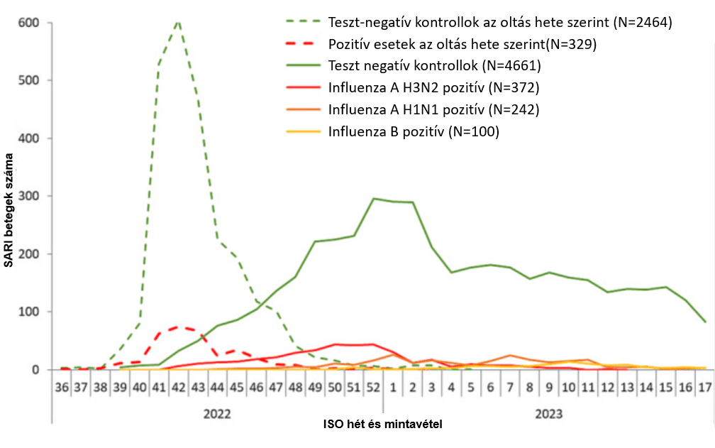 - ábra: A súlyos akut légúti megbetegedésben (SARI) érintett betegek száma az eseti státusz szerint és az oltás vagy mintavétel hete szerint, VEBIS kórházi vizsgálat, 2022/2023-as influenzaszezon, Európa (N = 5547)