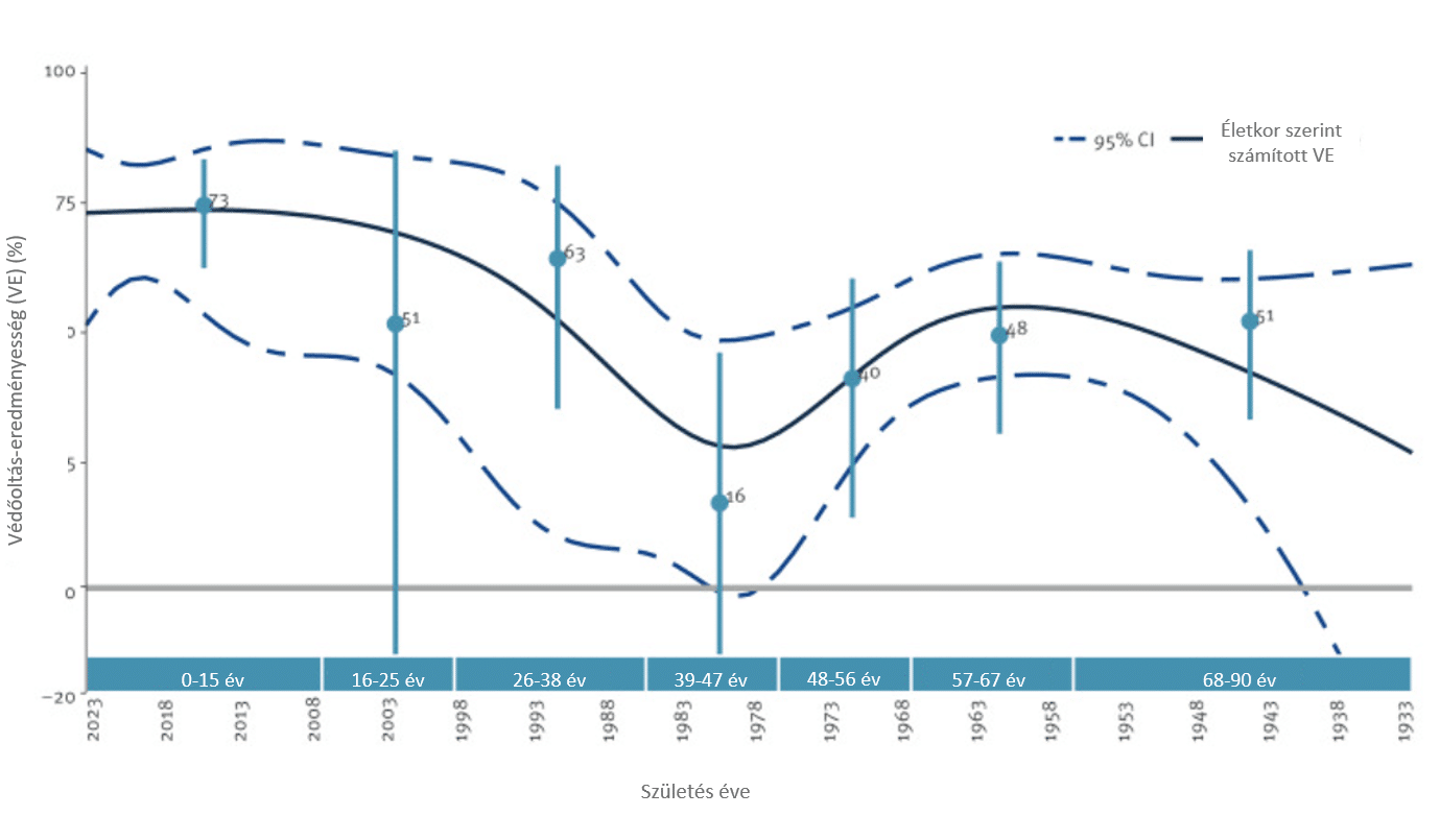 - ábra: Az influenza A(H1N1)pdm09 elleni oltóanyagok eredményessége születési kohorsz / életkor szerint, a VEBIS multicentrikus, háziorvosi vizsgálat eredményei alapján, 2023. szeptember – 2024. június (n = 29 959)