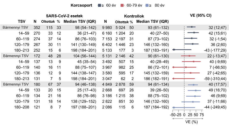CI: konfidencia intervallum; IQR: interkvartilis tartomány; TSV: az oltás óta eltelt idő (napok száma az utolsó Covid-19 dózistól az első tünet megjelenéséig); VE: védőoltás-eredményesség; szürke jelölés: bármennyi idő az oltás óta.