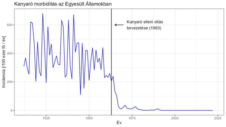- A kanyaró esete is jól példázza ezt: a védőoltás bevezetése előtt a fejlett országokban, hazánkban is, szinte kivétel nélkül minden gyermek átesett a betegségen évszázadokon keresztül, noha az ivóvízhez való hozzáférés, a lakhatási és táplálkozási viszonyok folyamatosan javultak. A jellegzetes, pár évente jelentkező kanyarójárványokat semmilyen higiénés fejlődés nem szüntette meg, sem a lakhatási, táplálkozási, csatornázási változások nem befolyásolták lényegesen. A széleskörű oltási programok bevezetése után azonban az új megbetegedések száma nagyságrendekkel esett vissza. Érdemes megnézni az Egyesült Államok adatait [2] a példa kedvéért, ahol hosszú időre visszamenő, jó minőségű adatsor érhető el:
