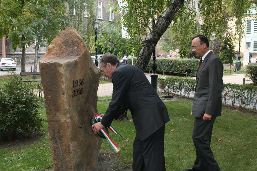 Dr. Tulassay Tivadar és dr. Szabolcs István koszorút helyeznek el az emlékkőnél.