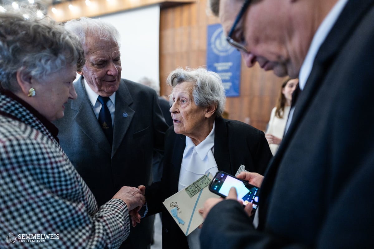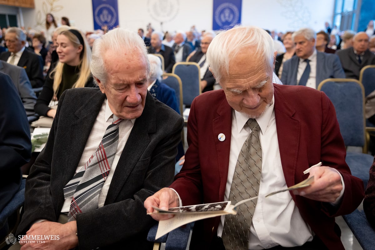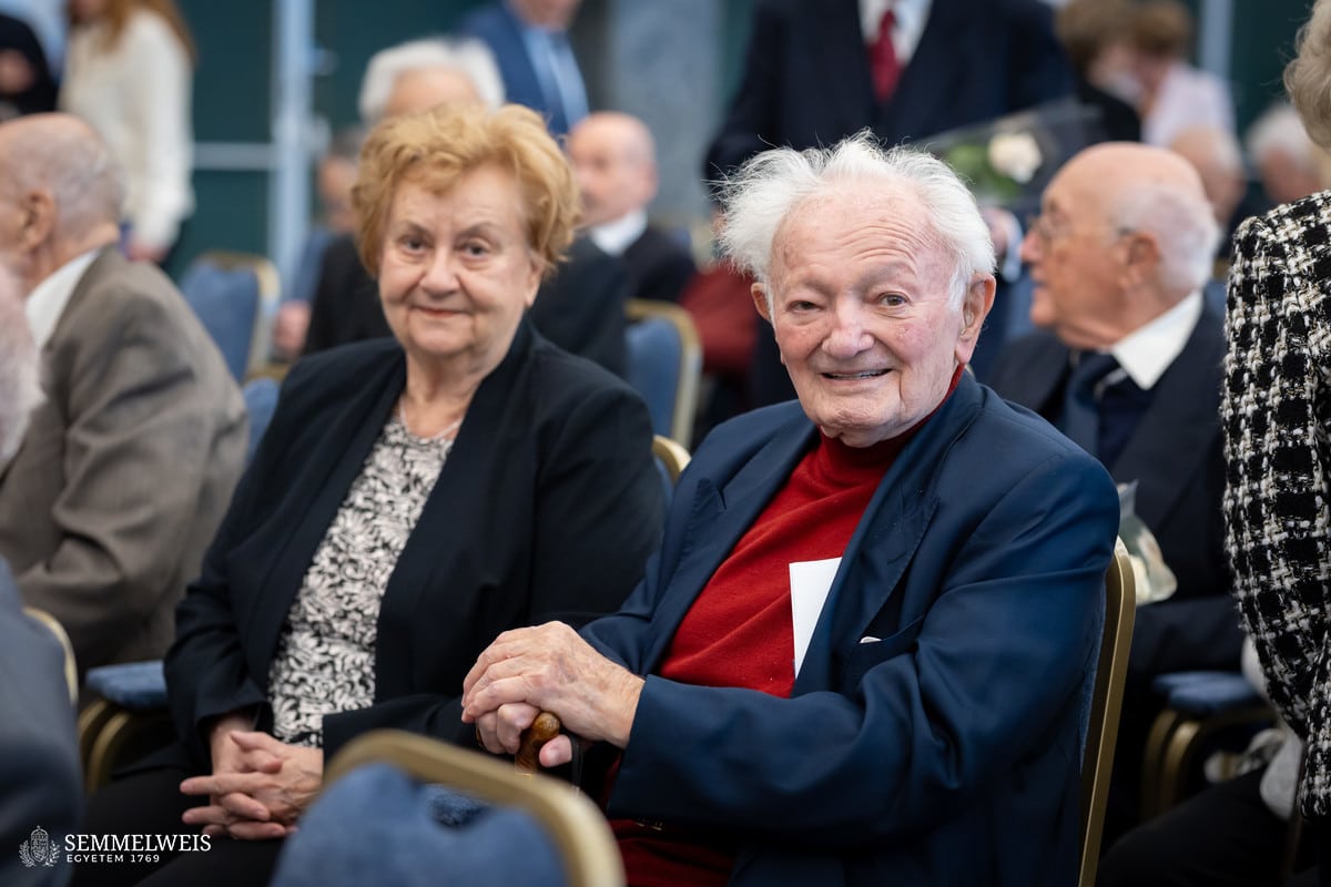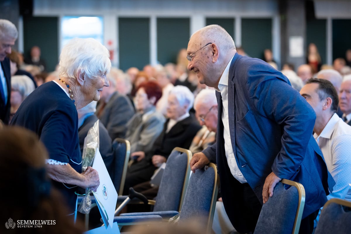 A filmvetítést követően dr. Merkely Béla rektor és dr. Nyirády Péter dékán átadták a díszokleveleket: összesen három platina, hat rubin, 45 vas, 75 gyémánt és 179 arany oklevet adományoztak idén a jubilánsoknak.