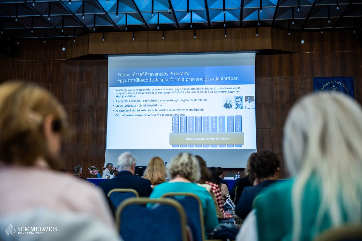 Dr. Ungváry Zoltán, a Megelőző Orvostani és Népegészségtani Intézet vezetője beszámolt a Semmelweis Egyetem azon törekvéseiről, hogy a hamarosan megalakuló Fodor József Módszertani Központjával hozzájáruljon az egészséges öregedés kutatásához, valamint az élettartam meghosszabbítása mellett az egészségben töltött évek számának növeléséhez is a kidolgozandó új prevenciós módszertani gyakorlatokkal. A központ első lépésként az egyetemen működő különféle tudásbázisok és klinikai szereplők számára adna lehetőséget az interdiszciplináris együttműködésre: az alapkutatástól a klinikai kutatáson át, transzlációs kutatáson, epidemiológián és a megelőző orvostanon át az egészségfejlesztésig az egész spektrumot lefedve a megfelelő népegészségügyi megoldások kidolgozása érdekében.