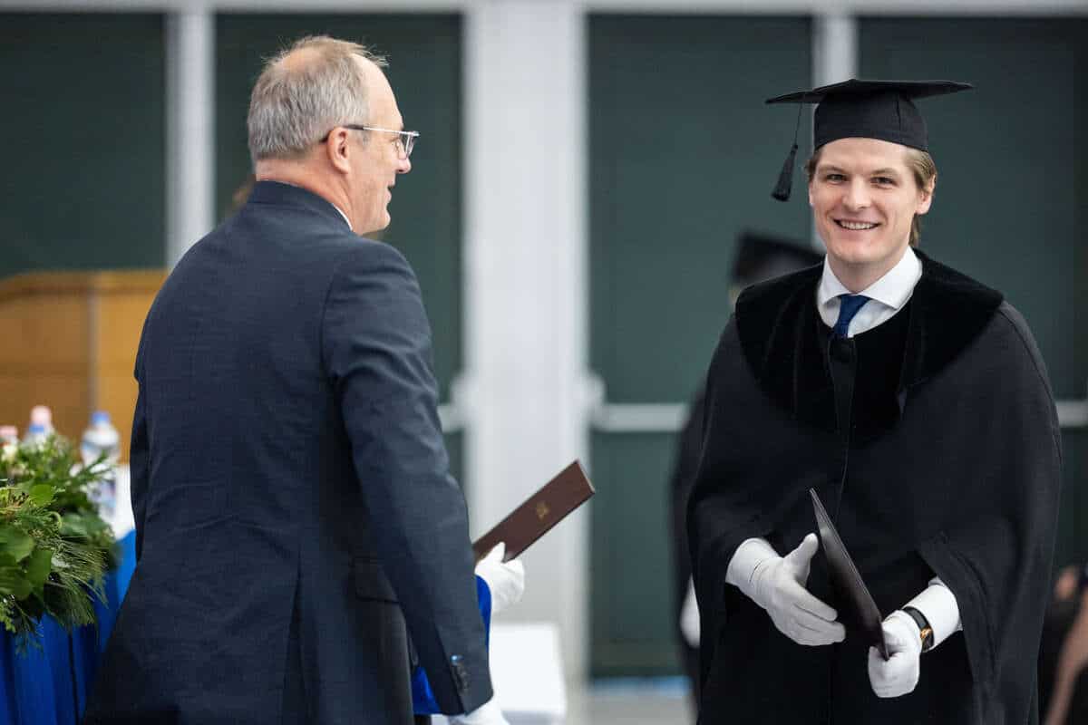 A frissdiplomások nevében először dr. Beöthe Tamás Zoltán mondott beszédet. Ebben kiemelte, hogy hallgatótársai eltérő háttérrel, sokfelől érkeztek, de az oktatóiknak sikerült belőlük közösséget kovácsolni. Visszaemlékezett a legemlékezetesebb momentumokra, meghatározó gyakorlatokra és projektmunkákra is. „Az EMK-ban nem csak alma matert és tanácsadókat kaptunk, észrevettük, hogy valójában társakat is a munkához” – hívta fel a figyelmet.