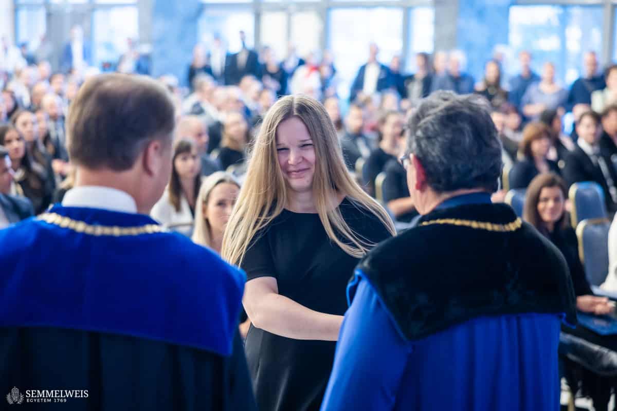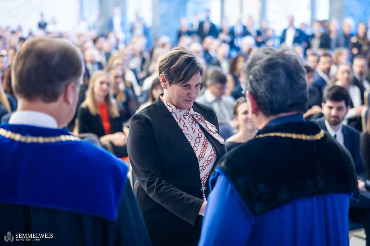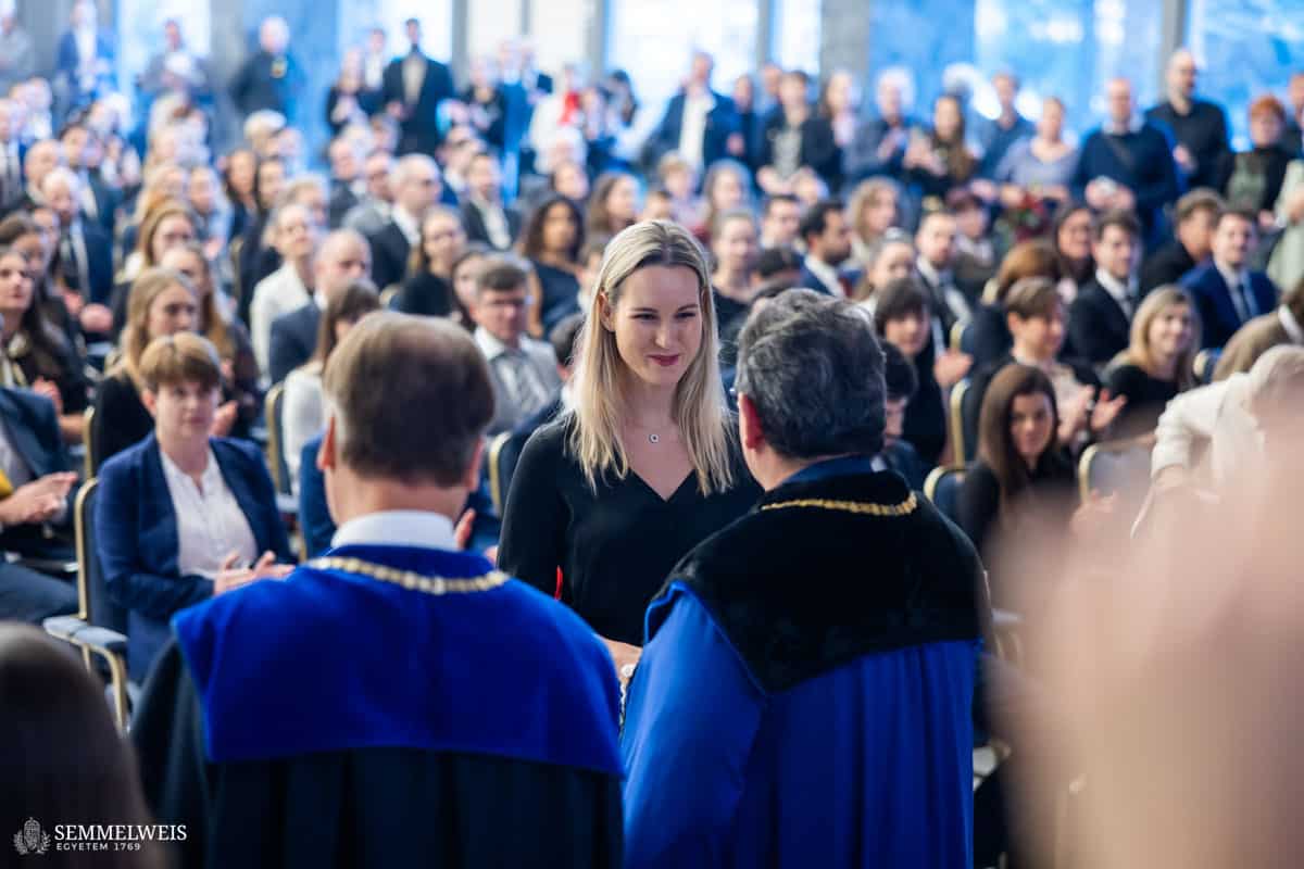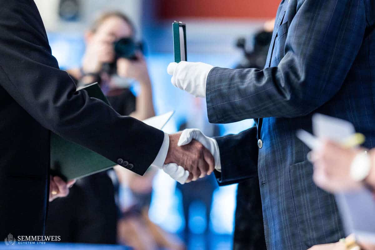 – mondta az ünnepségen dr. Benyó Zoltán, a Doktori Tanács elnöke. A magyar és a nemzetközi képzésben résztvevő, a képzésüket sikeresen teljesítő doktorjelöltek eskütétele után dr. Merkely Béla és dr. Benyó Zoltán kézfogásukkal PhD-fokozatú doktorrá avatta a jelölteket.