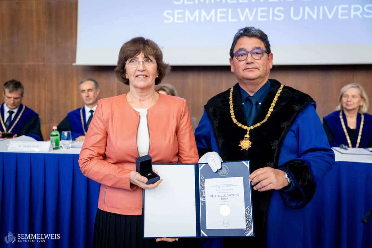 Arany pecsétgyűrű kitüntetéssel ismerték el dr. Perczel-Forintos Dóra, a Semmelweis Egyetem Klinikai Pszichológia Tanszék egyetemi tanárának, korábbi vezetőjének munkásságát. Az elismerést dr. Merkely Béla rektor adta át.
