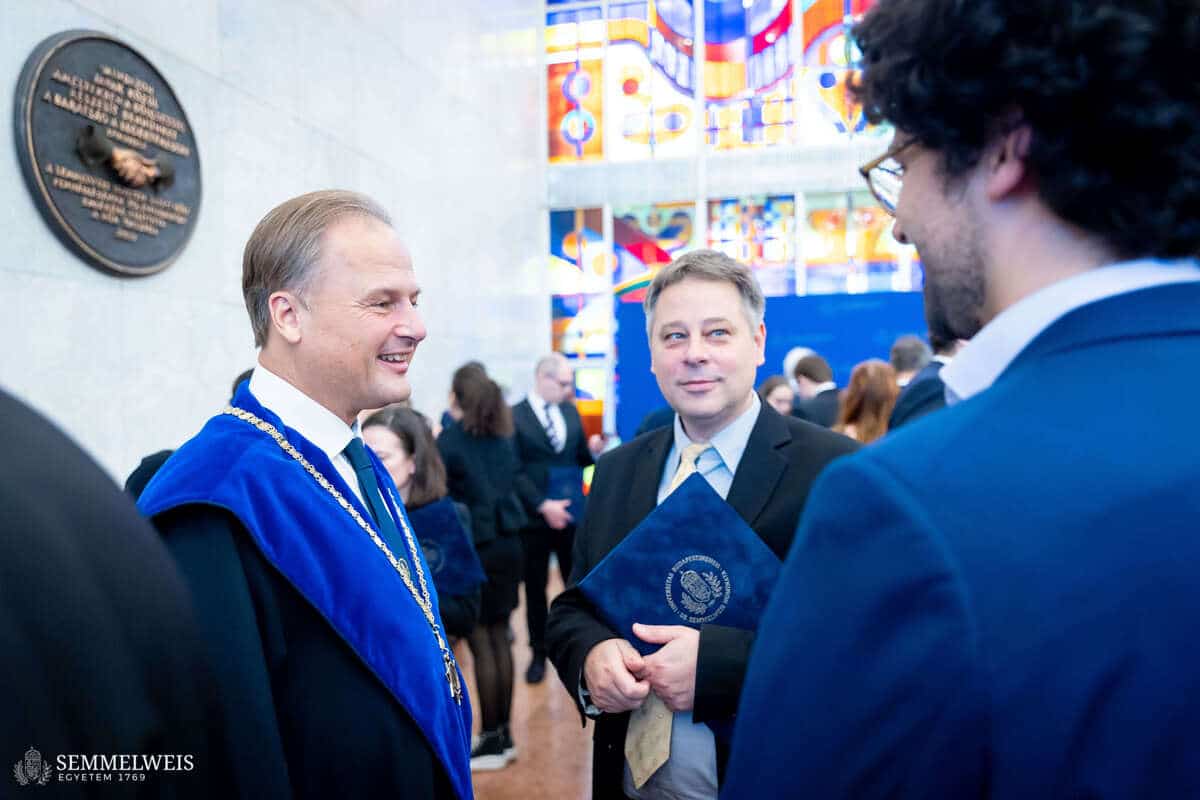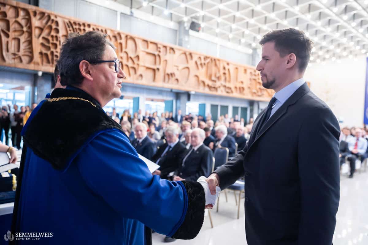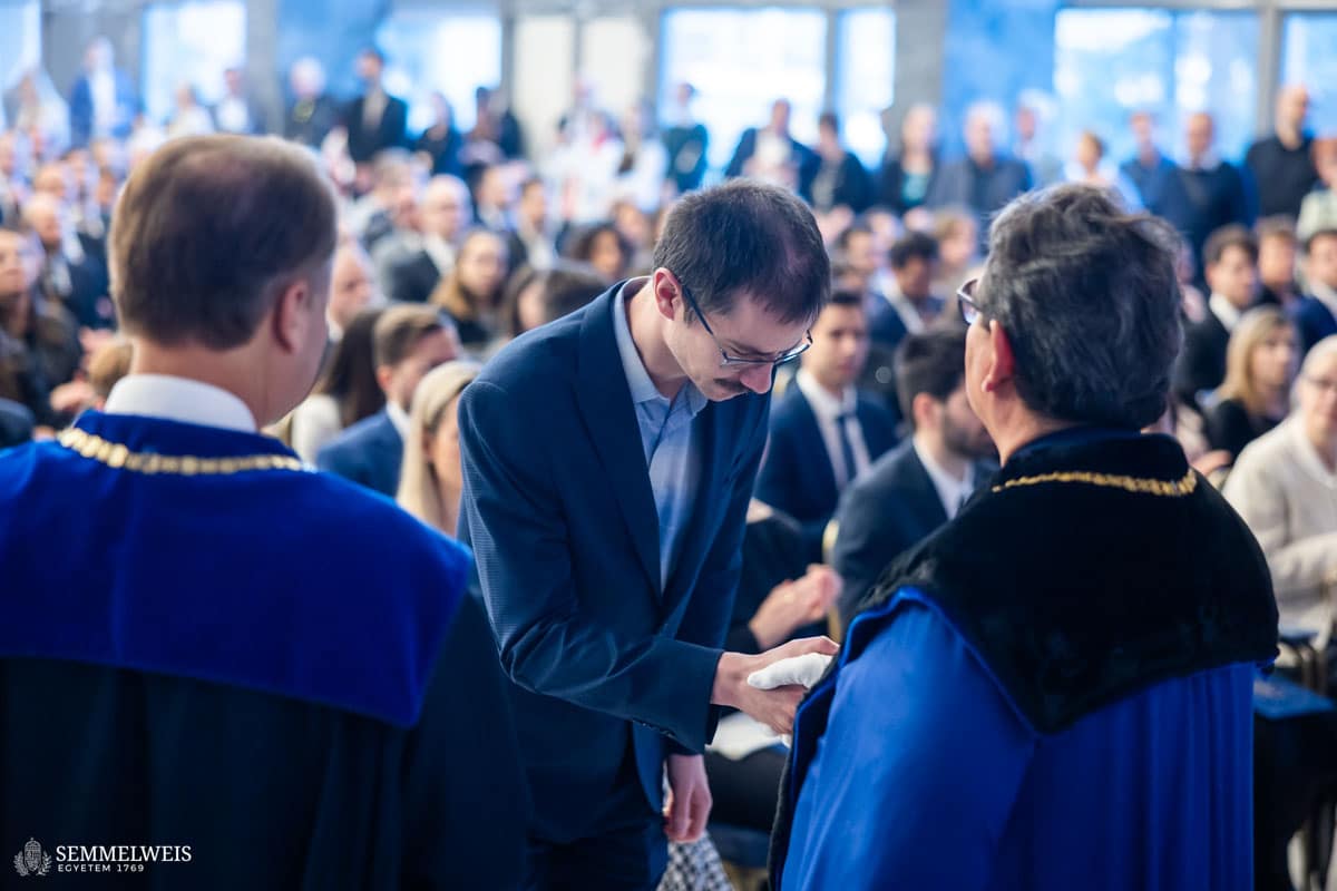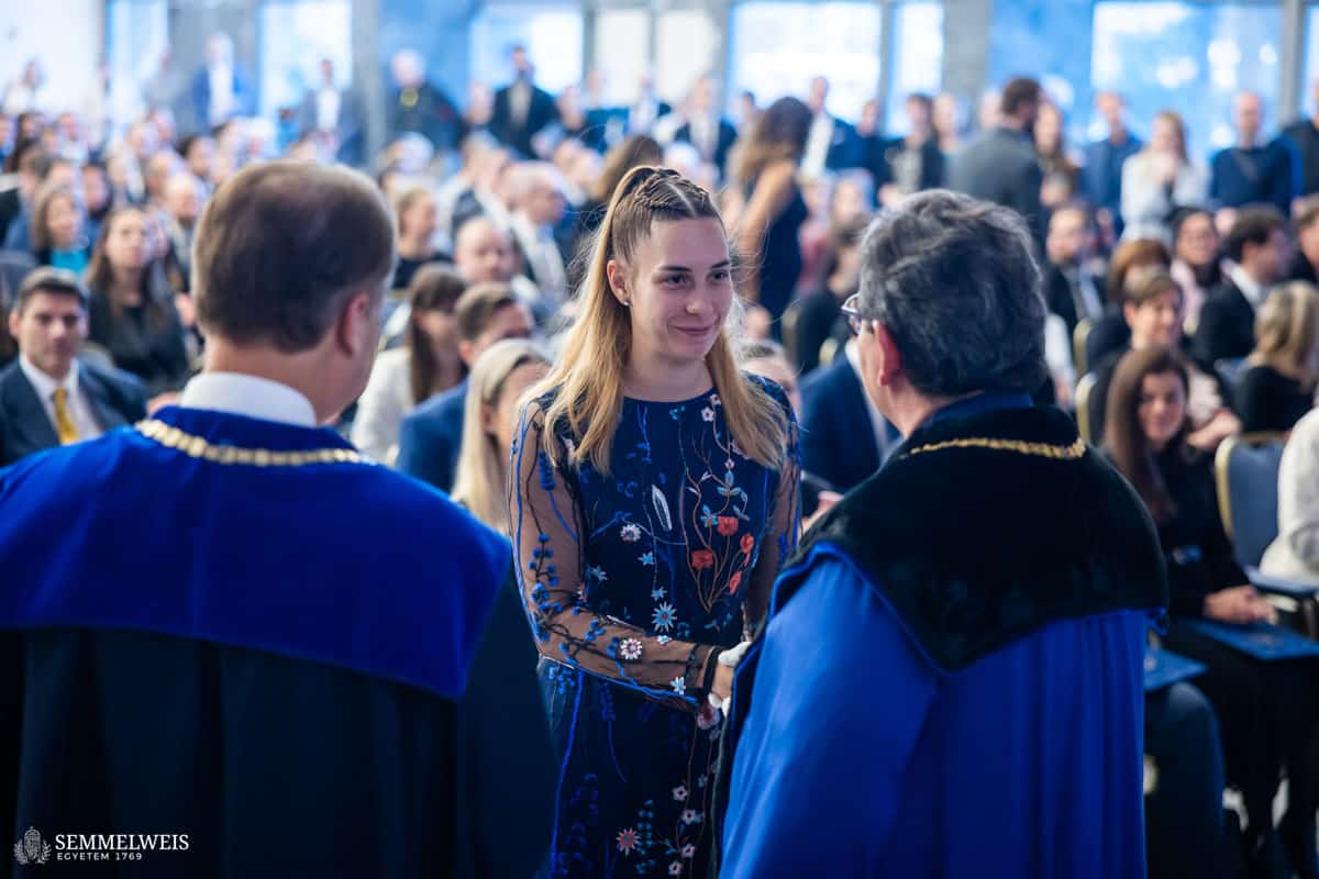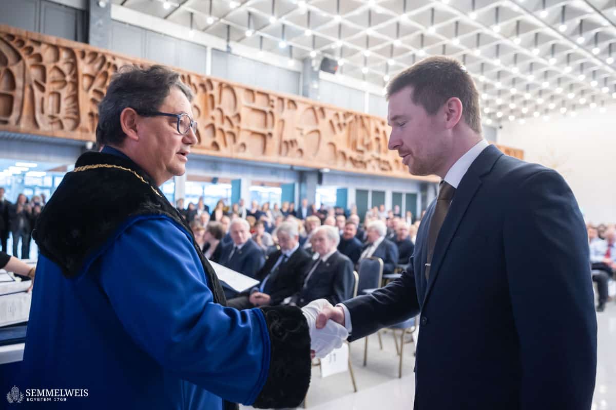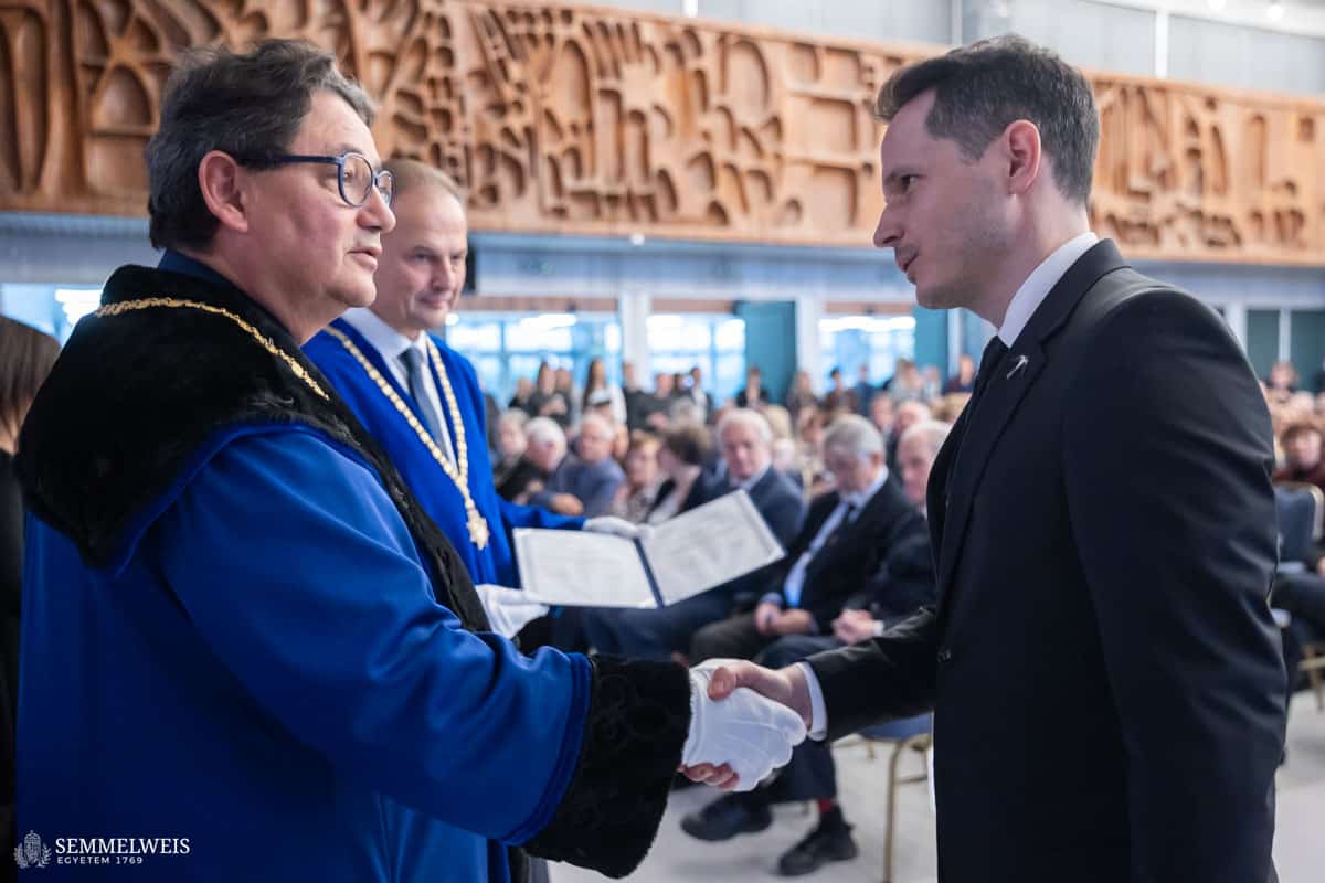 – mondta az ünnepségen dr. Benyó Zoltán, a Doktori Tanács elnöke. A magyar és a nemzetközi képzésben résztvevő, a képzésüket sikeresen teljesítő doktorjelöltek eskütétele után dr. Merkely Béla és dr. Benyó Zoltán kézfogásukkal PhD-fokozatú doktorrá avatta a jelölteket.
