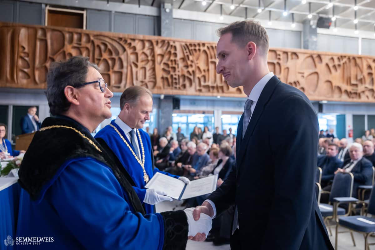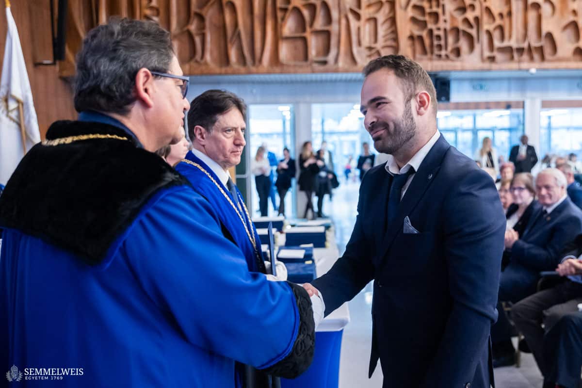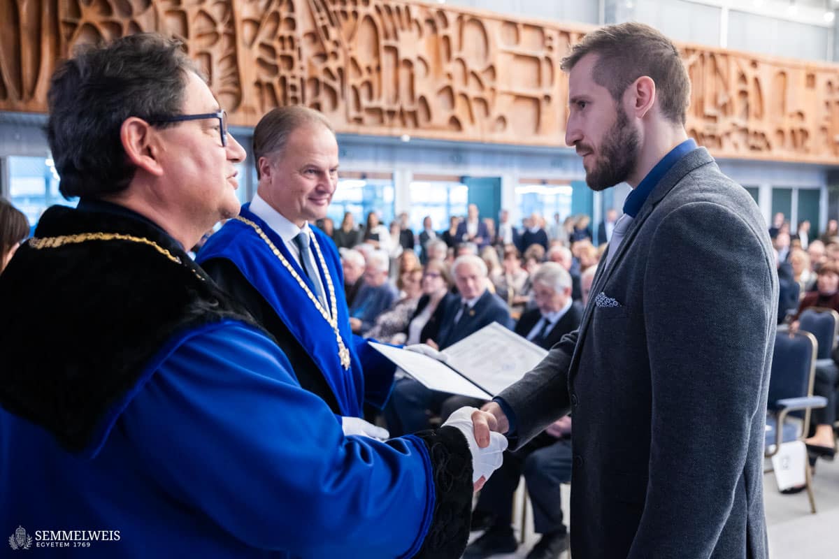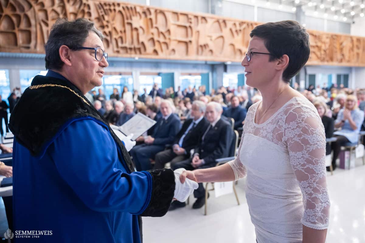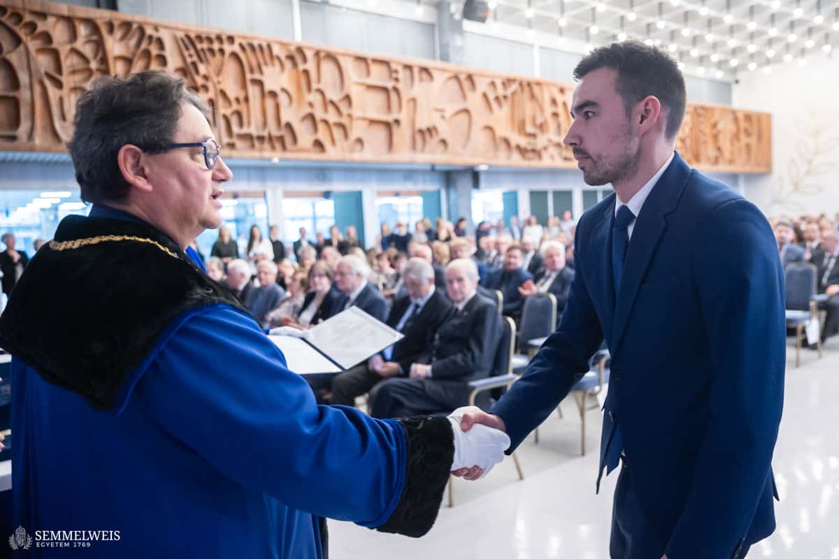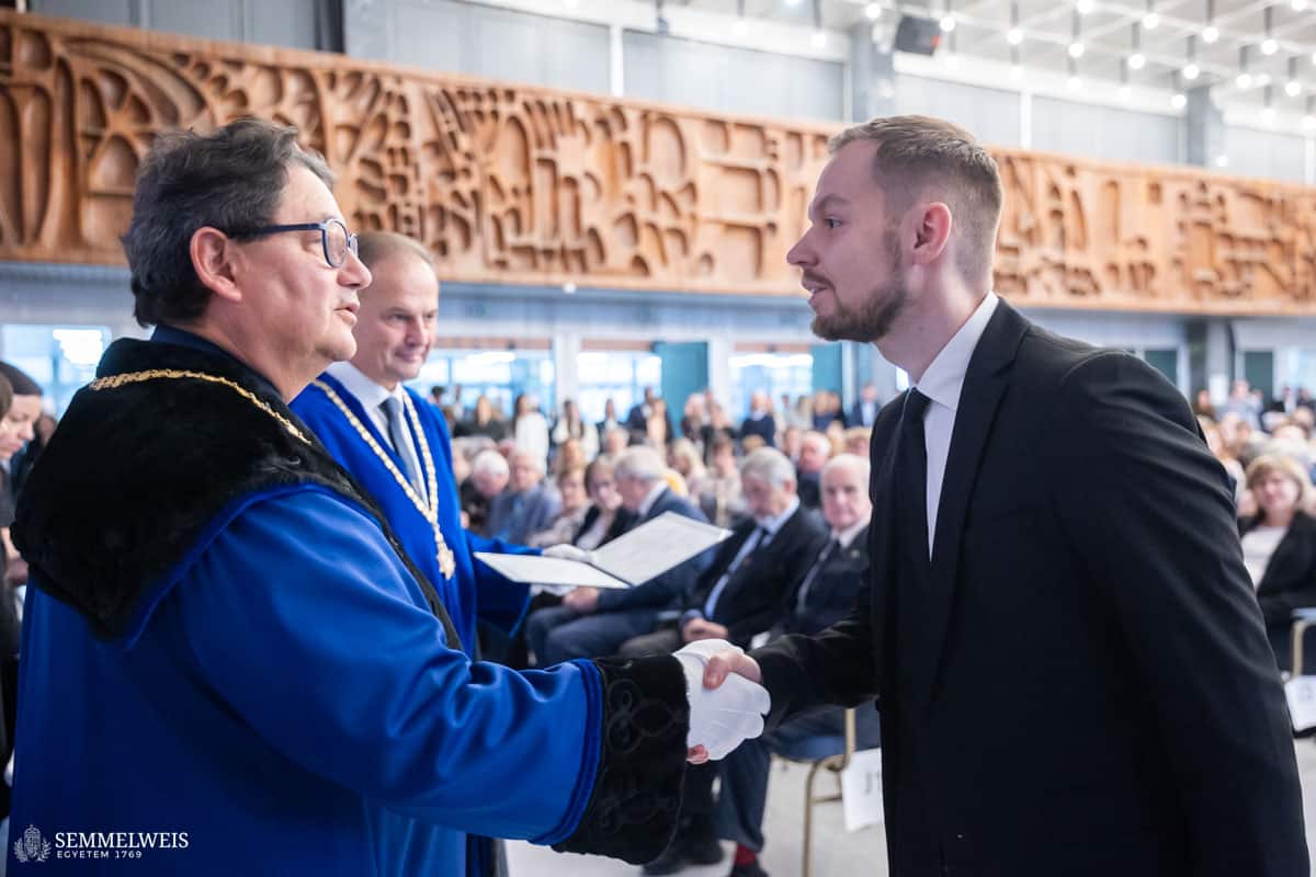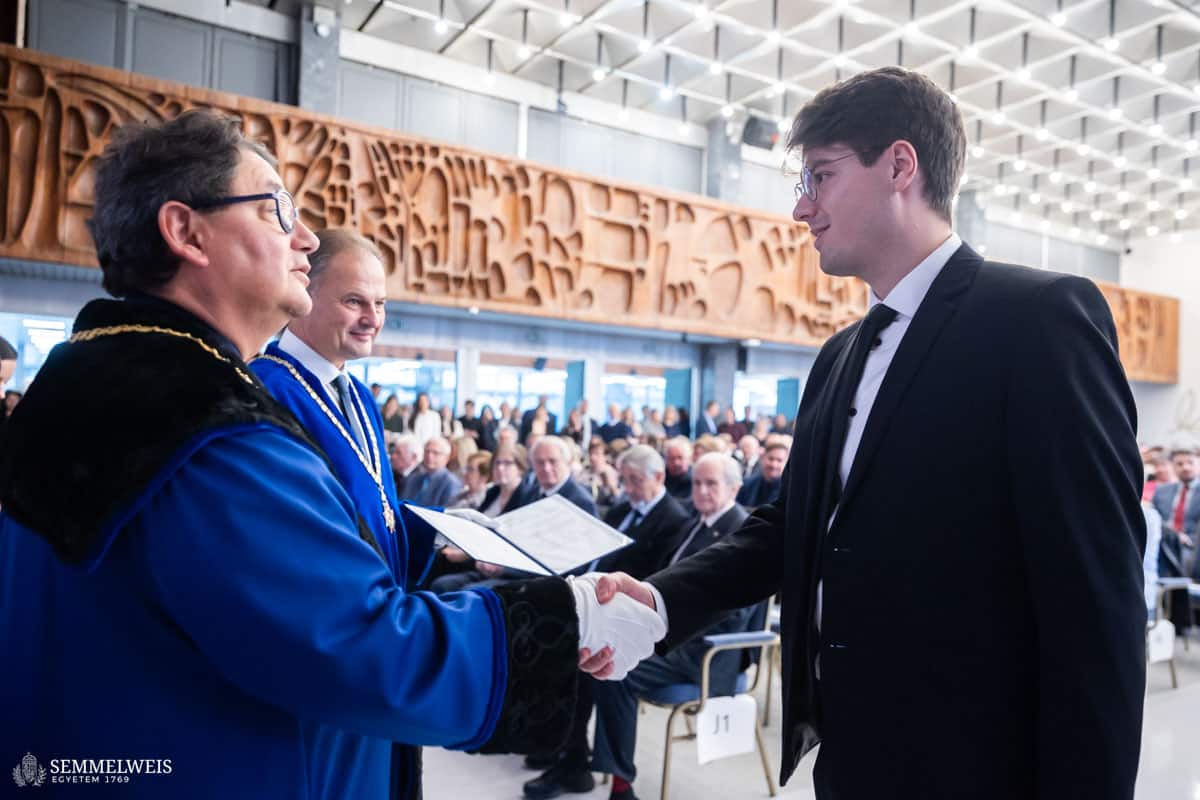 – mondta az ünnepségen dr. Benyó Zoltán, a Doktori Tanács elnöke. A magyar és a nemzetközi képzésben résztvevő, a képzésüket sikeresen teljesítő doktorjelöltek eskütétele után dr. Merkely Béla és dr. Benyó Zoltán kézfogásukkal PhD-fokozatú doktorrá avatta a jelölteket.