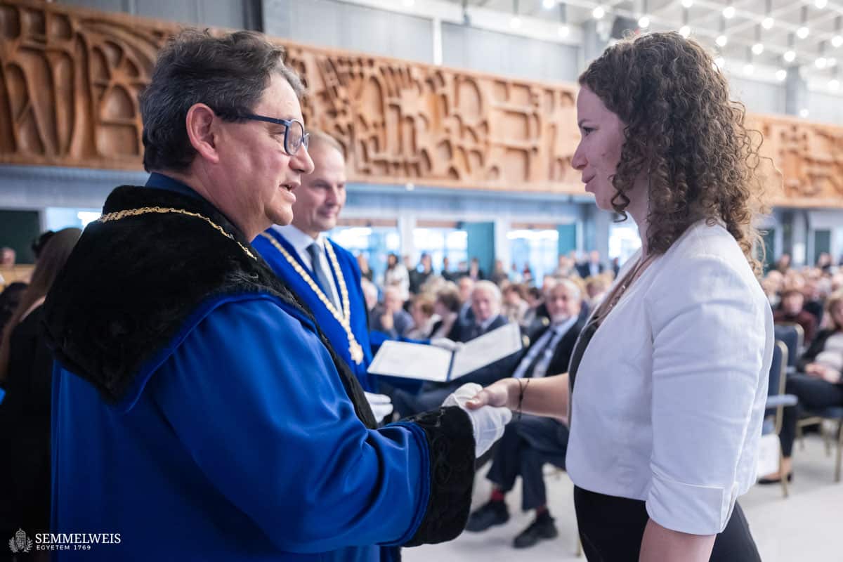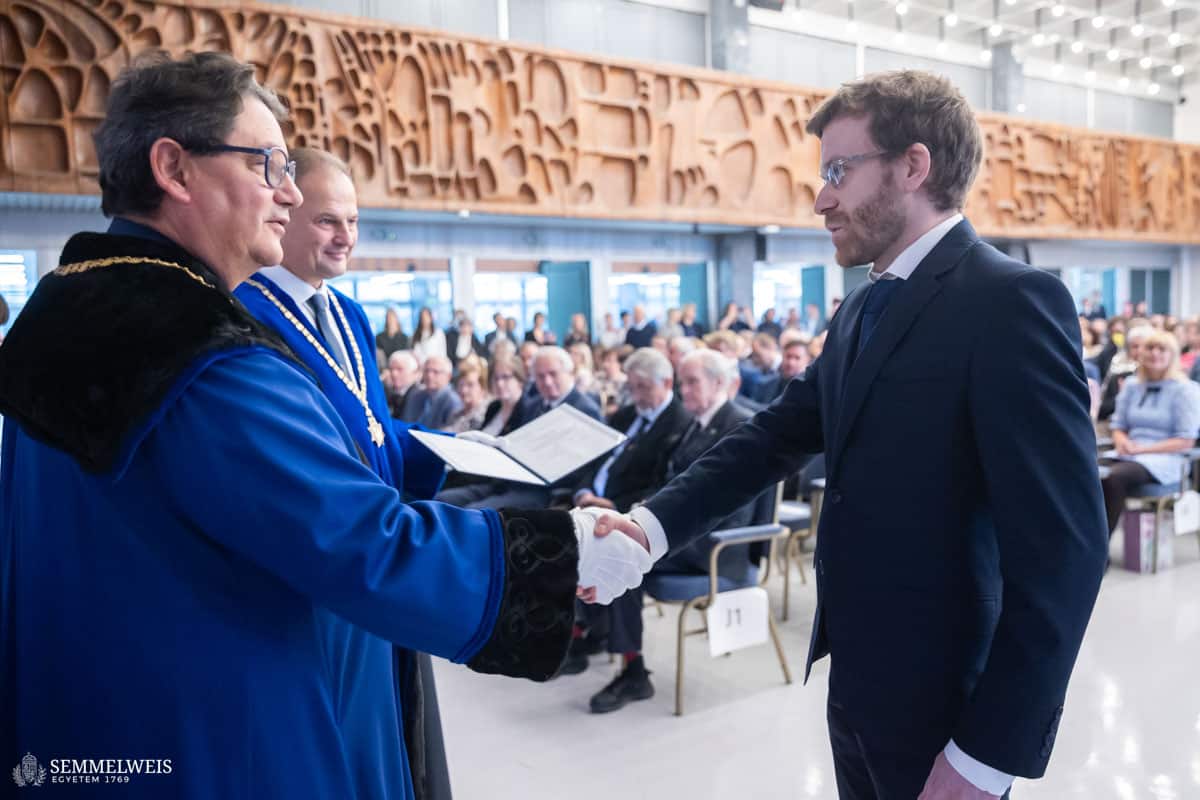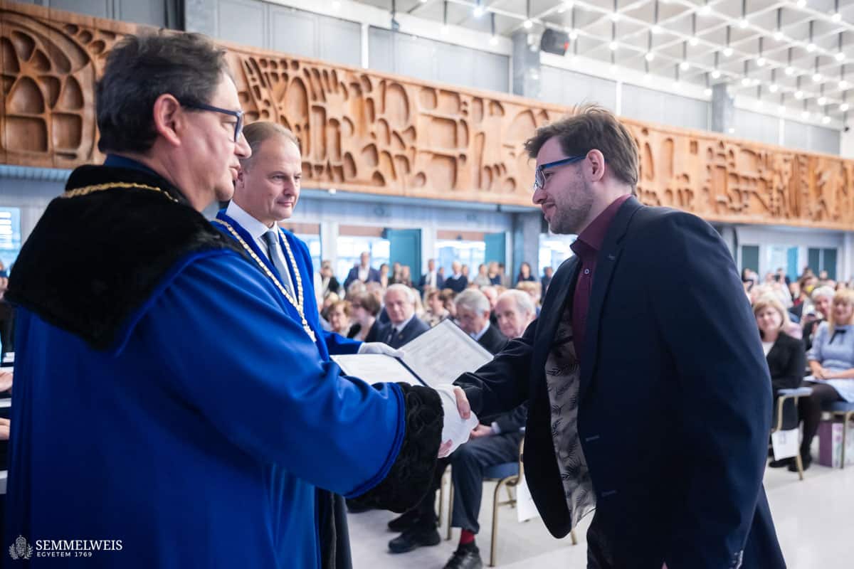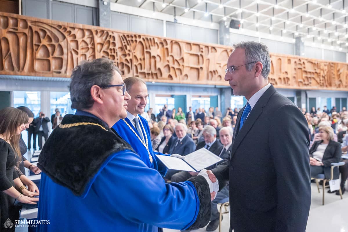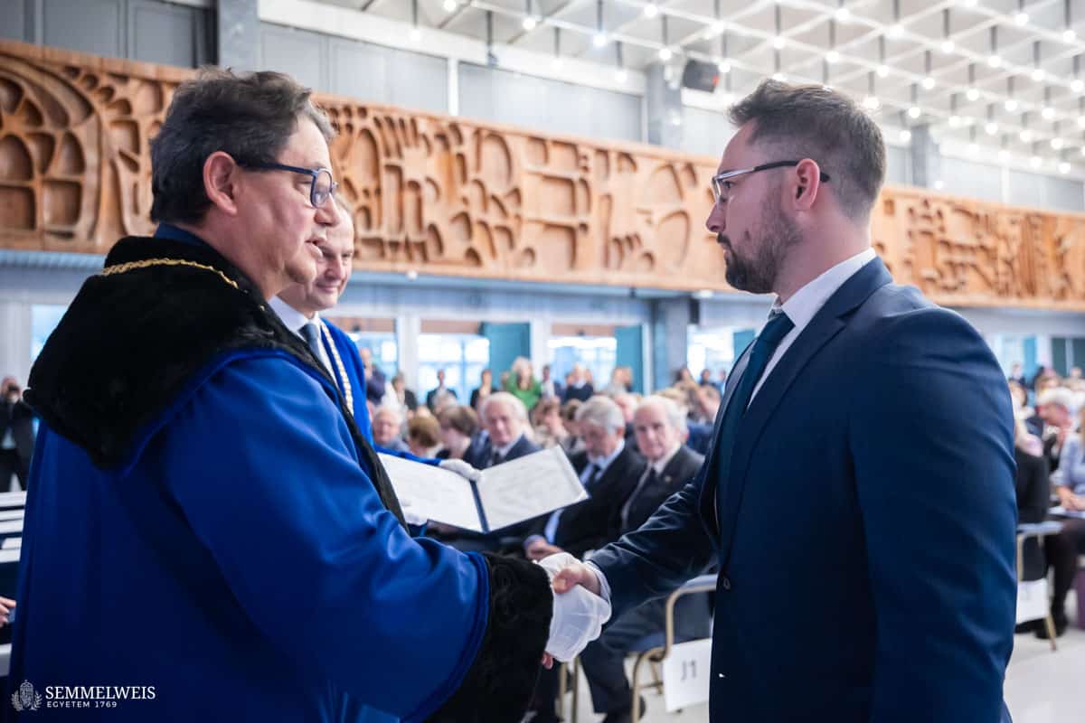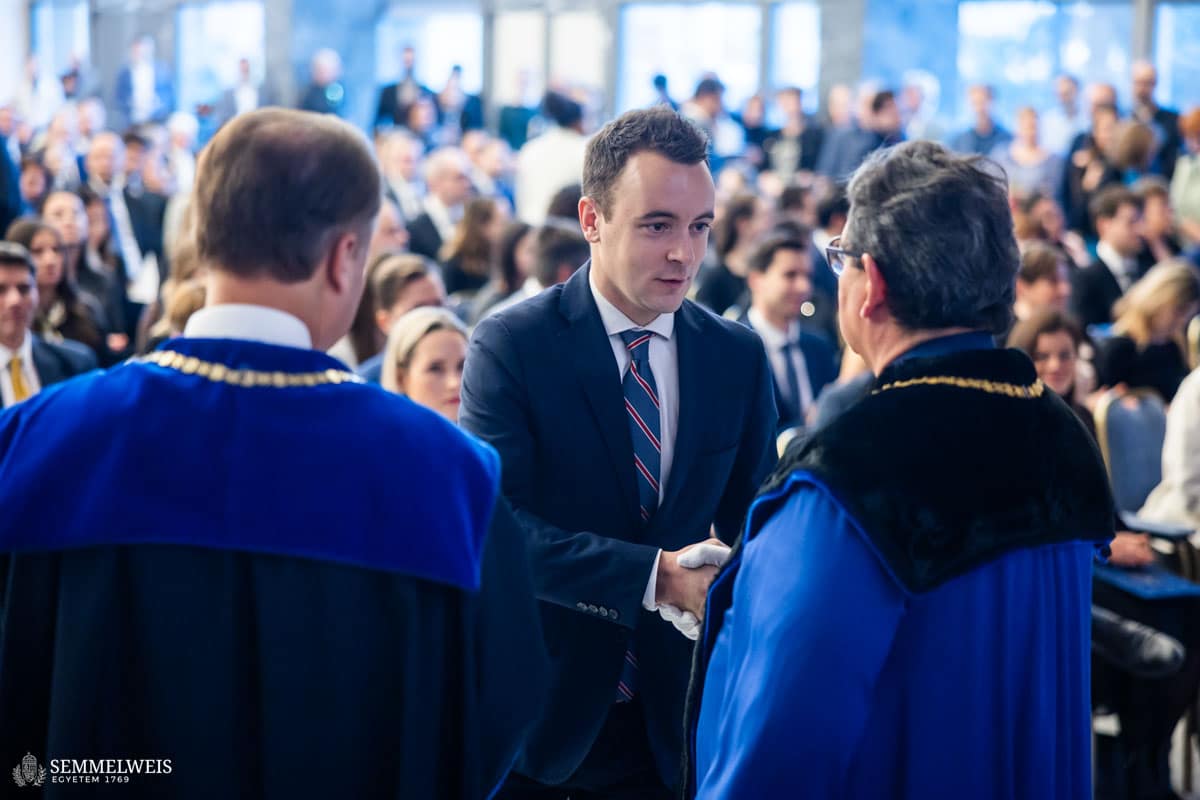 – mondta az ünnepségen dr. Benyó Zoltán, a Doktori Tanács elnöke. A magyar és a nemzetközi képzésben résztvevő, a képzésüket sikeresen teljesítő doktorjelöltek eskütétele után dr. Merkely Béla és dr. Benyó Zoltán kézfogásukkal PhD-fokozatú doktorrá avatta a jelölteket.