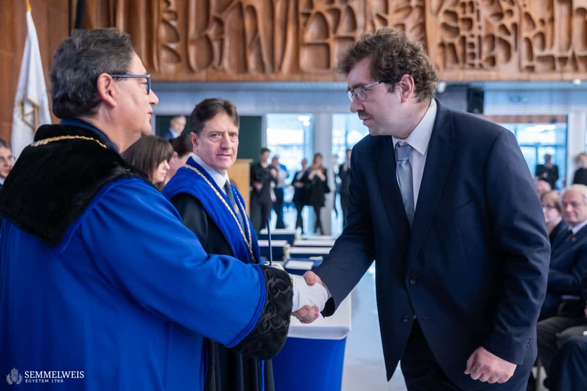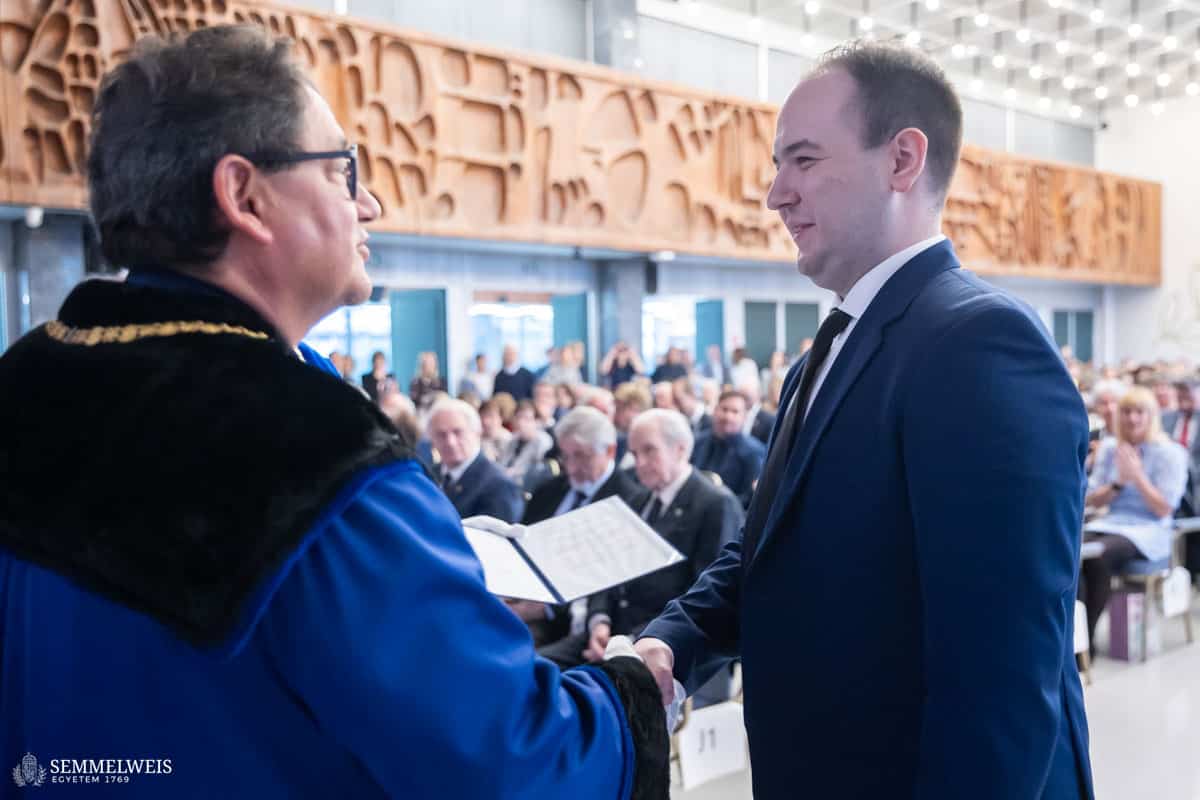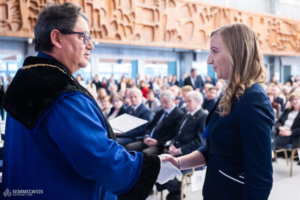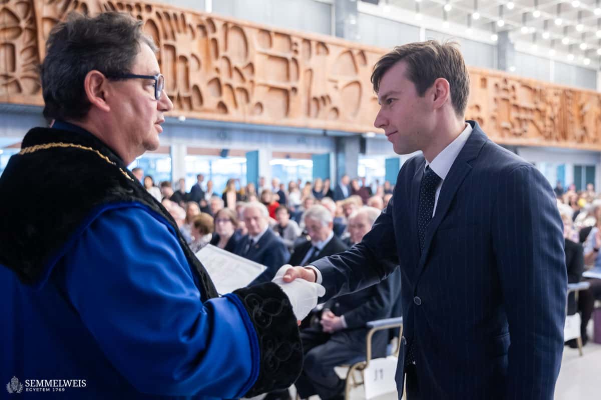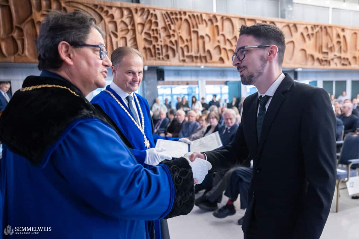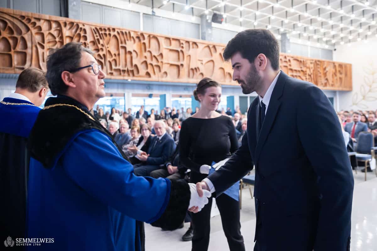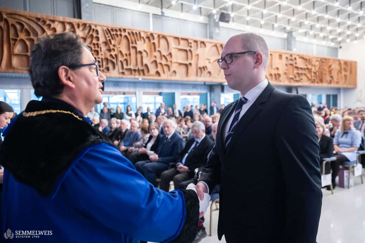 – mondta az ünnepségen dr. Benyó Zoltán, a Doktori Tanács elnöke. A magyar és a nemzetközi képzésben résztvevő, a képzésüket sikeresen teljesítő doktorjelöltek eskütétele után dr. Merkely Béla és dr. Benyó Zoltán kézfogásukkal PhD-fokozatú doktorrá avatta a jelölteket.