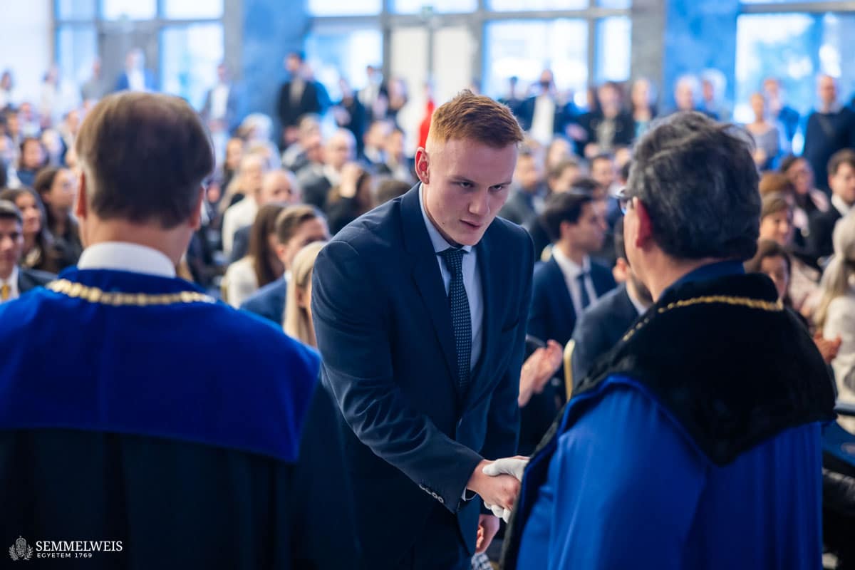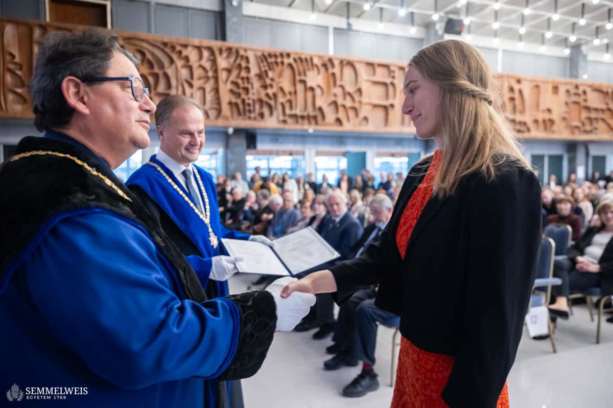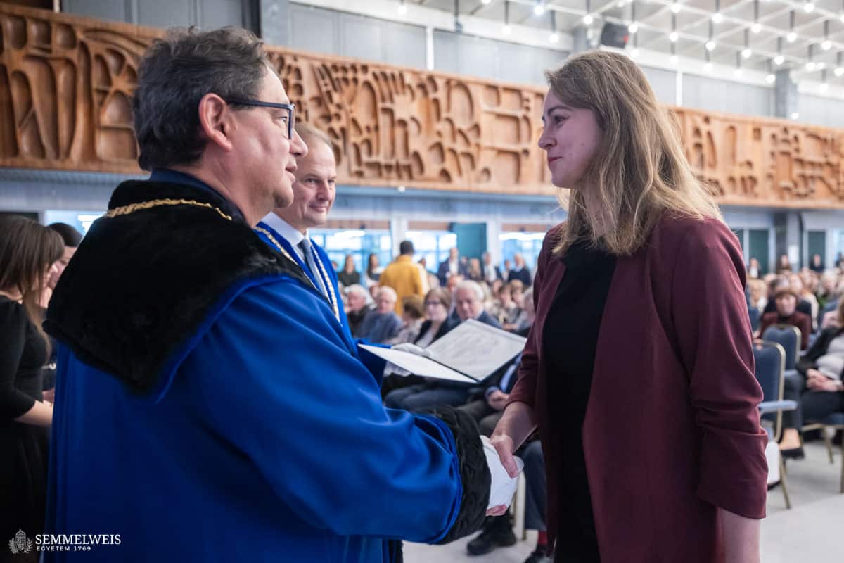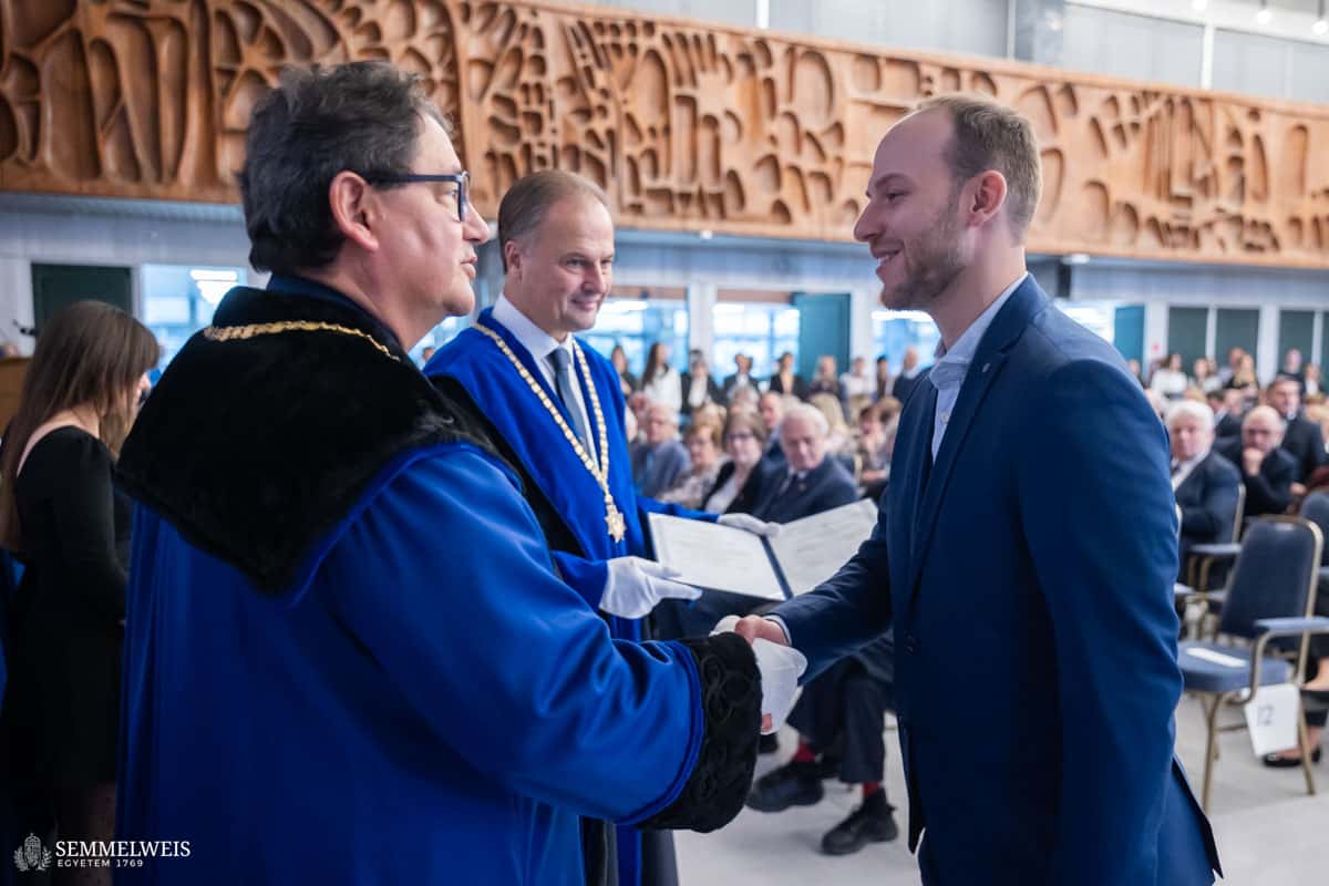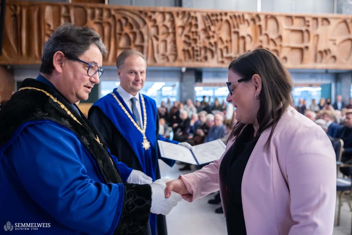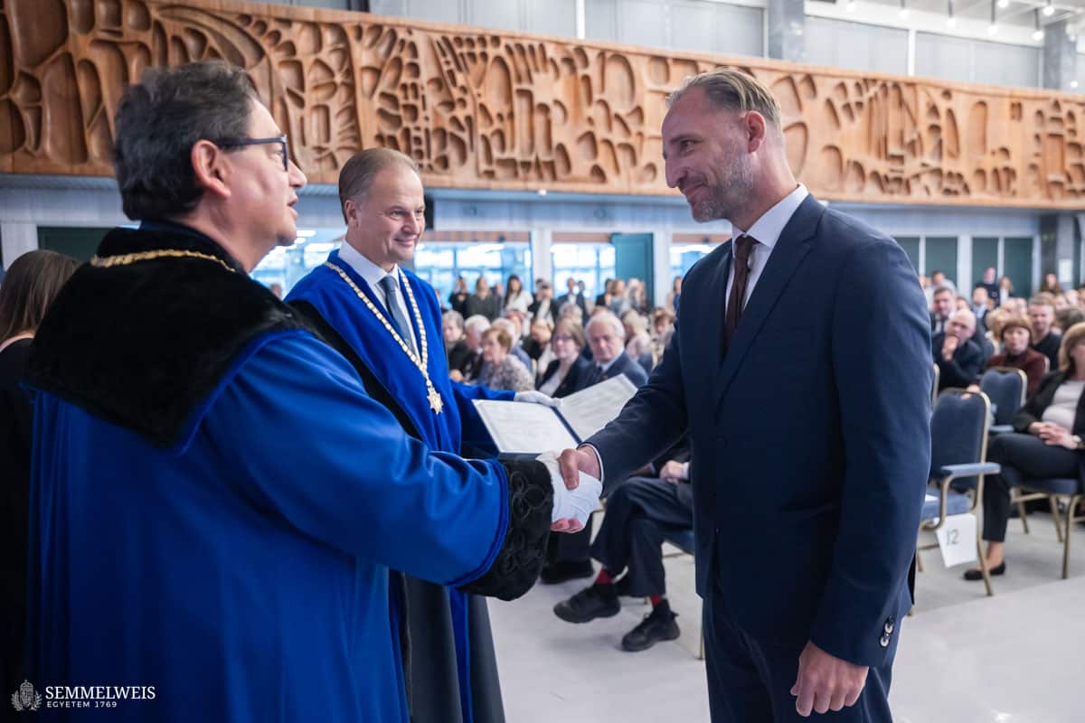 – mondta az ünnepségen dr. Benyó Zoltán, a Doktori Tanács elnöke. A magyar és a nemzetközi képzésben résztvevő, a képzésüket sikeresen teljesítő doktorjelöltek eskütétele után dr. Merkely Béla és dr. Benyó Zoltán kézfogásukkal PhD-fokozatú doktorrá avatta a jelölteket.