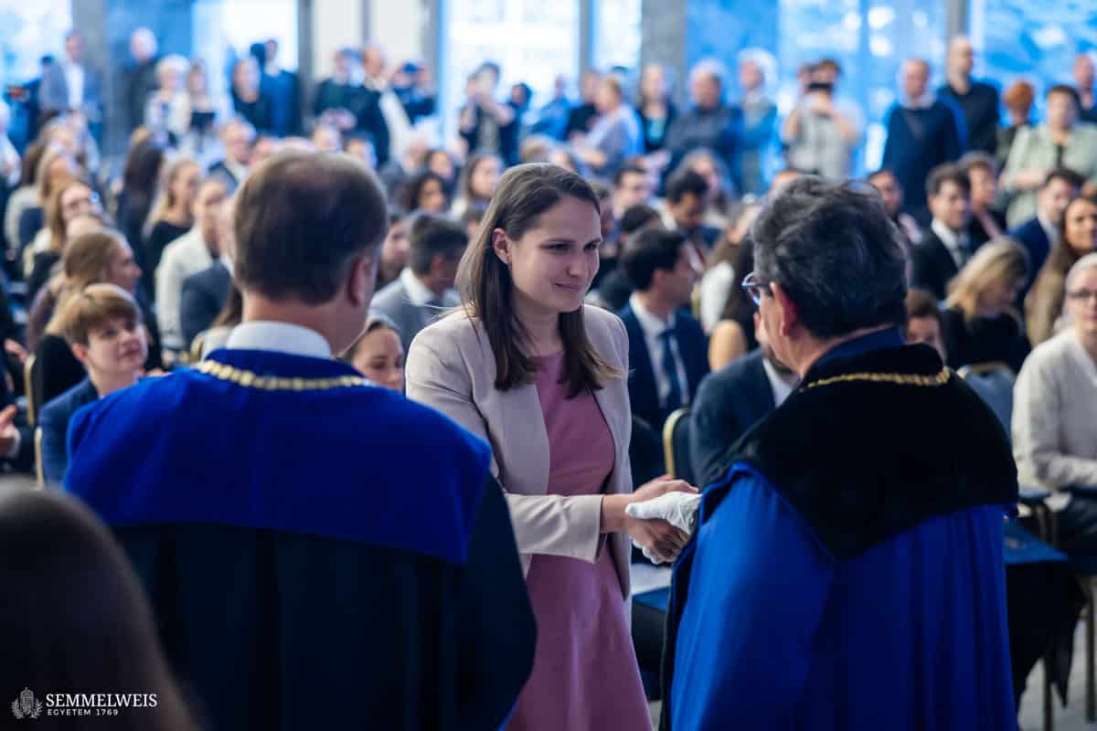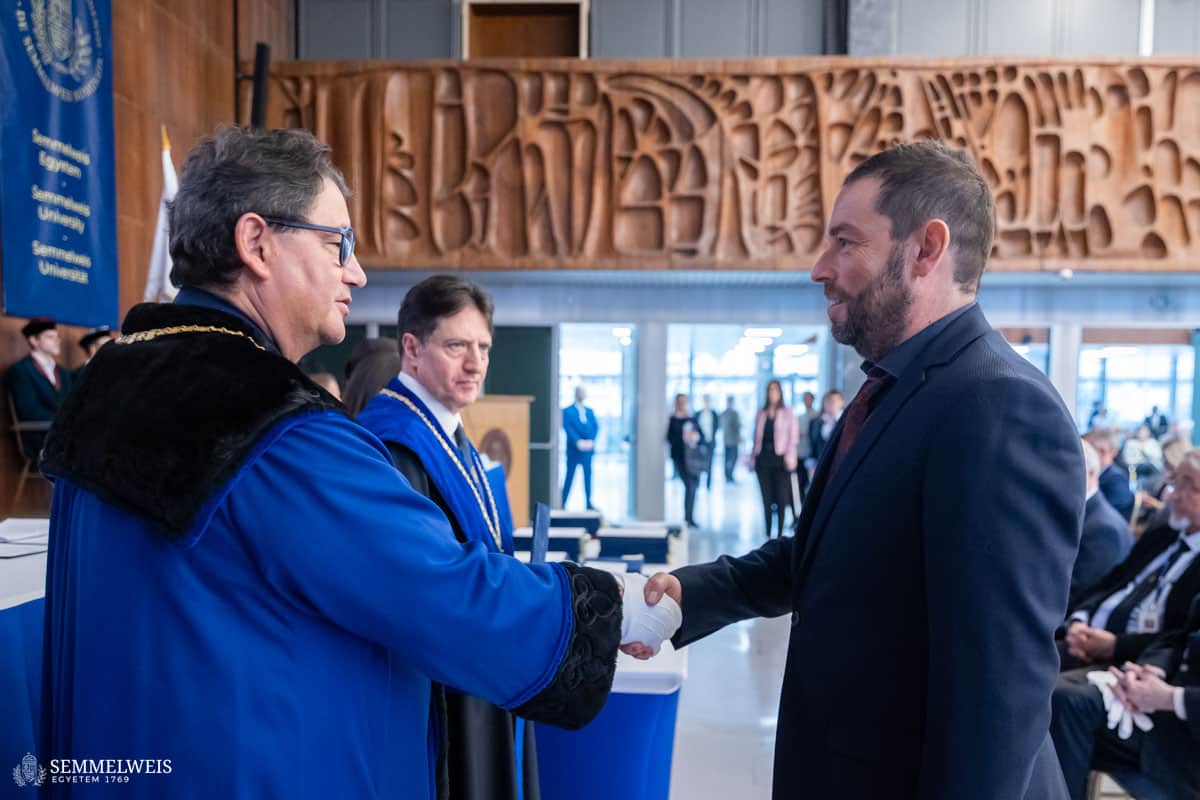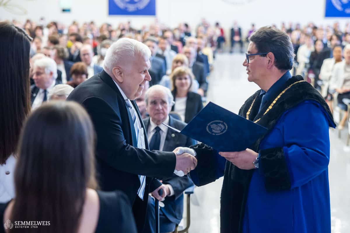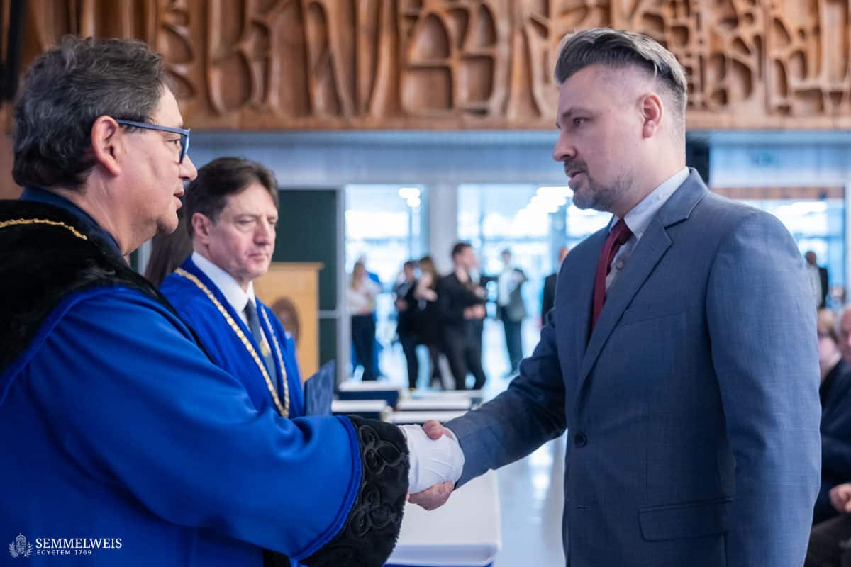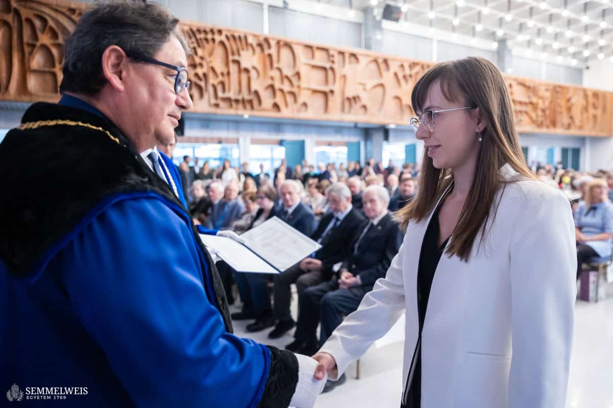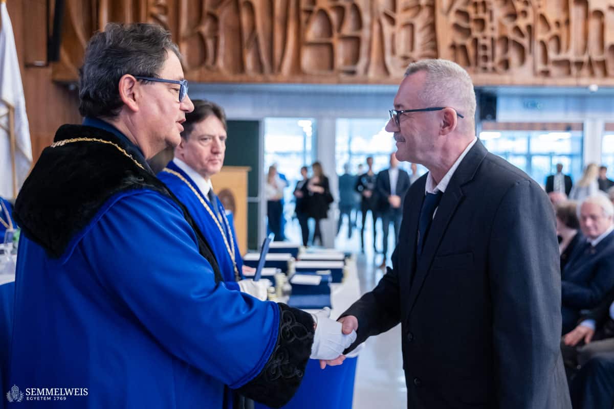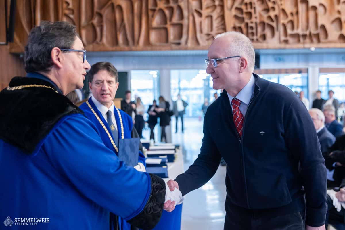 – mondta az ünnepségen dr. Benyó Zoltán, a Doktori Tanács elnöke. A magyar és a nemzetközi képzésben résztvevő, a képzésüket sikeresen teljesítő doktorjelöltek eskütétele után dr. Merkely Béla és dr. Benyó Zoltán kézfogásukkal PhD-fokozatú doktorrá avatta a jelölteket.