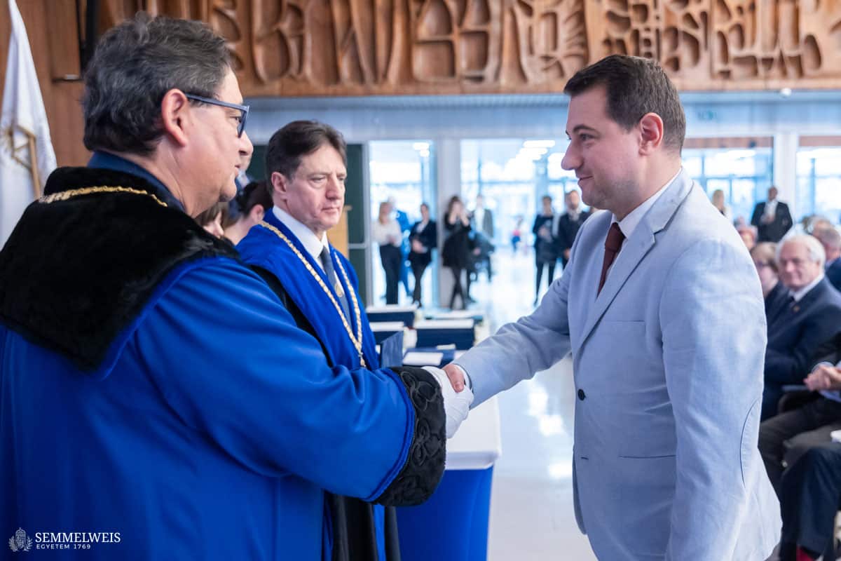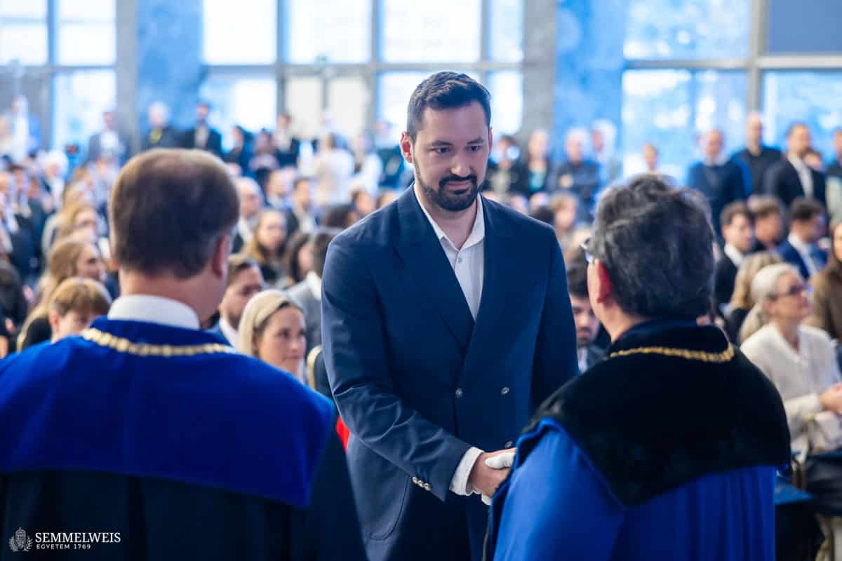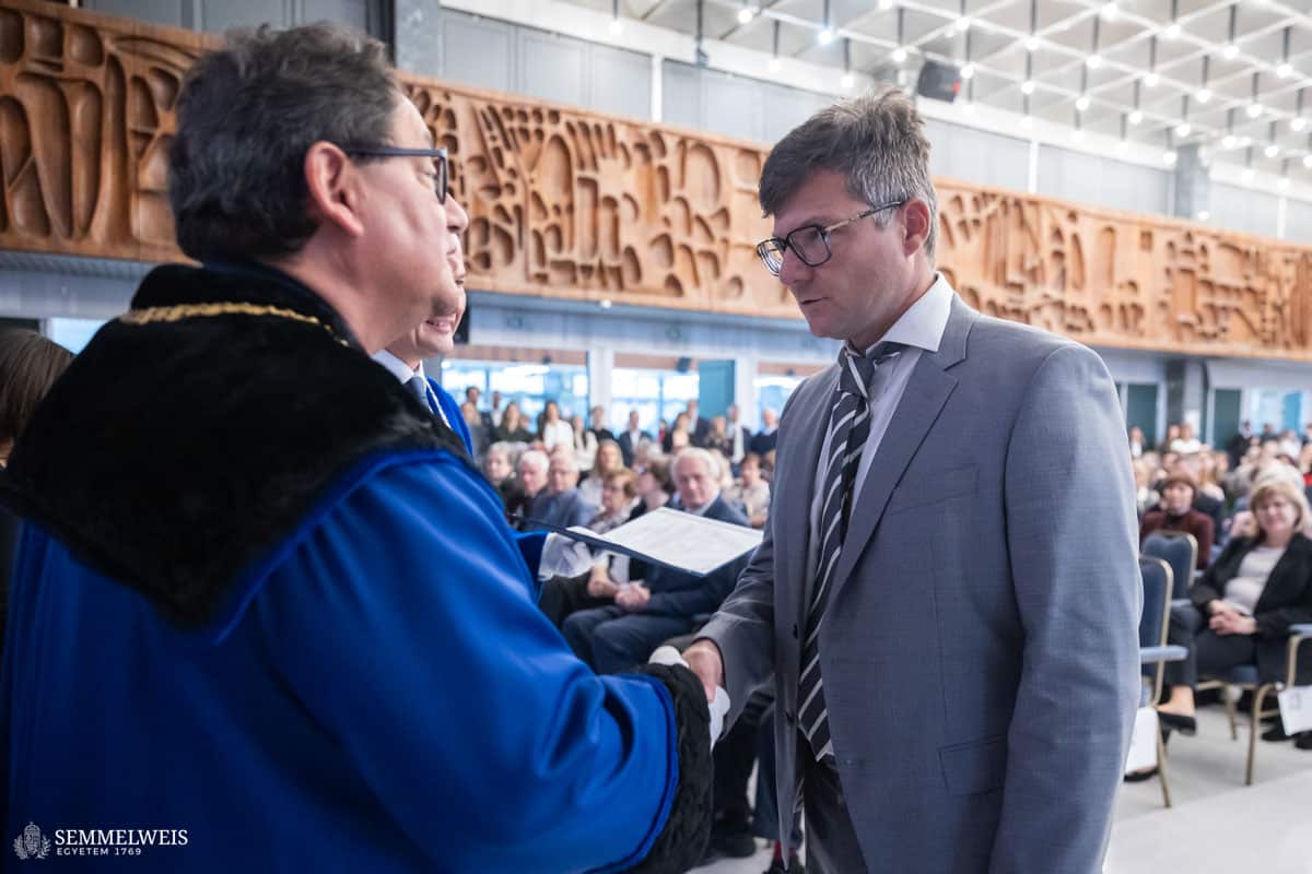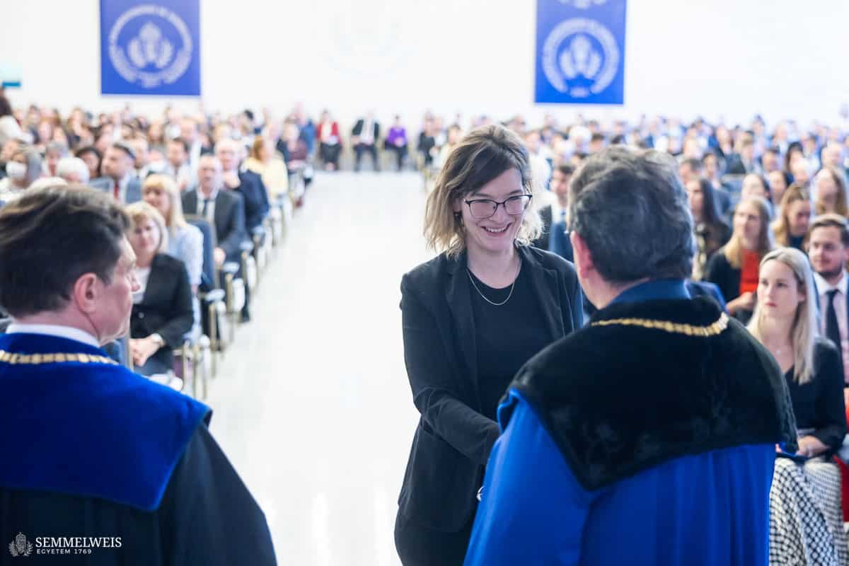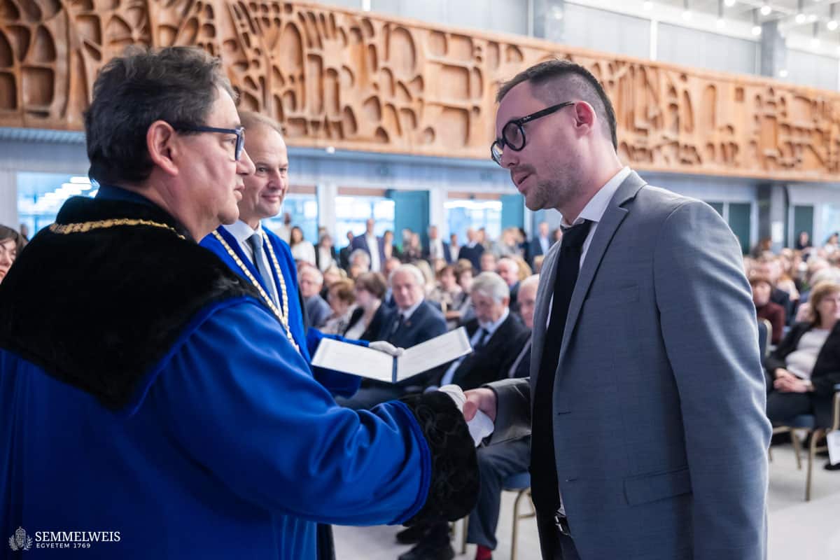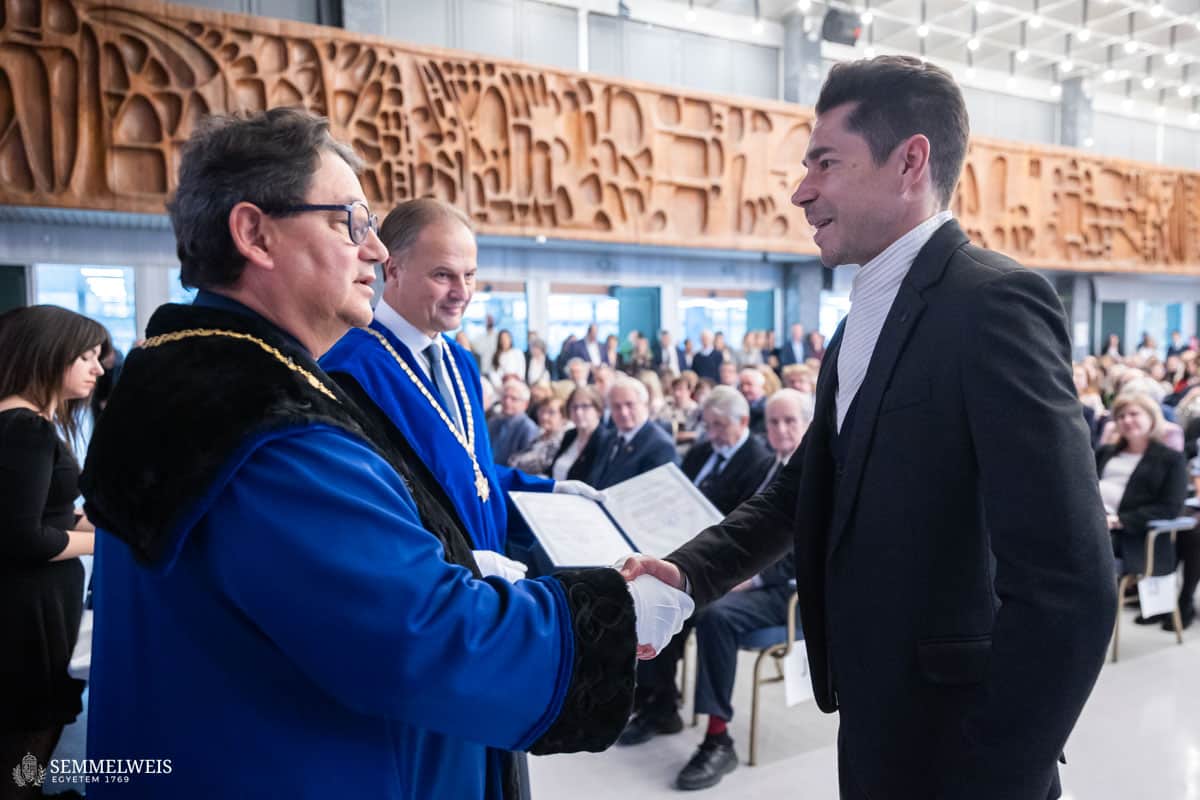 – mondta az ünnepségen dr. Benyó Zoltán, a Doktori Tanács elnöke. A magyar és a nemzetközi képzésben résztvevő, a képzésüket sikeresen teljesítő doktorjelöltek eskütétele után dr. Merkely Béla és dr. Benyó Zoltán kézfogásukkal PhD-fokozatú doktorrá avatta a jelölteket.
