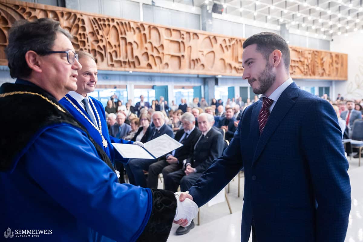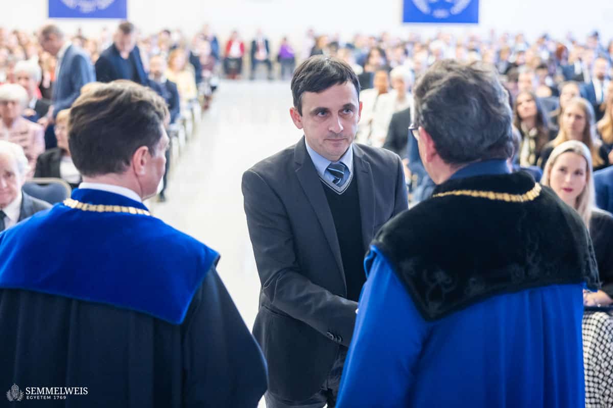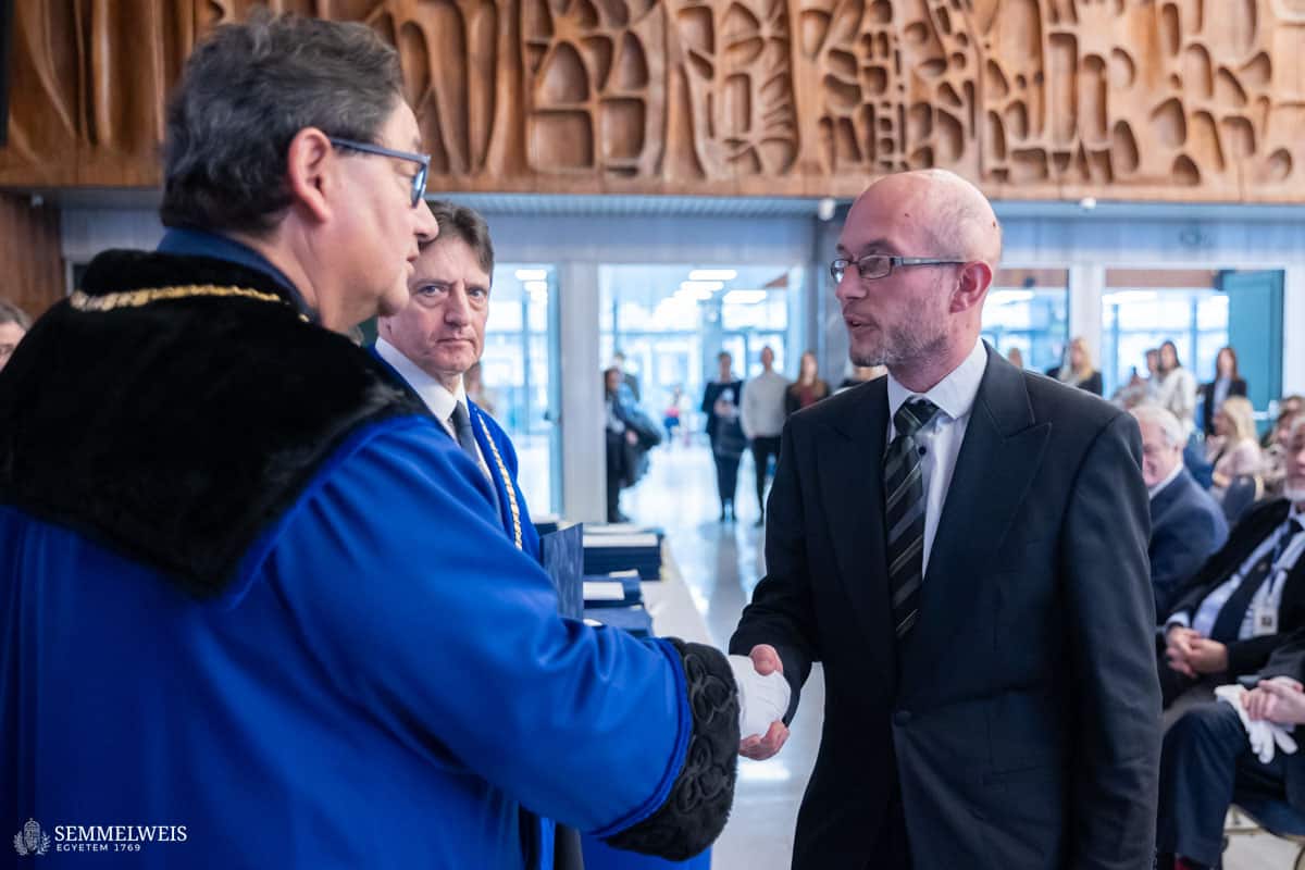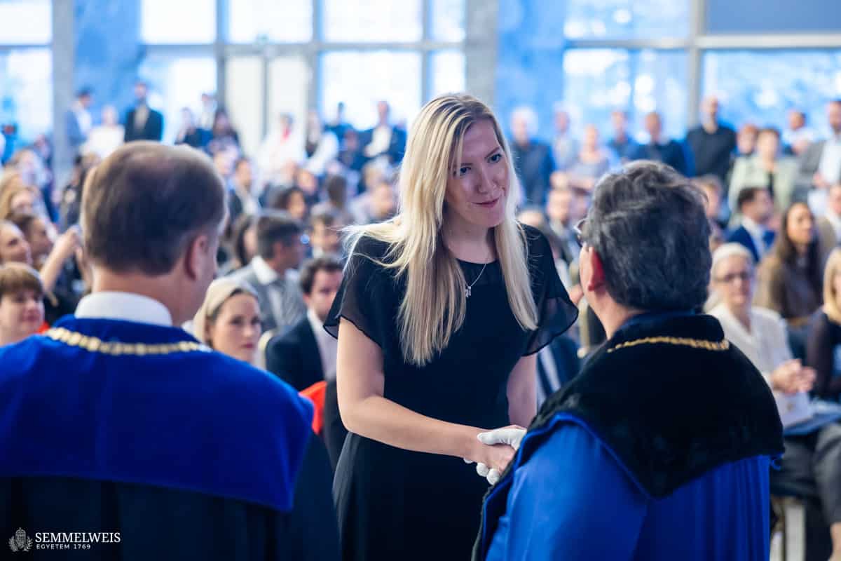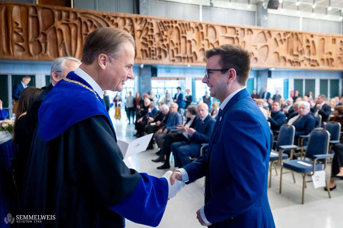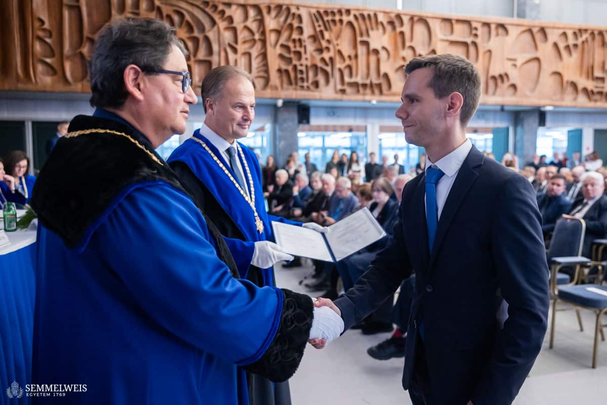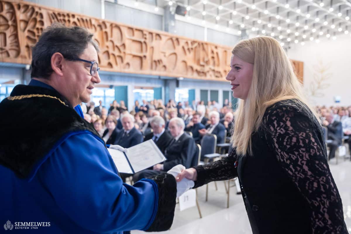 – mondta az ünnepségen dr. Benyó Zoltán, a Doktori Tanács elnöke. A magyar és a nemzetközi képzésben résztvevő, a képzésüket sikeresen teljesítő doktorjelöltek eskütétele után dr. Merkely Béla és dr. Benyó Zoltán kézfogásukkal PhD-fokozatú doktorrá avatta a jelölteket.