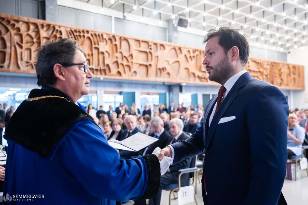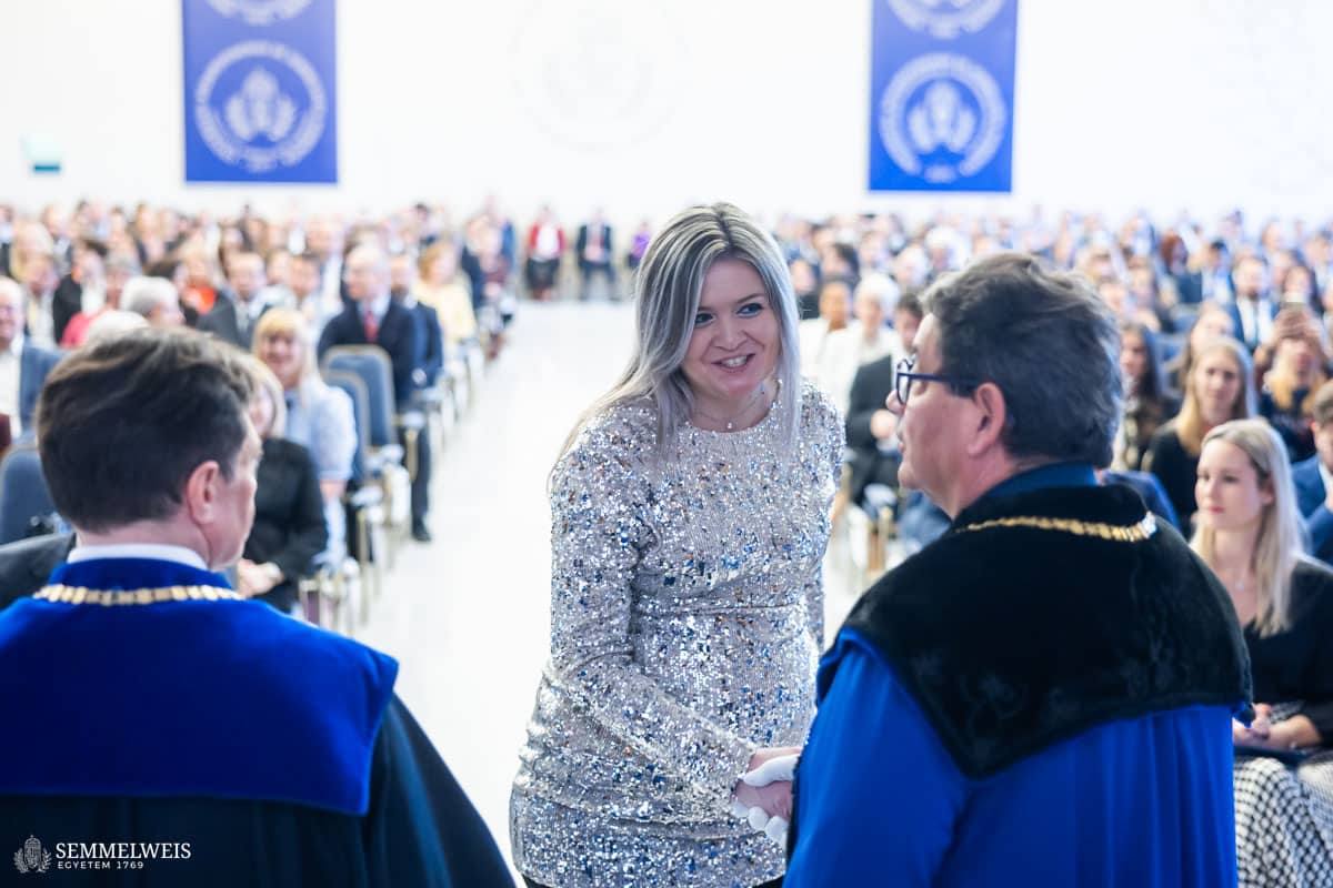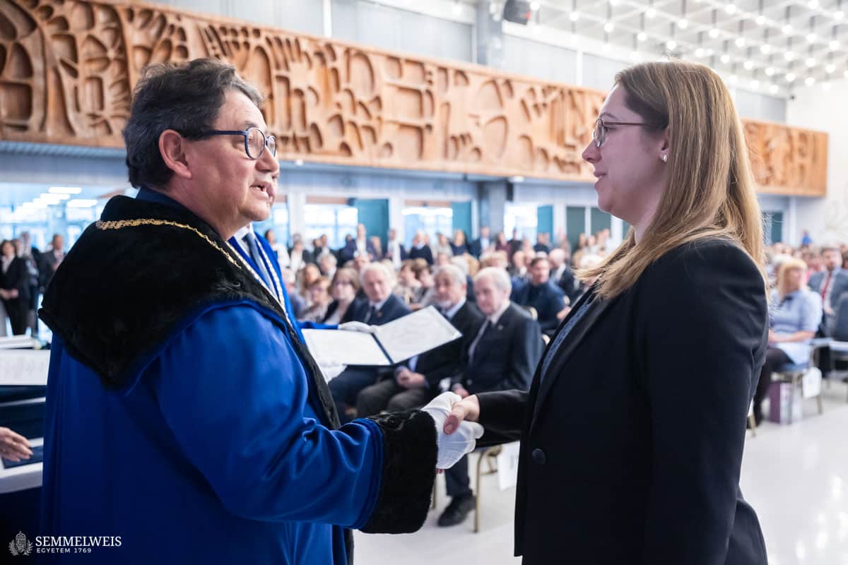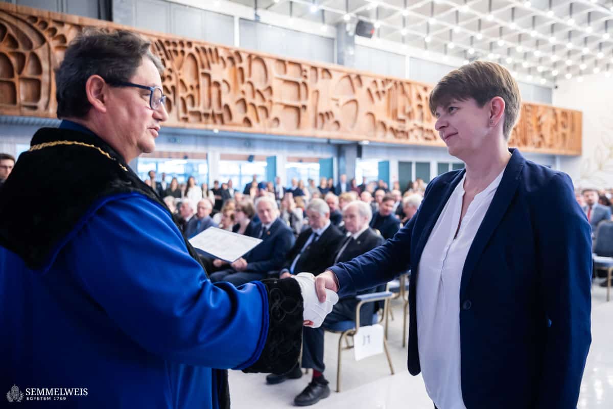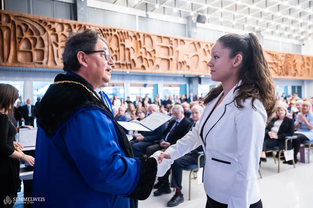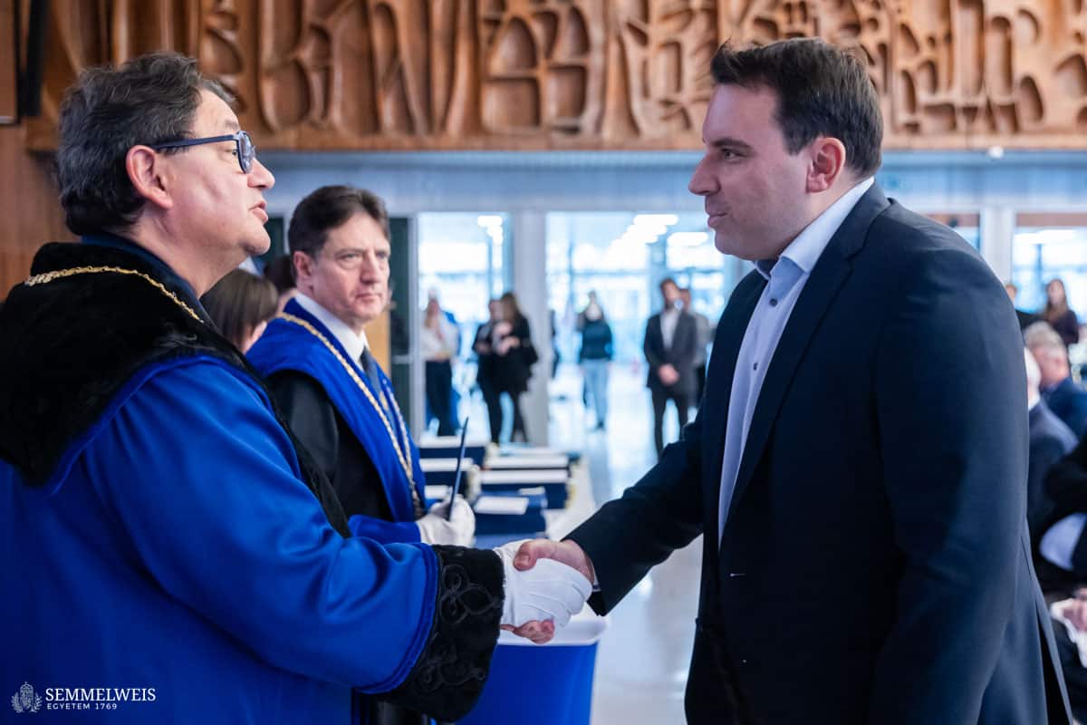 – mondta az ünnepségen dr. Benyó Zoltán, a Doktori Tanács elnöke. A magyar és a nemzetközi képzésben résztvevő, a képzésüket sikeresen teljesítő doktorjelöltek eskütétele után dr. Merkely Béla és dr. Benyó Zoltán kézfogásukkal PhD-fokozatú doktorrá avatta a jelölteket.