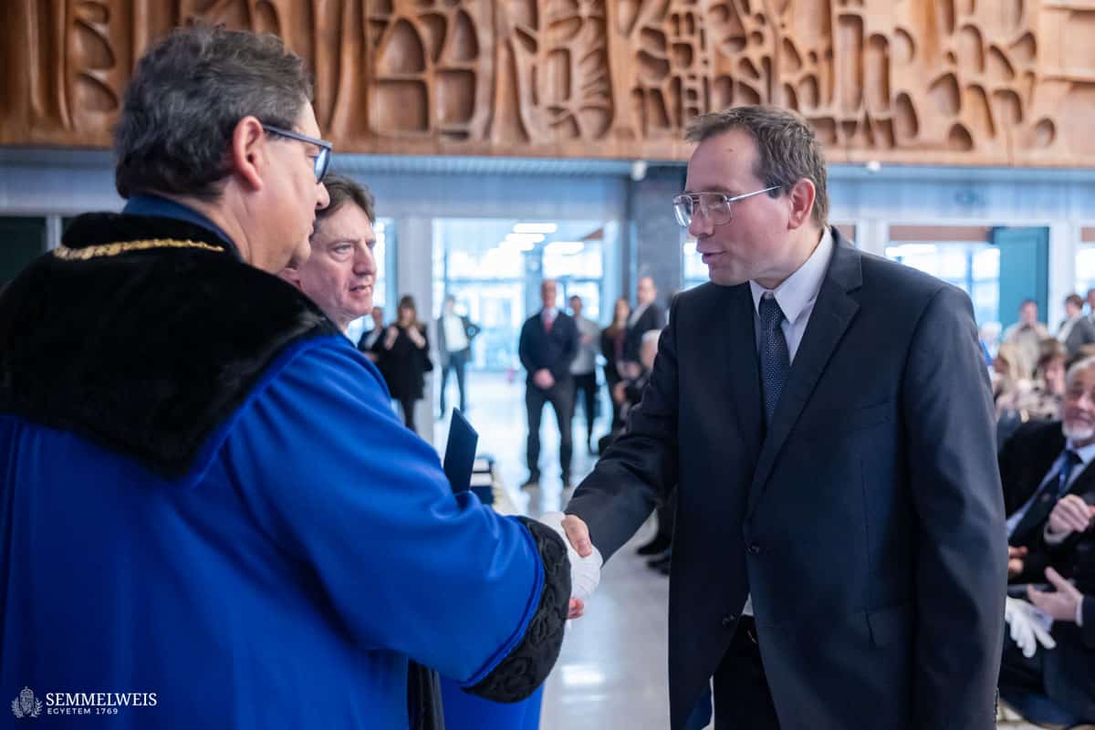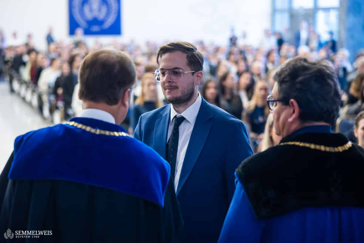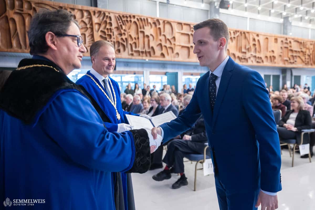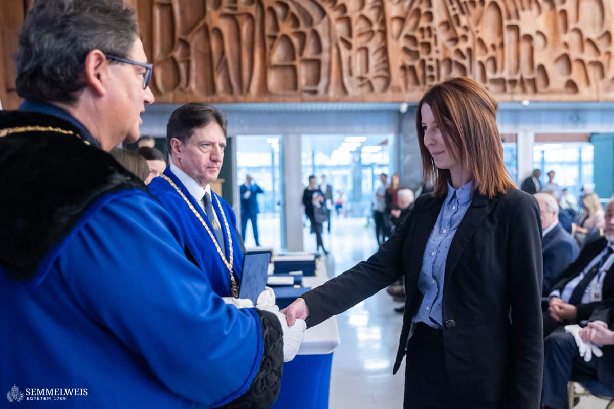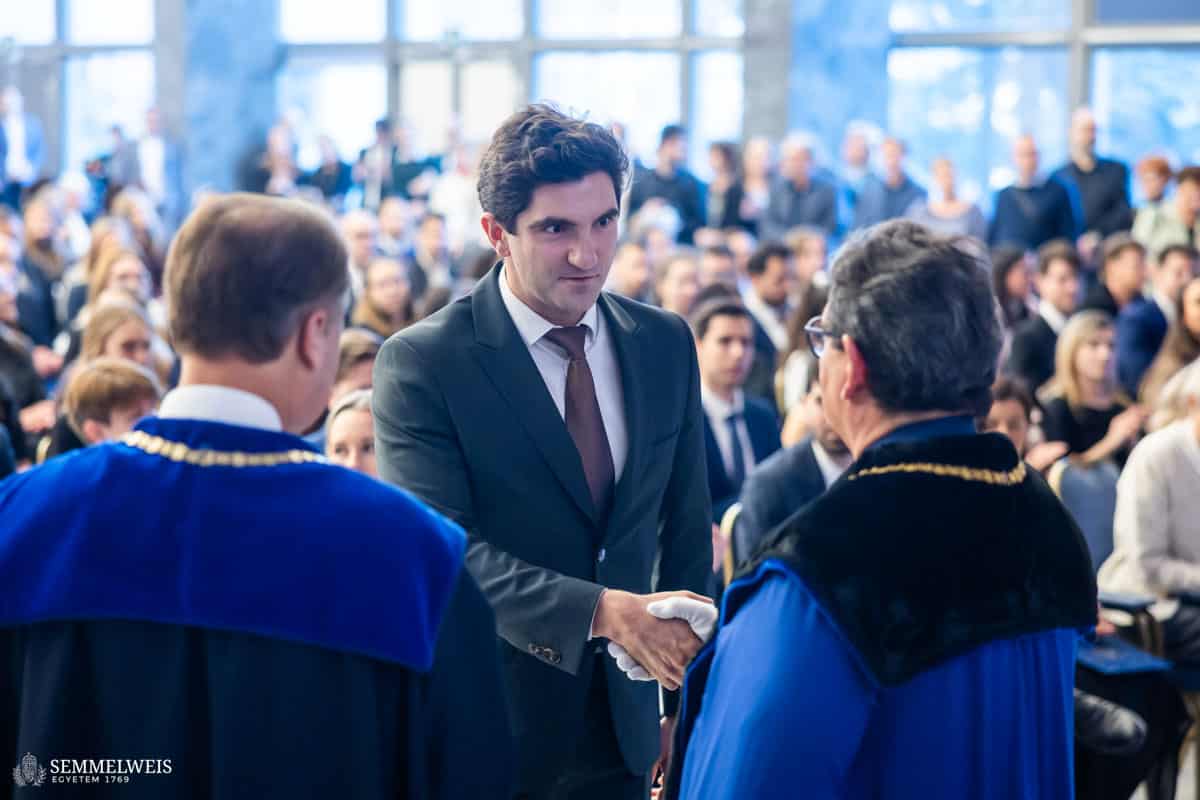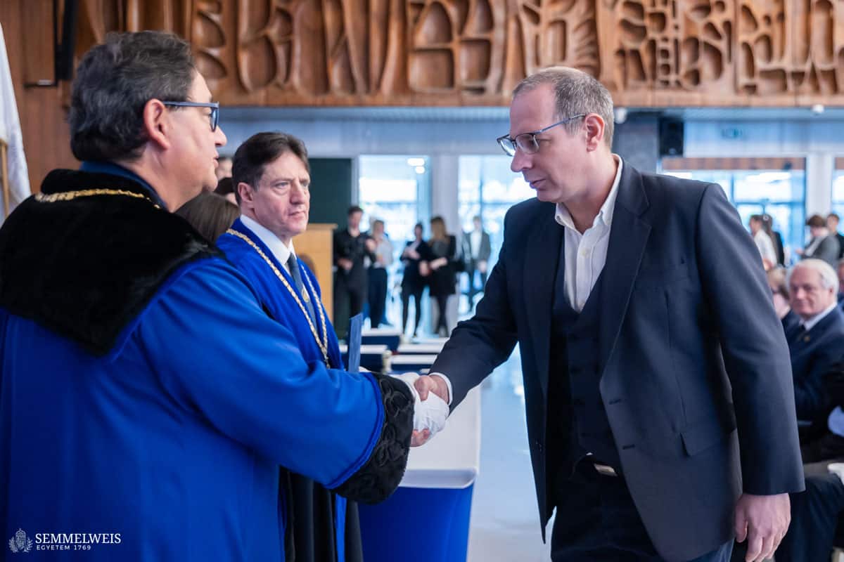 – mondta az ünnepségen dr. Benyó Zoltán, a Doktori Tanács elnöke. A magyar és a nemzetközi képzésben résztvevő, a képzésüket sikeresen teljesítő doktorjelöltek eskütétele után dr. Merkely Béla és dr. Benyó Zoltán kézfogásukkal PhD-fokozatú doktorrá avatta a jelölteket.