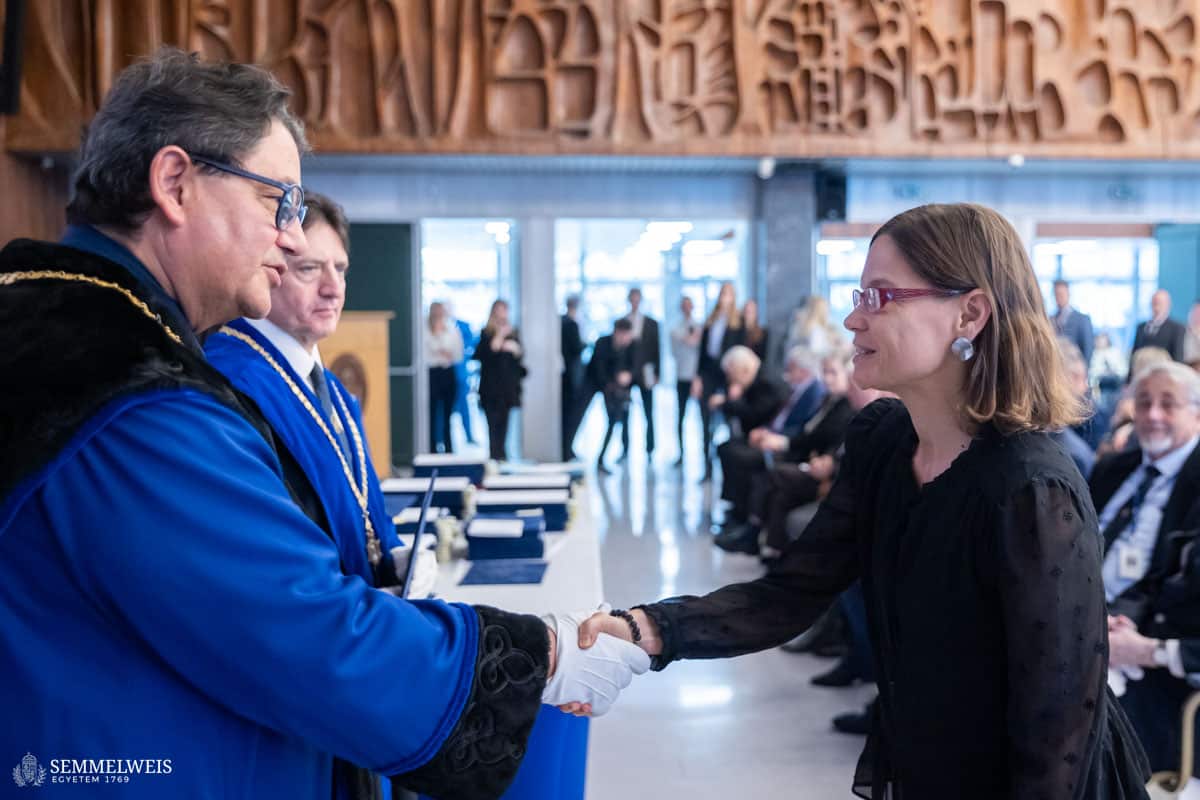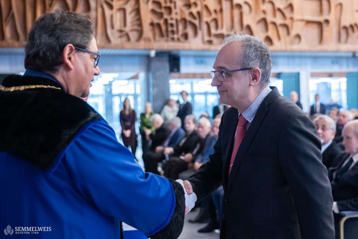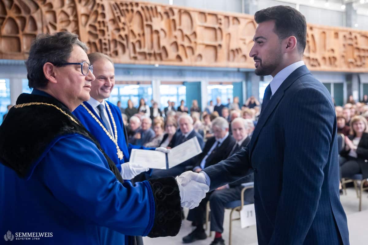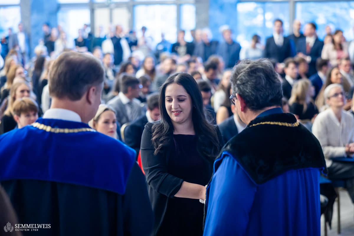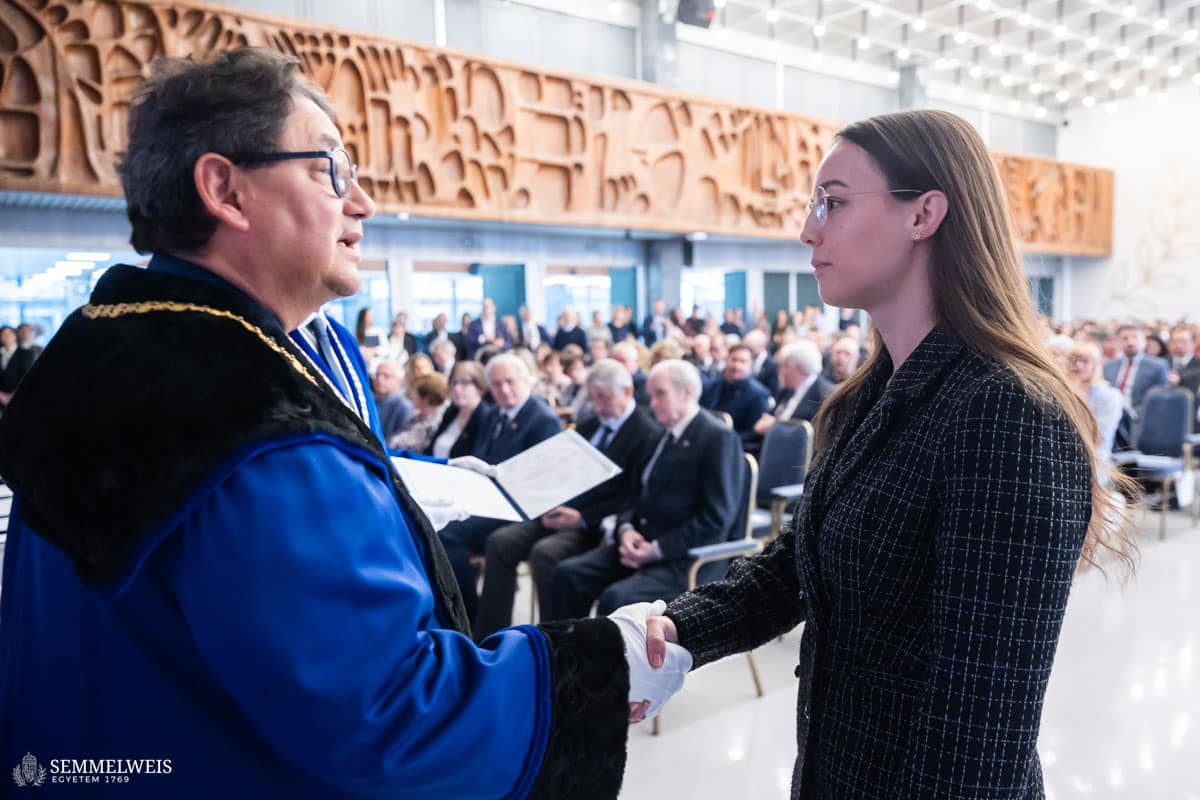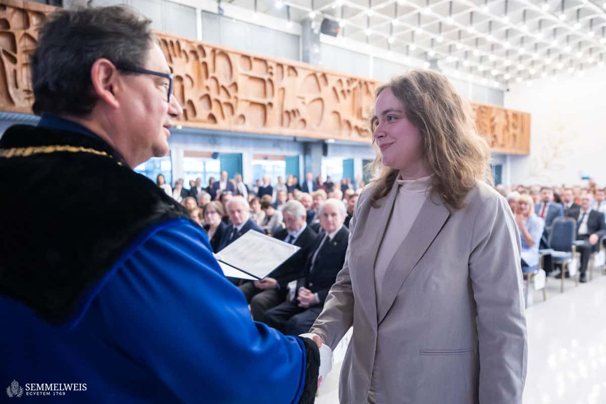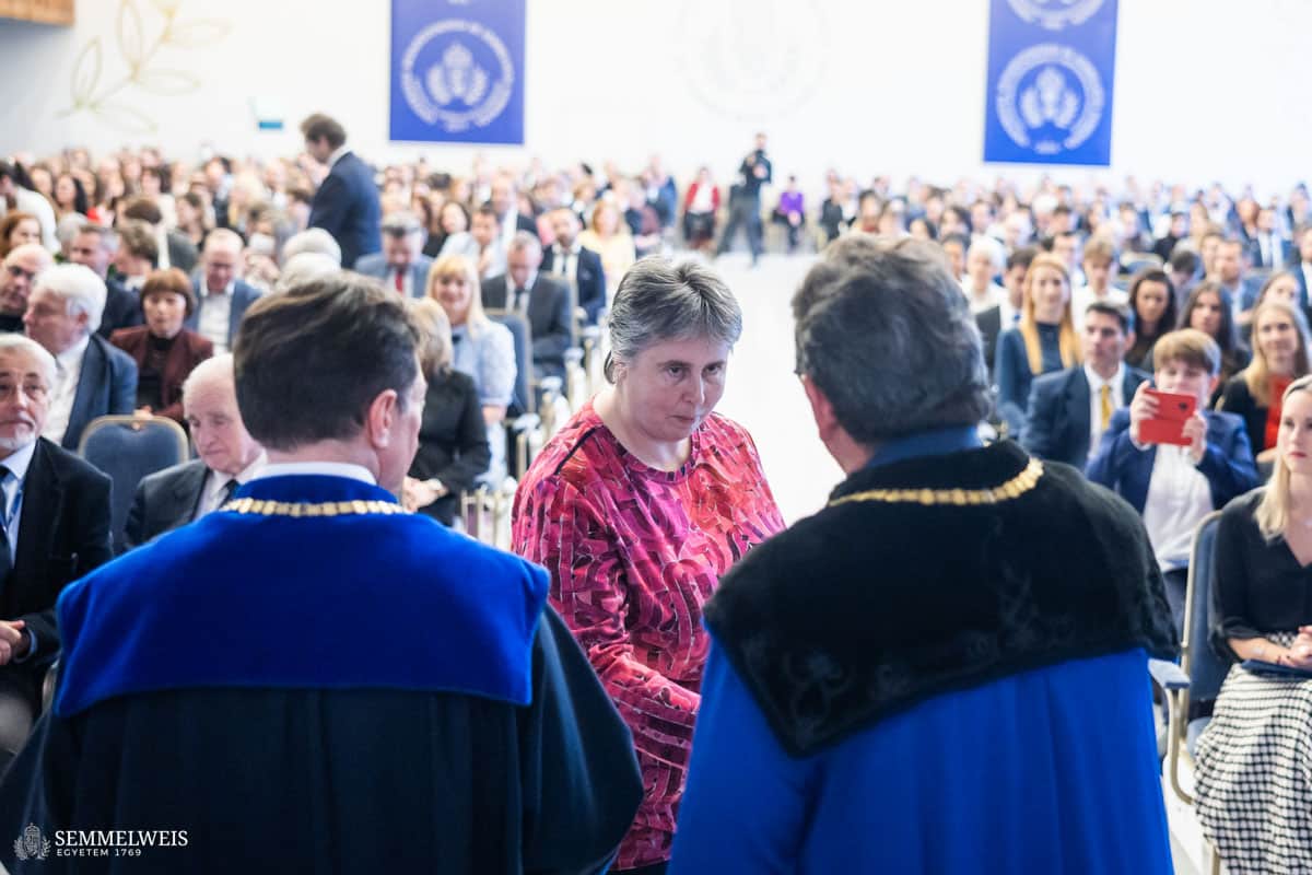 – mondta az ünnepségen dr. Benyó Zoltán, a Doktori Tanács elnöke. A magyar és a nemzetközi képzésben résztvevő, a képzésüket sikeresen teljesítő doktorjelöltek eskütétele után dr. Merkely Béla és dr. Benyó Zoltán kézfogásukkal PhD-fokozatú doktorrá avatta a jelölteket.