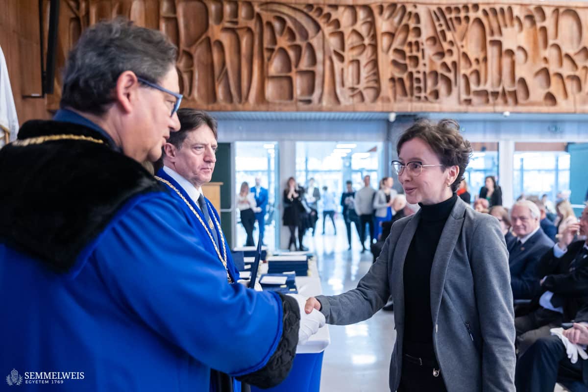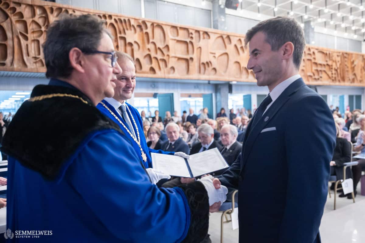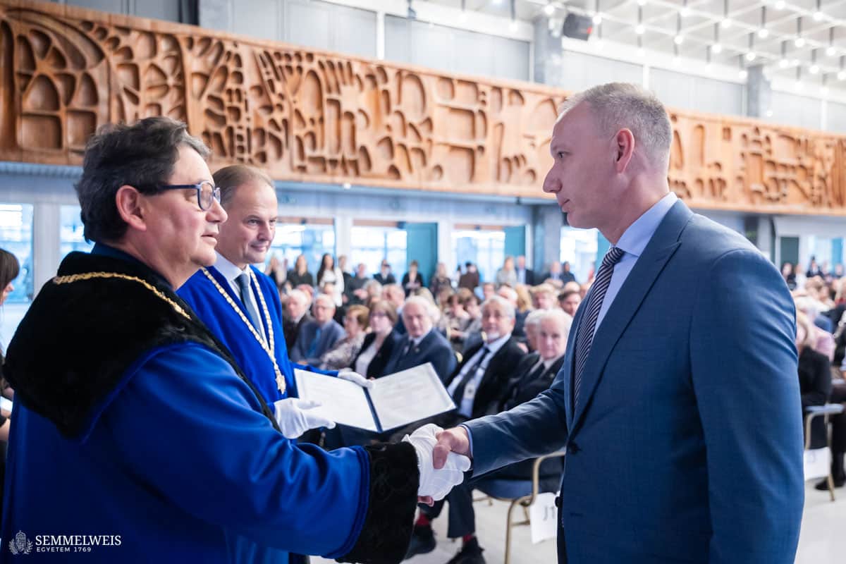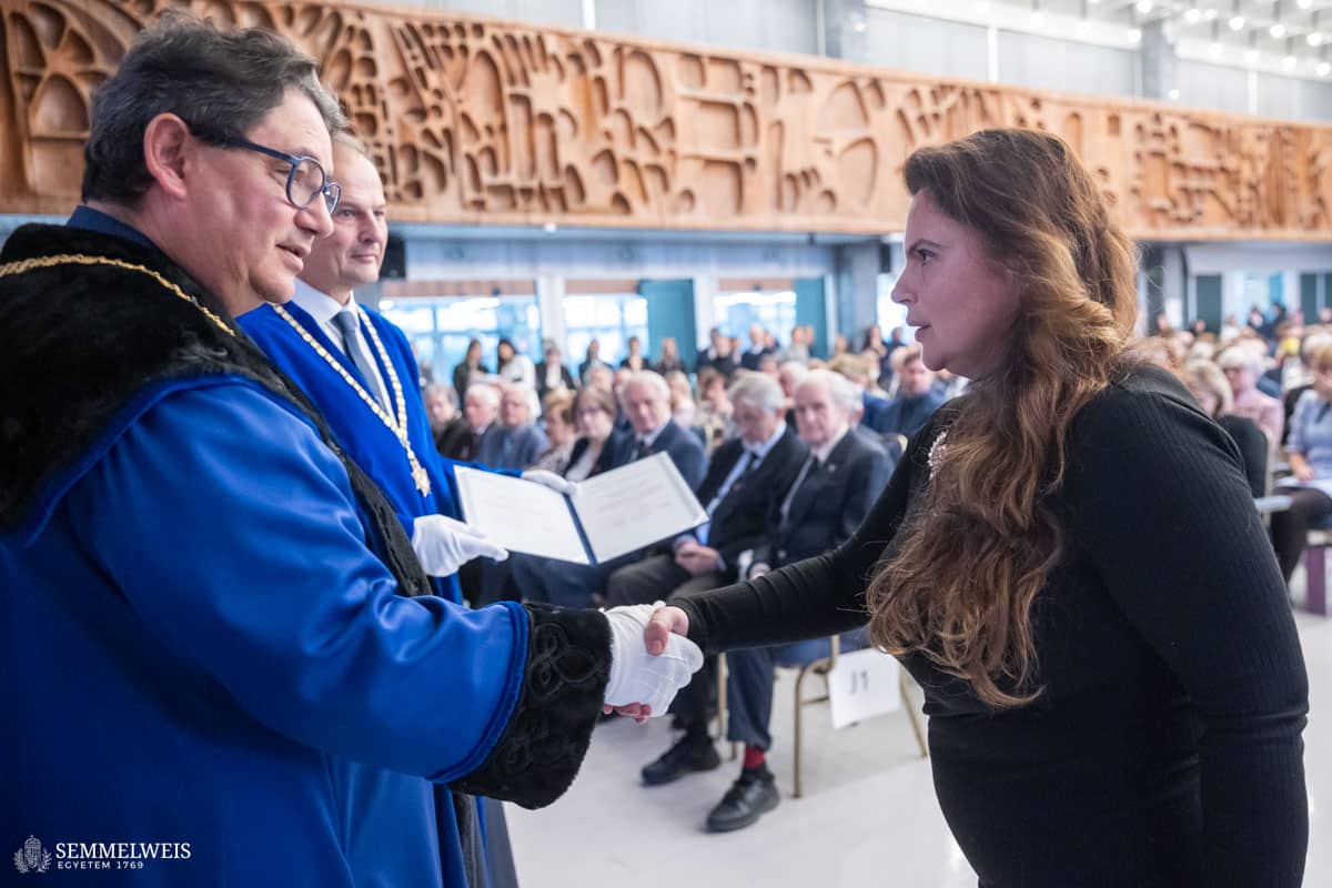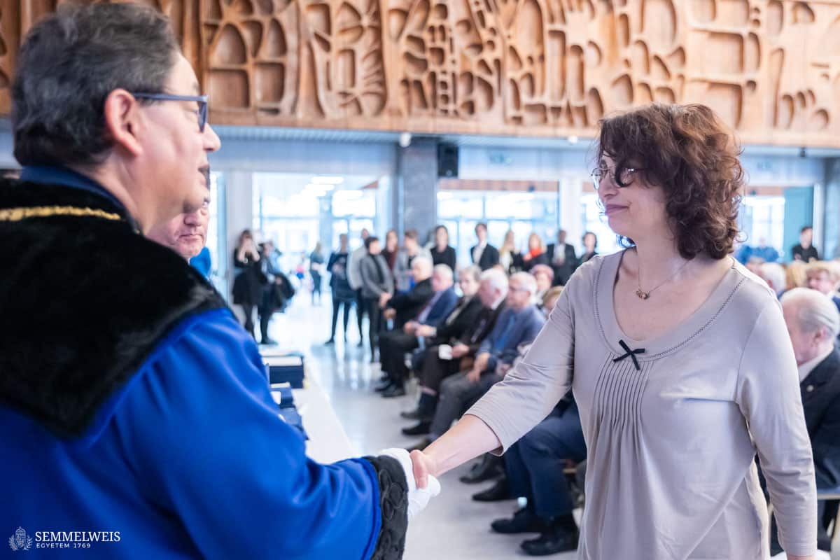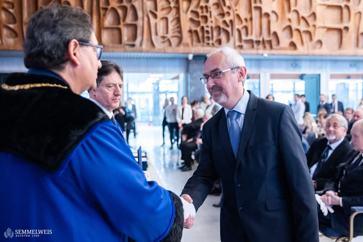 – mondta az ünnepségen dr. Benyó Zoltán, a Doktori Tanács elnöke. A magyar és a nemzetközi képzésben résztvevő, a képzésüket sikeresen teljesítő doktorjelöltek eskütétele után dr. Merkely Béla és dr. Benyó Zoltán kézfogásukkal PhD-fokozatú doktorrá avatta a jelölteket.