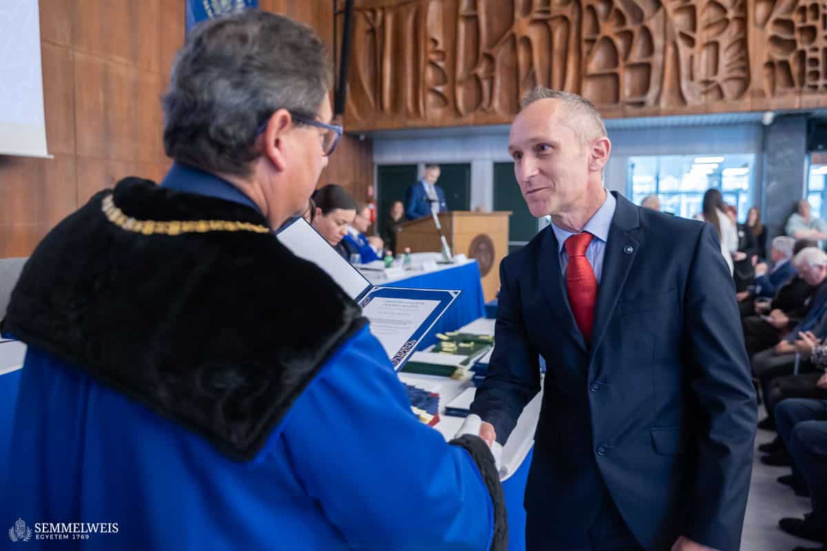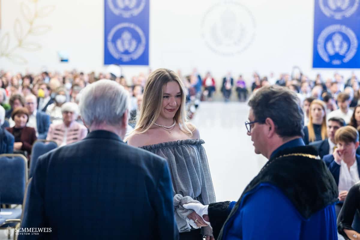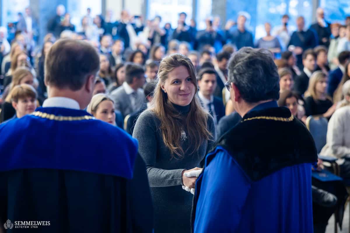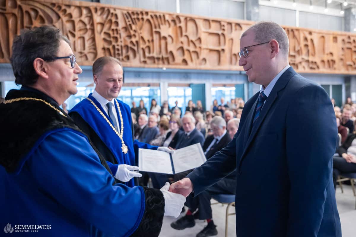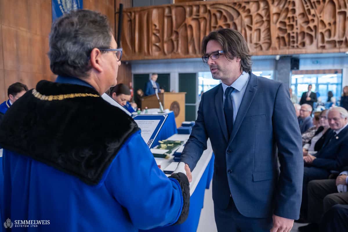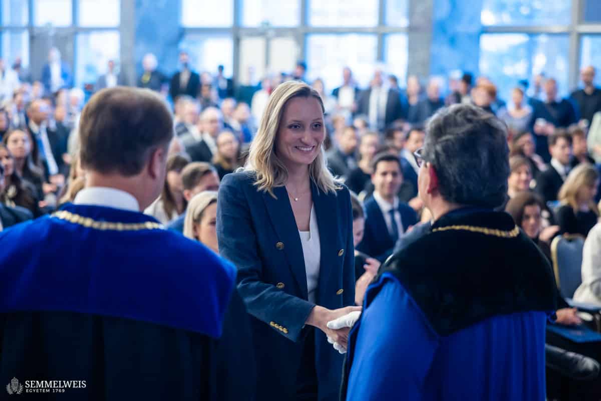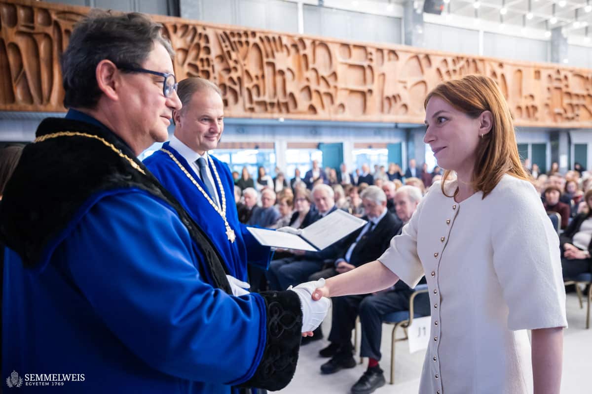 – mondta az ünnepségen dr. Benyó Zoltán, a Doktori Tanács elnöke. A magyar és a nemzetközi képzésben résztvevő, a képzésüket sikeresen teljesítő doktorjelöltek eskütétele után dr. Merkely Béla és dr. Benyó Zoltán kézfogásukkal PhD-fokozatú doktorrá avatta a jelölteket.