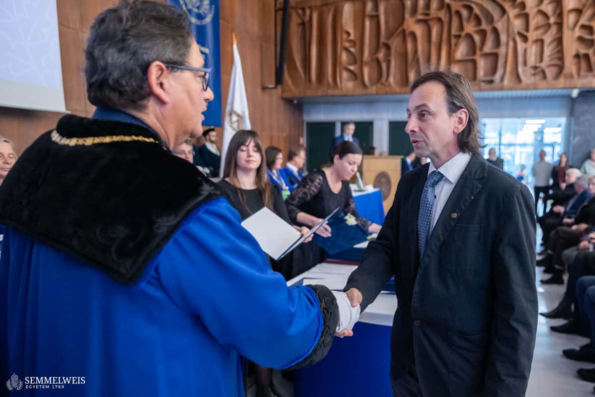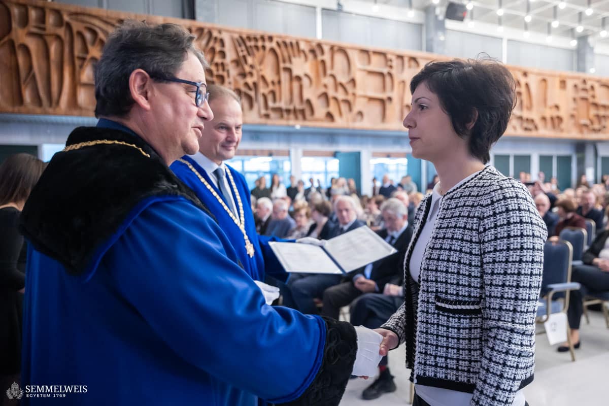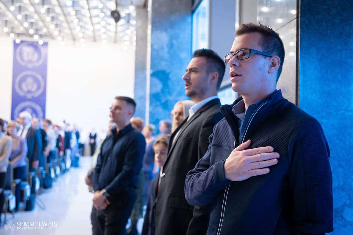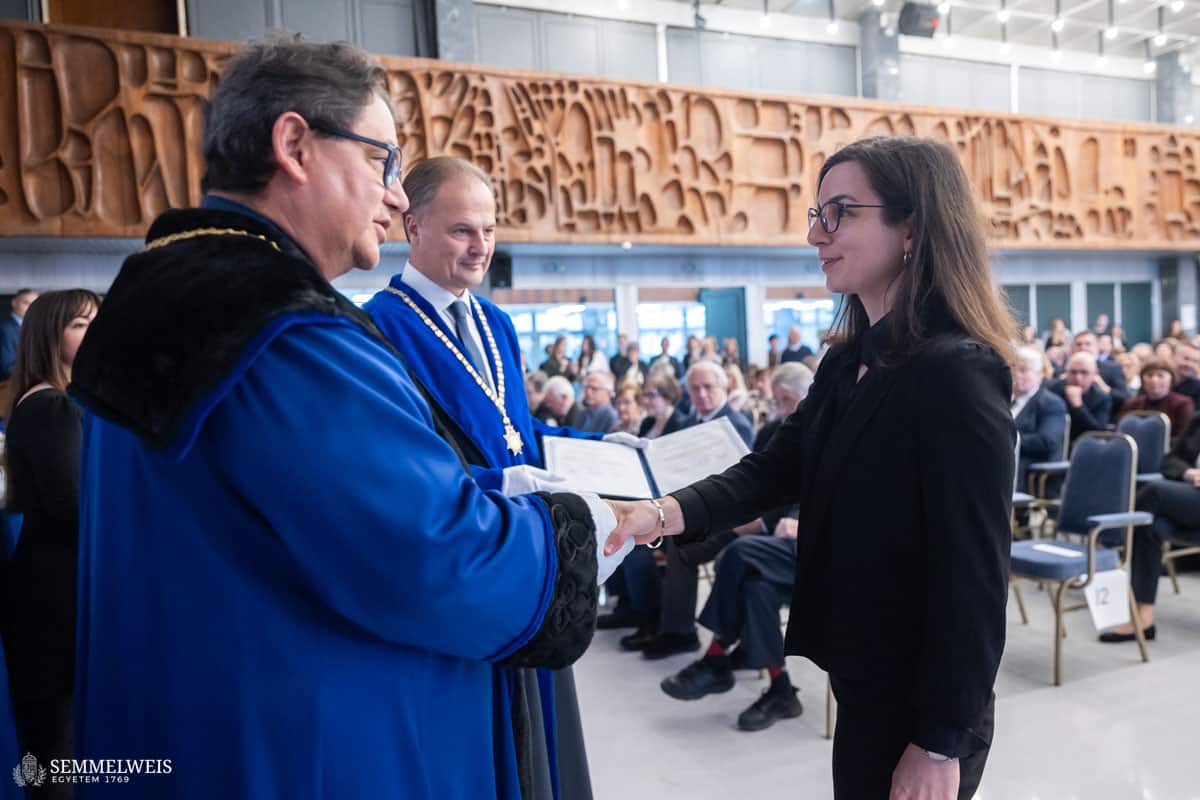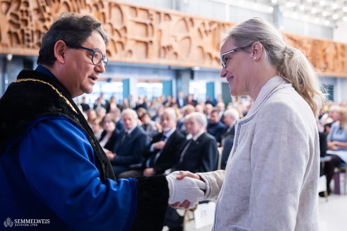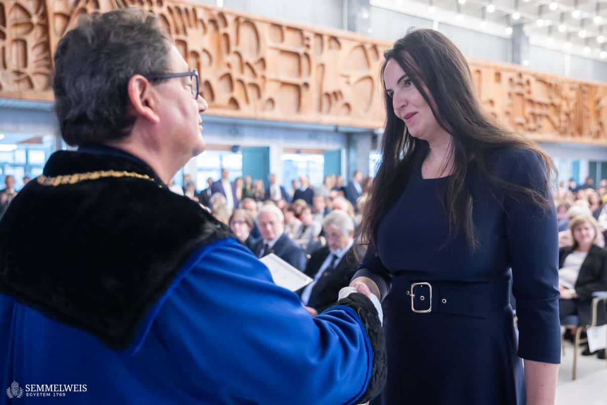 – mondta az ünnepségen dr. Benyó Zoltán, a Doktori Tanács elnöke. A magyar és a nemzetközi képzésben résztvevő, a képzésüket sikeresen teljesítő doktorjelöltek eskütétele után dr. Merkely Béla és dr. Benyó Zoltán kézfogásukkal PhD-fokozatú doktorrá avatta a jelölteket.