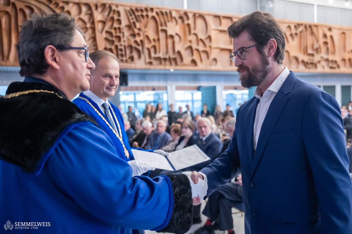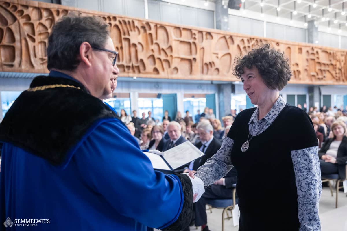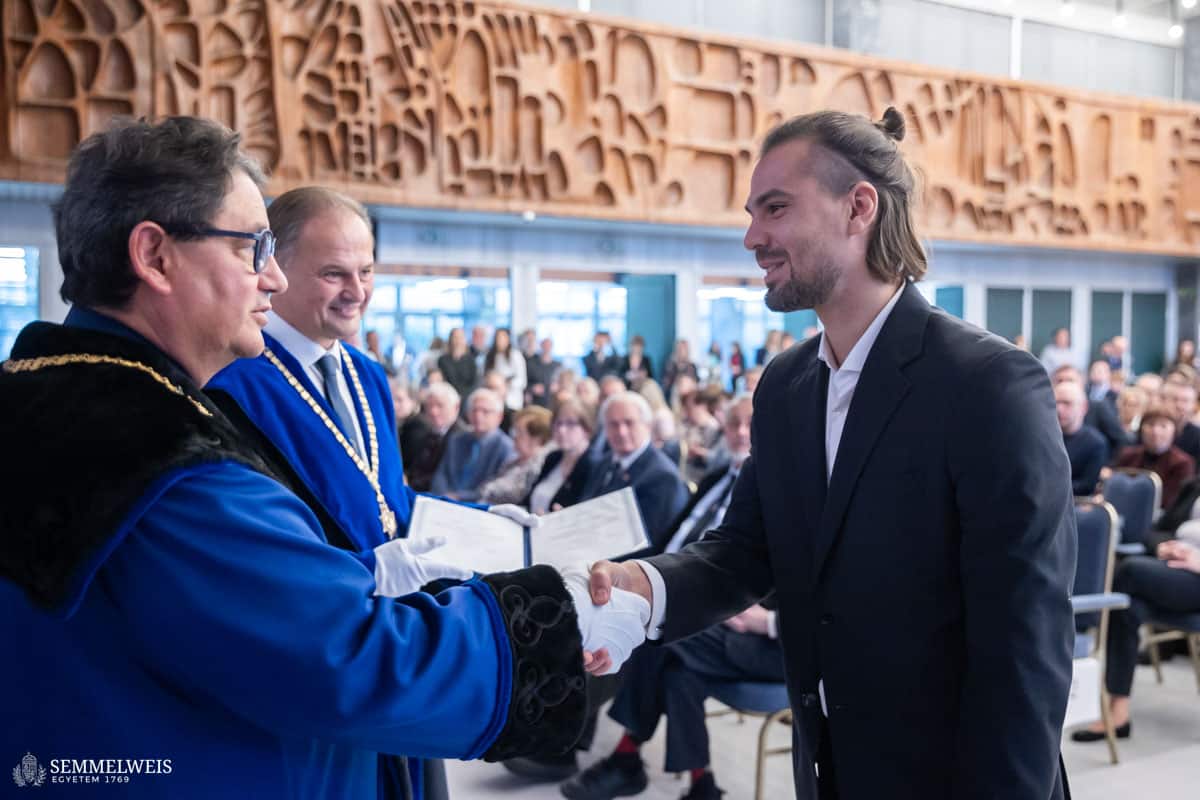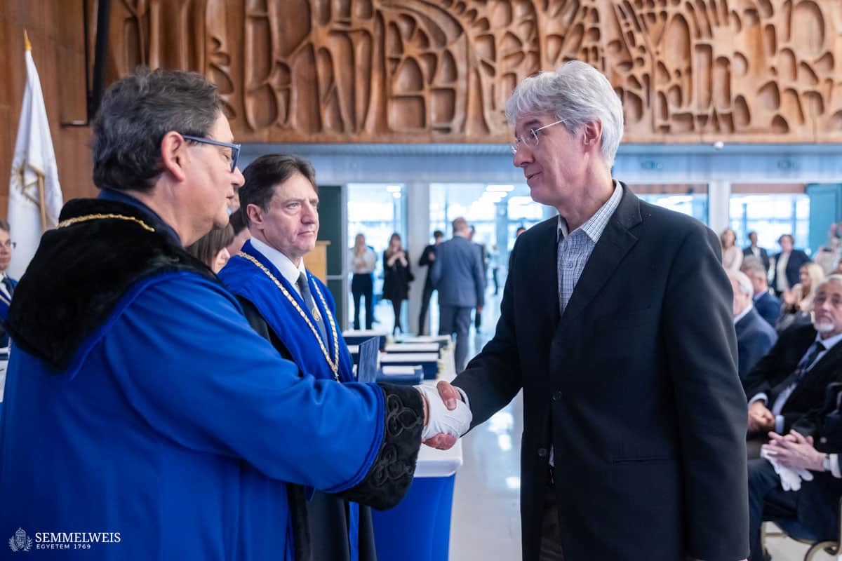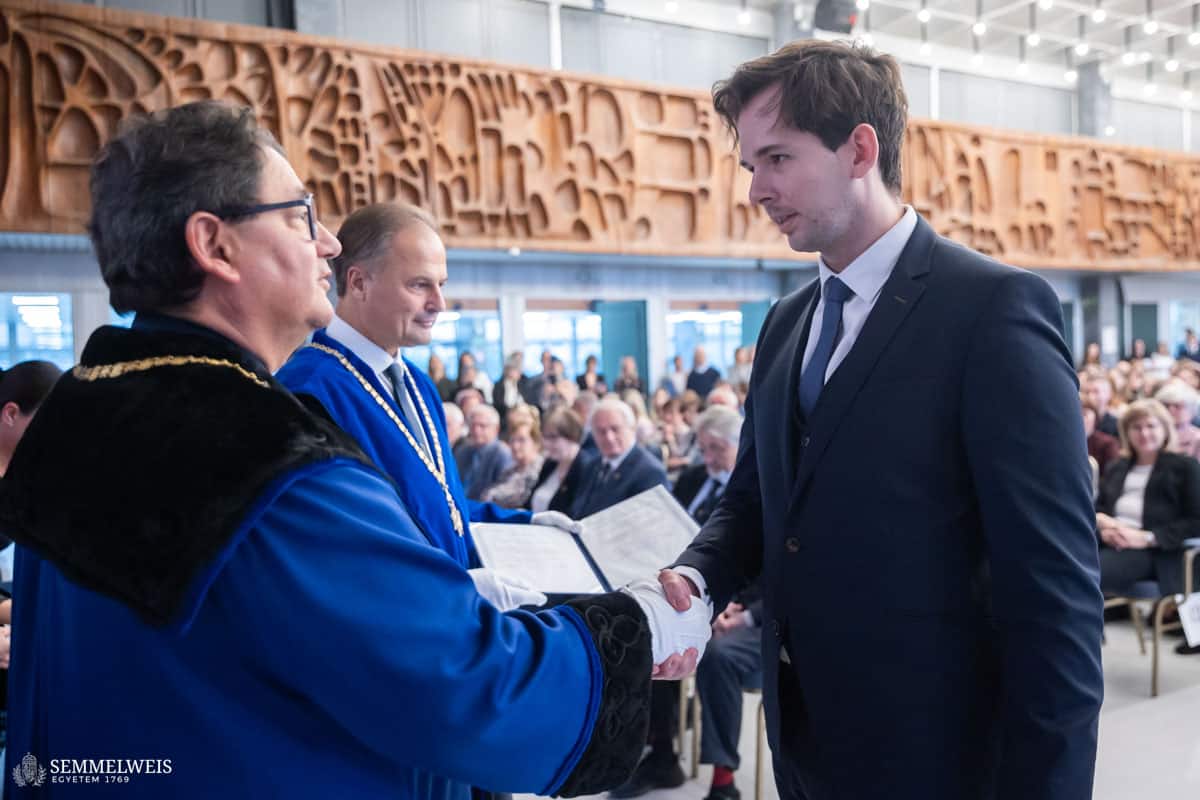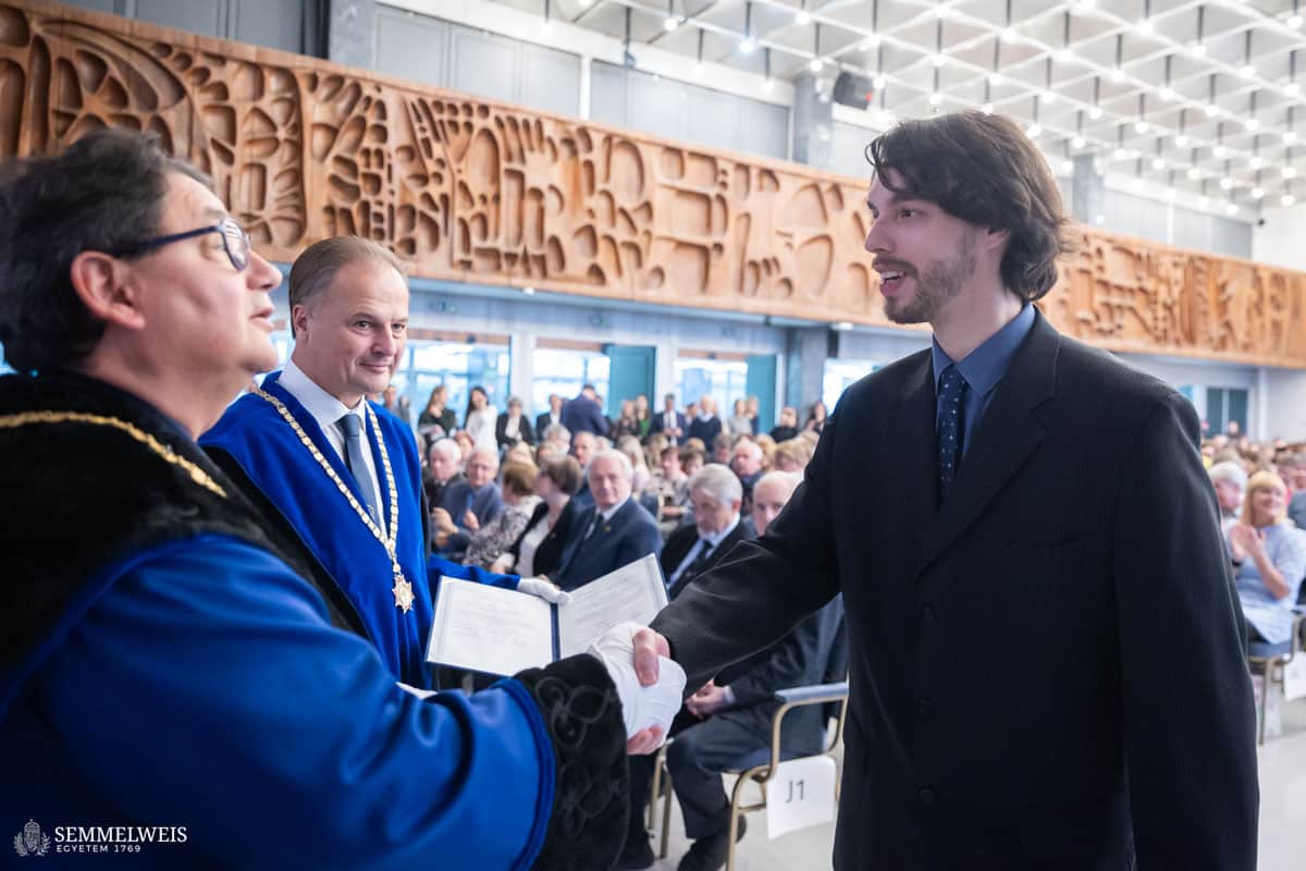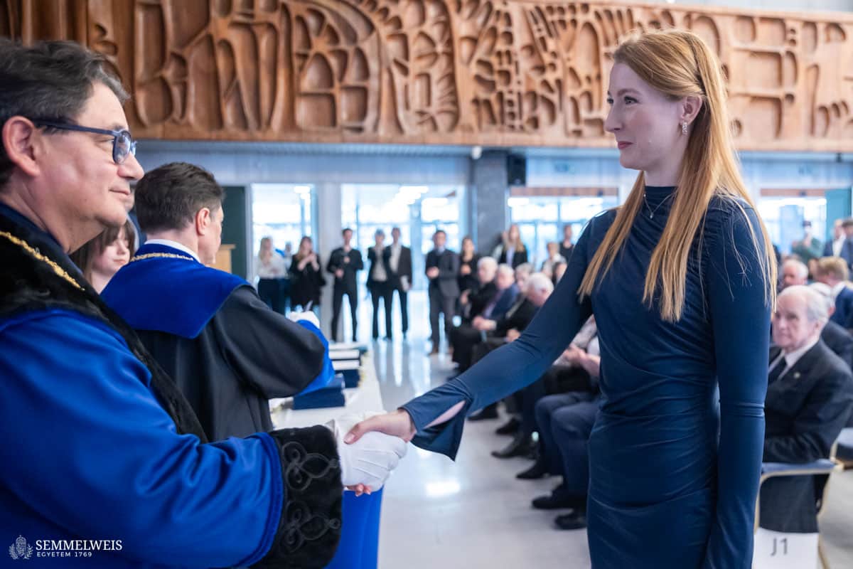 – mondta az ünnepségen dr. Benyó Zoltán, a Doktori Tanács elnöke. A magyar és a nemzetközi képzésben résztvevő, a képzésüket sikeresen teljesítő doktorjelöltek eskütétele után dr. Merkely Béla és dr. Benyó Zoltán kézfogásukkal PhD-fokozatú doktorrá avatta a jelölteket.