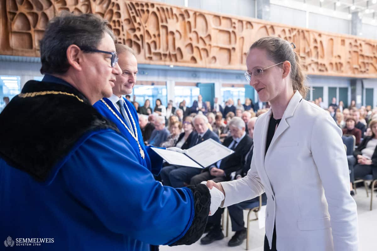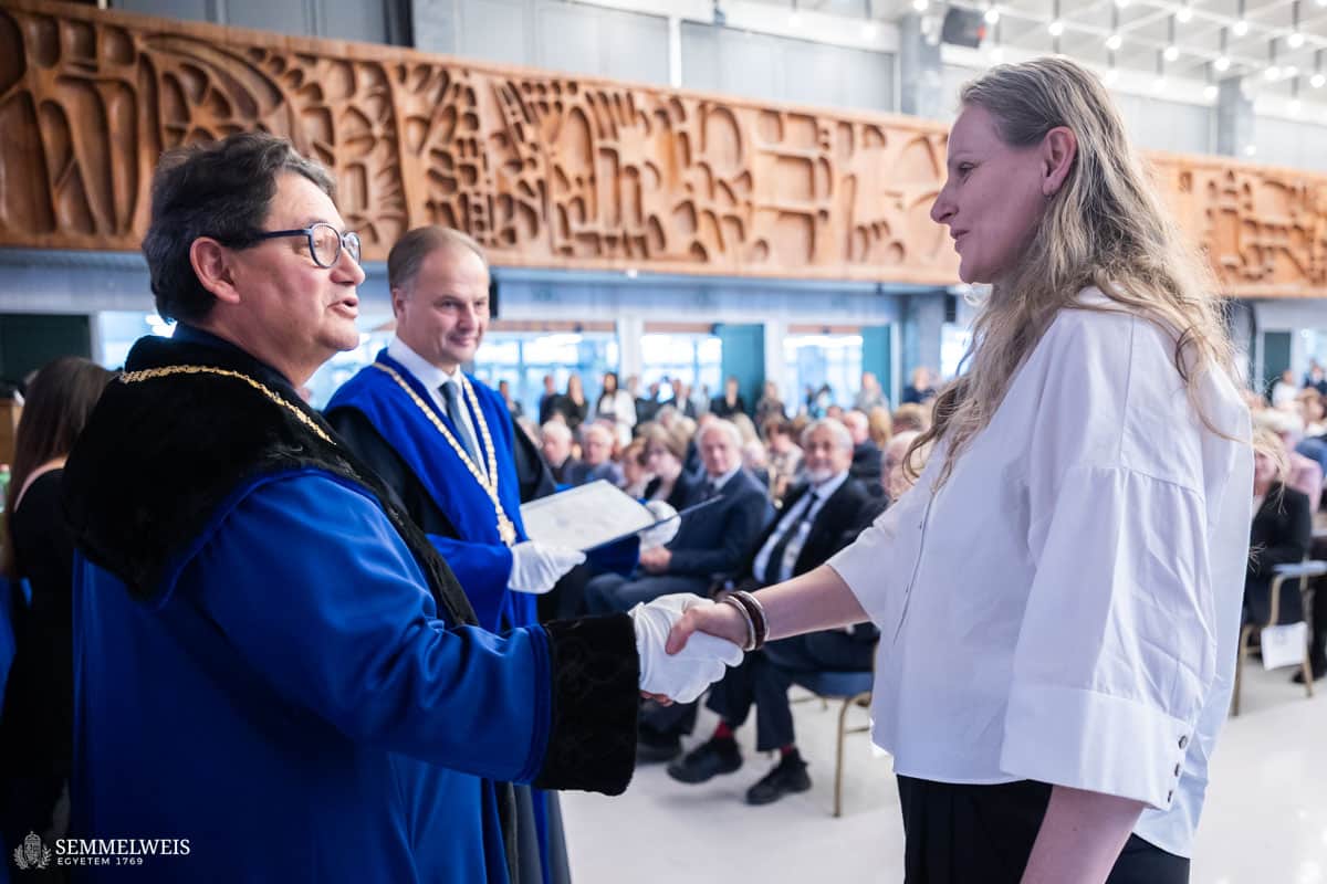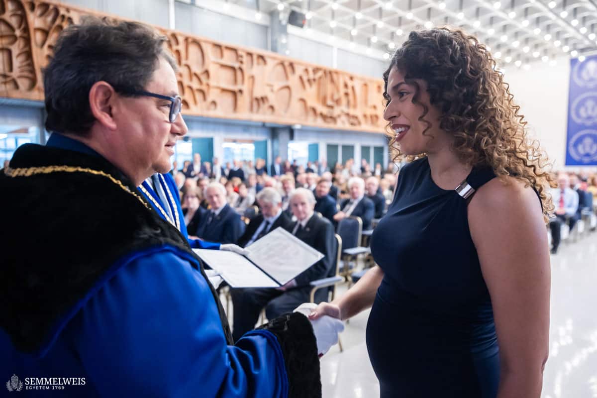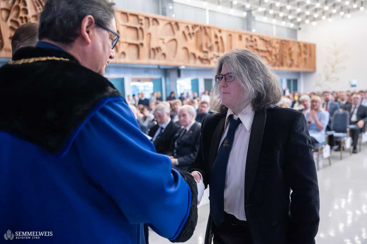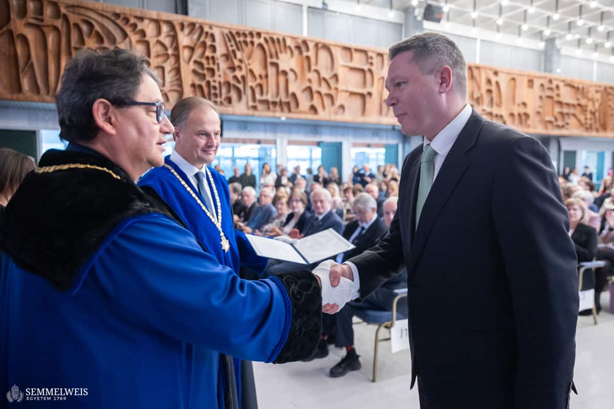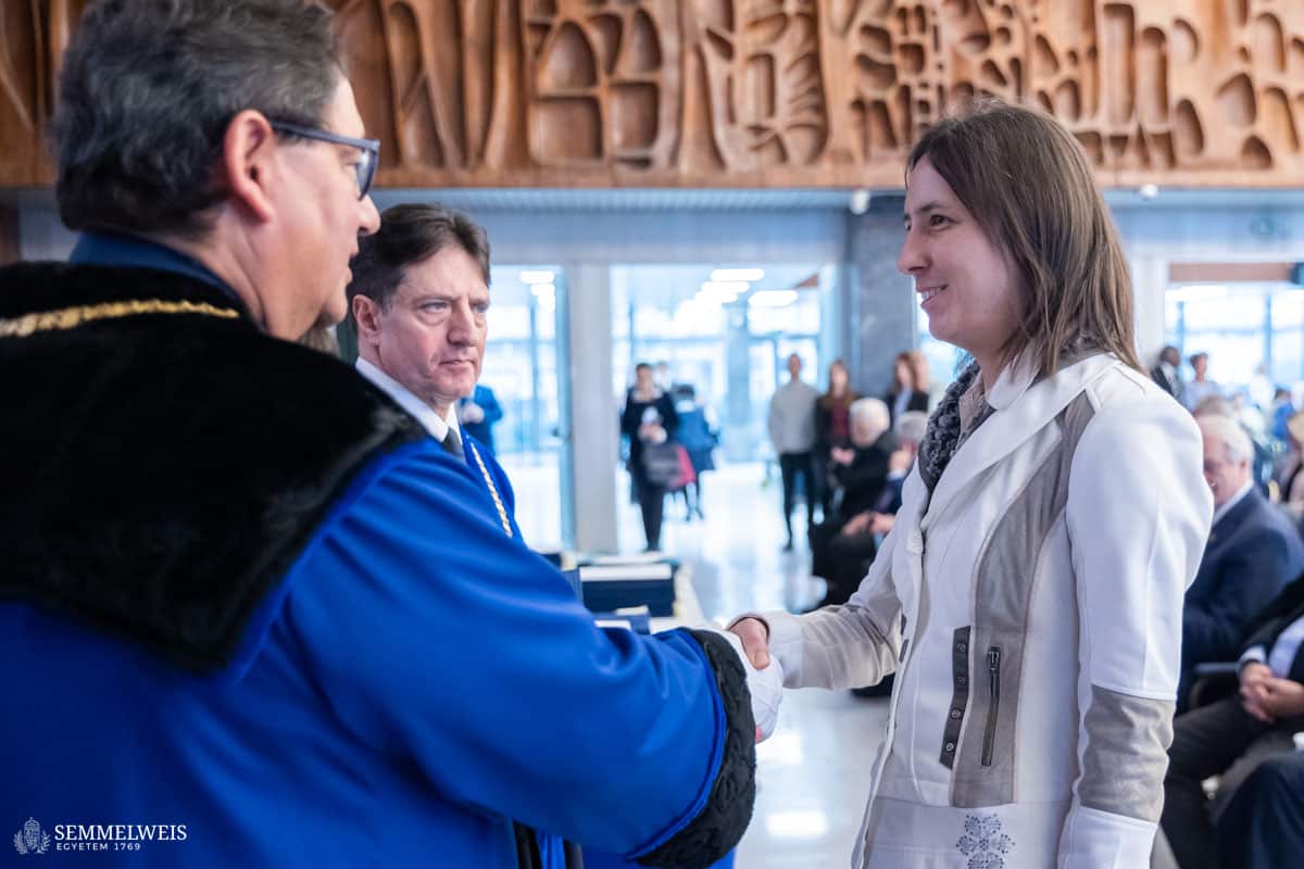 – mondta az ünnepségen dr. Benyó Zoltán, a Doktori Tanács elnöke. A magyar és a nemzetközi képzésben résztvevő, a képzésüket sikeresen teljesítő doktorjelöltek eskütétele után dr. Merkely Béla és dr. Benyó Zoltán kézfogásukkal PhD-fokozatú doktorrá avatta a jelölteket.