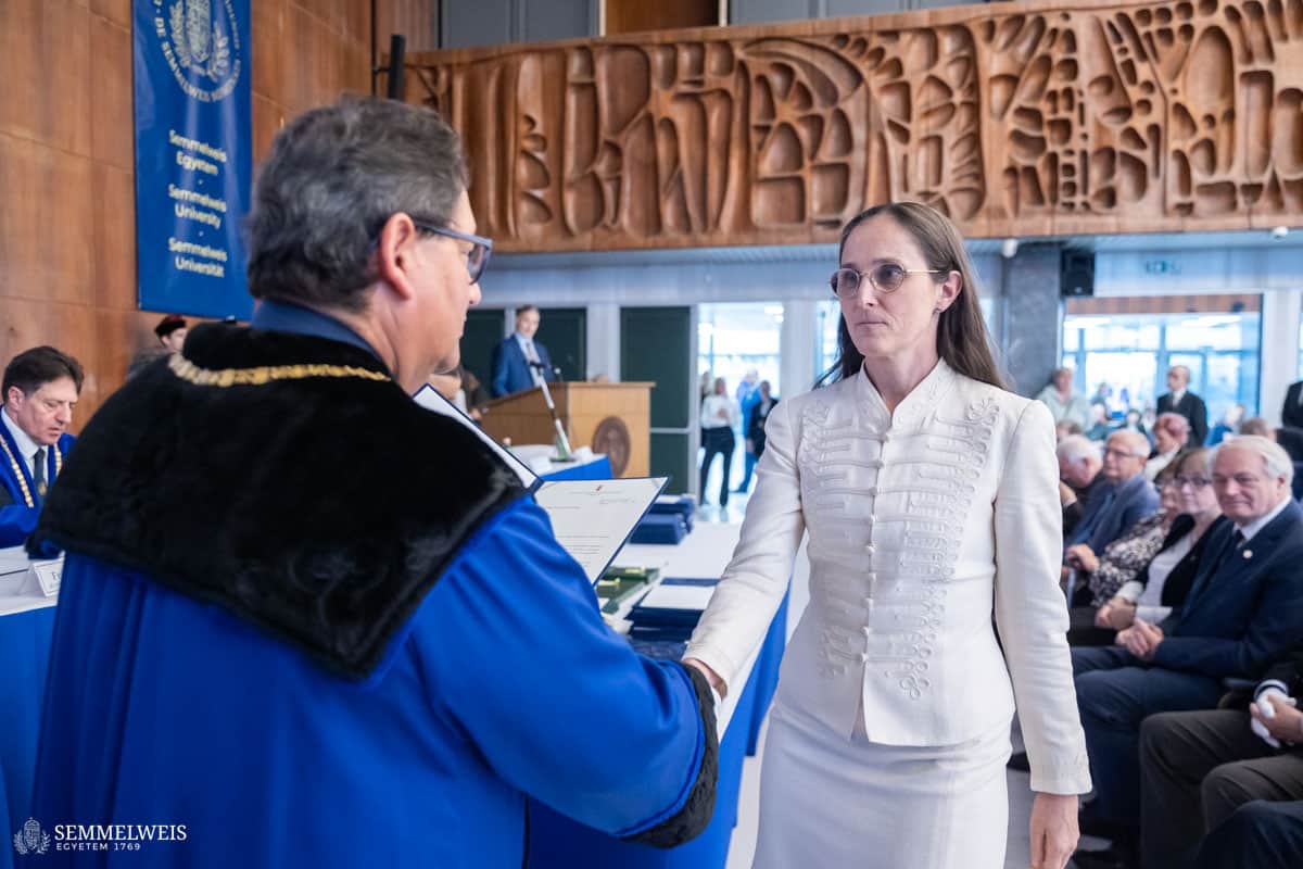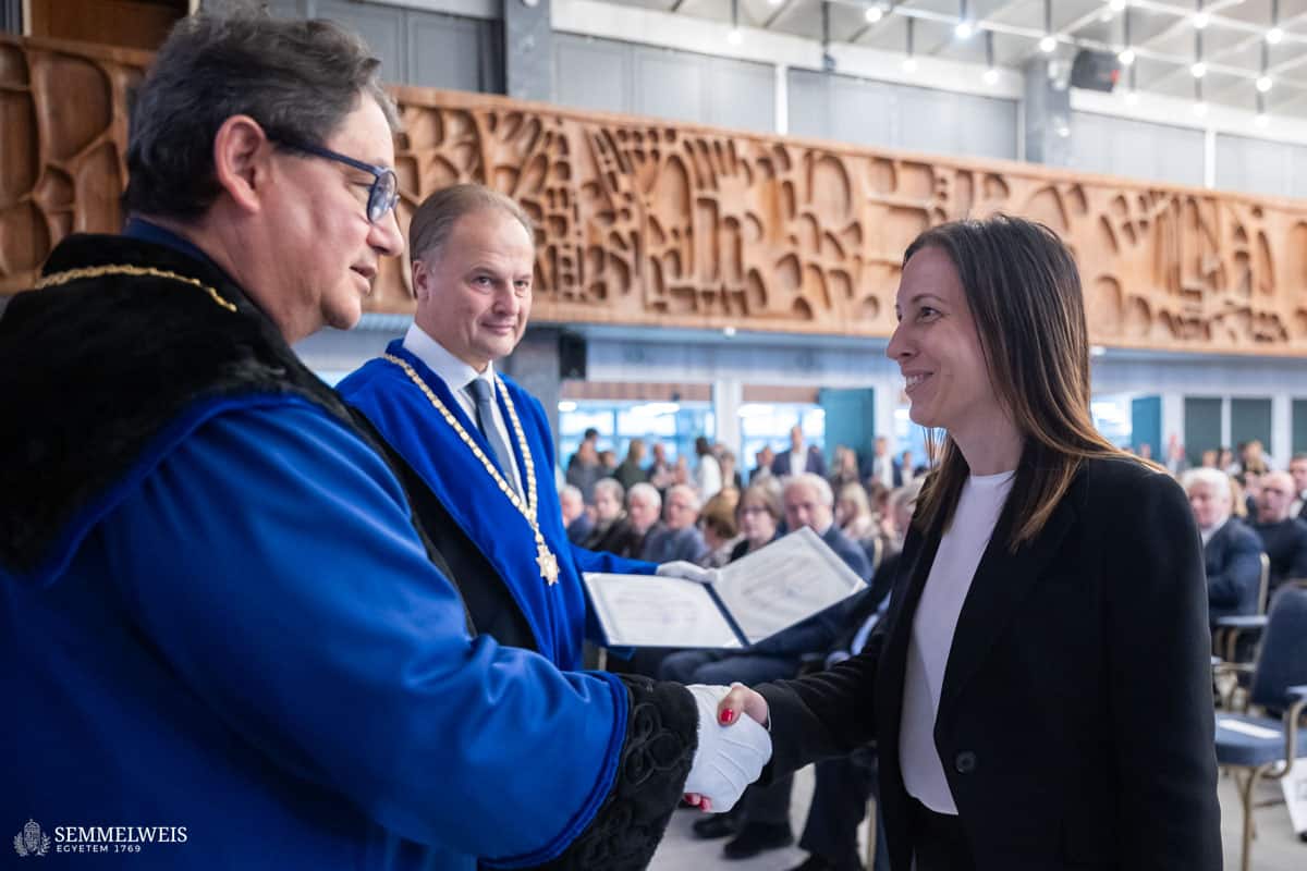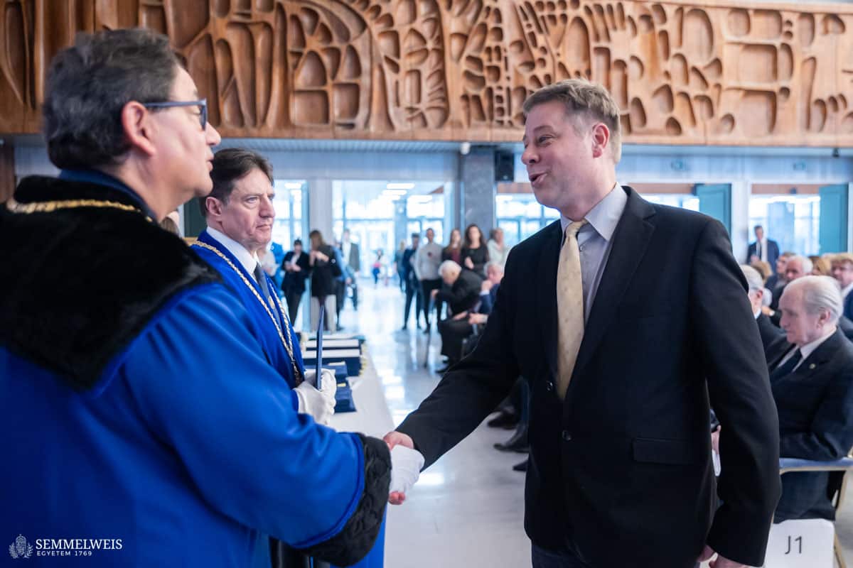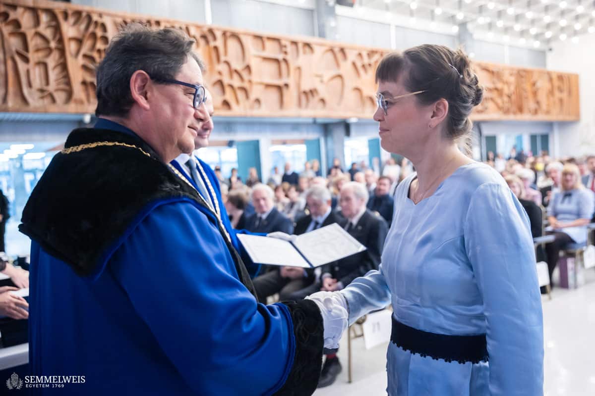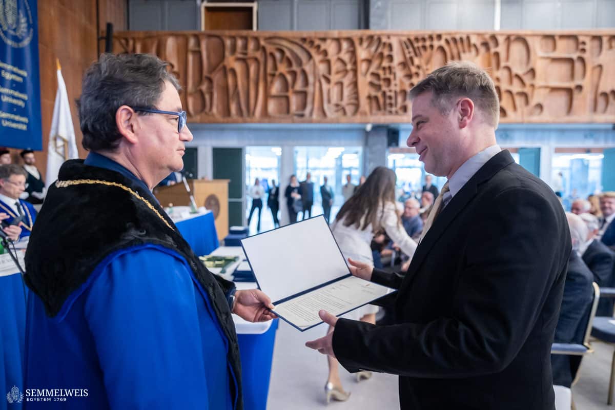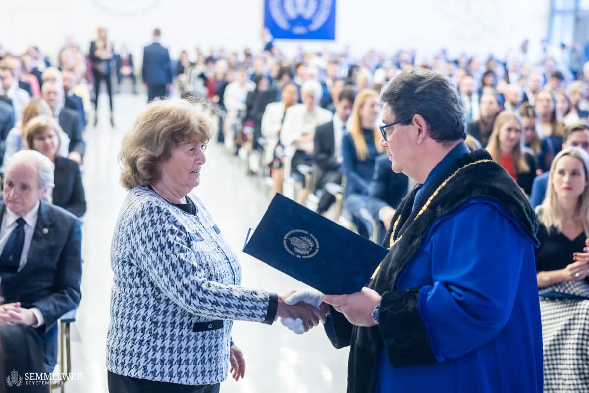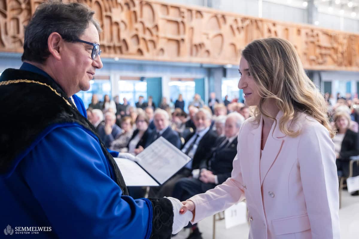 – mondta az ünnepségen dr. Benyó Zoltán, a Doktori Tanács elnöke. A magyar és a nemzetközi képzésben résztvevő, a képzésüket sikeresen teljesítő doktorjelöltek eskütétele után dr. Merkely Béla és dr. Benyó Zoltán kézfogásukkal PhD-fokozatú doktorrá avatta a jelölteket.