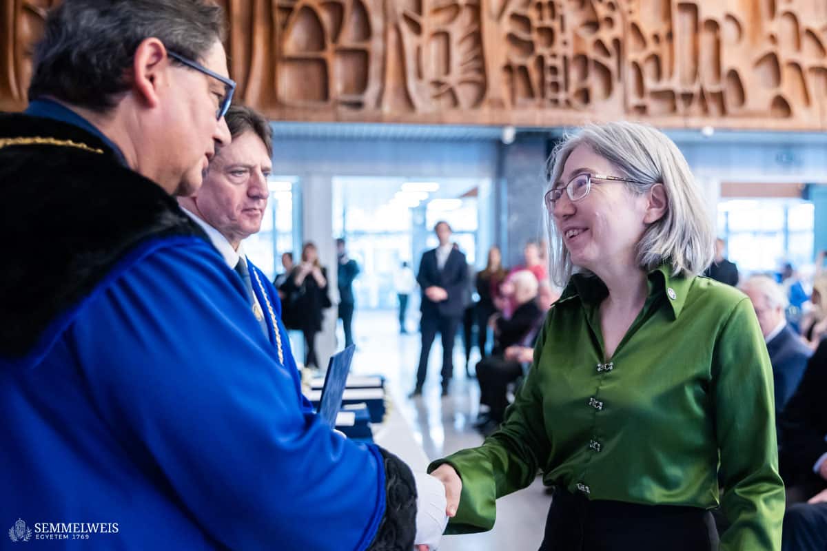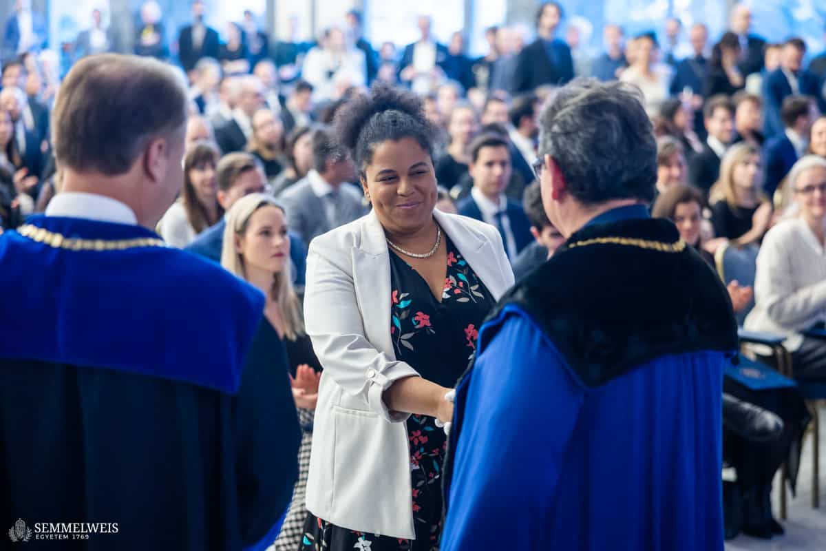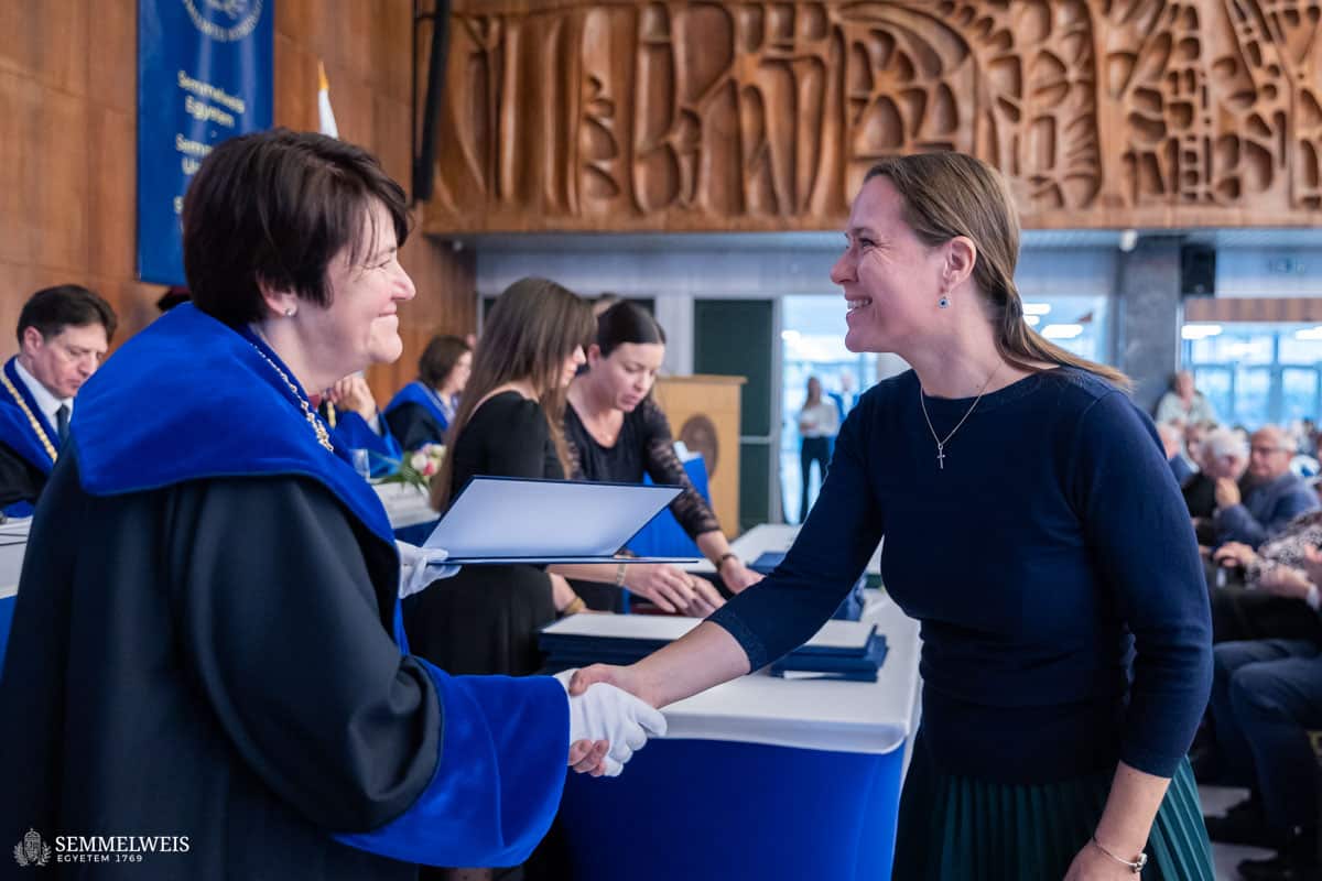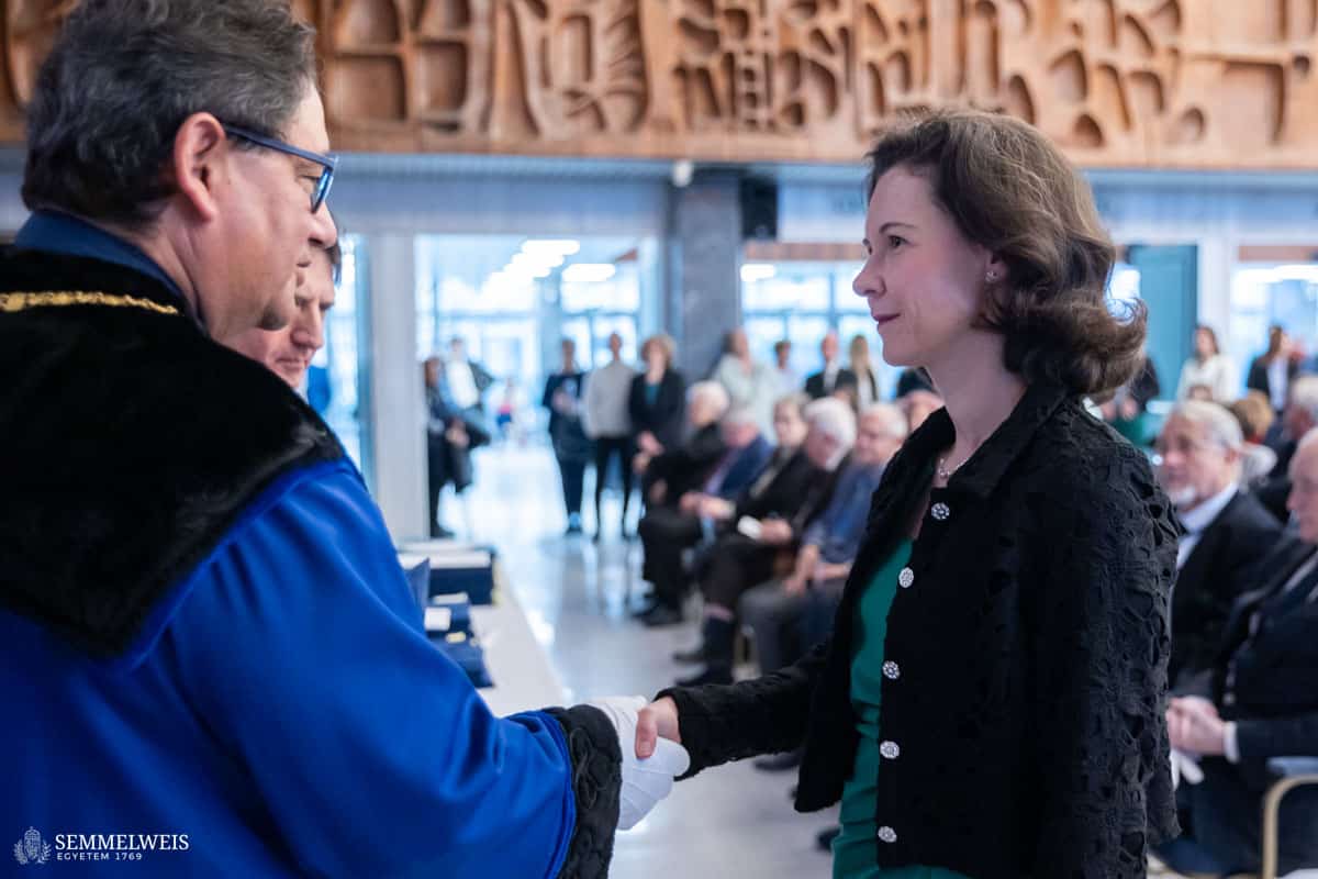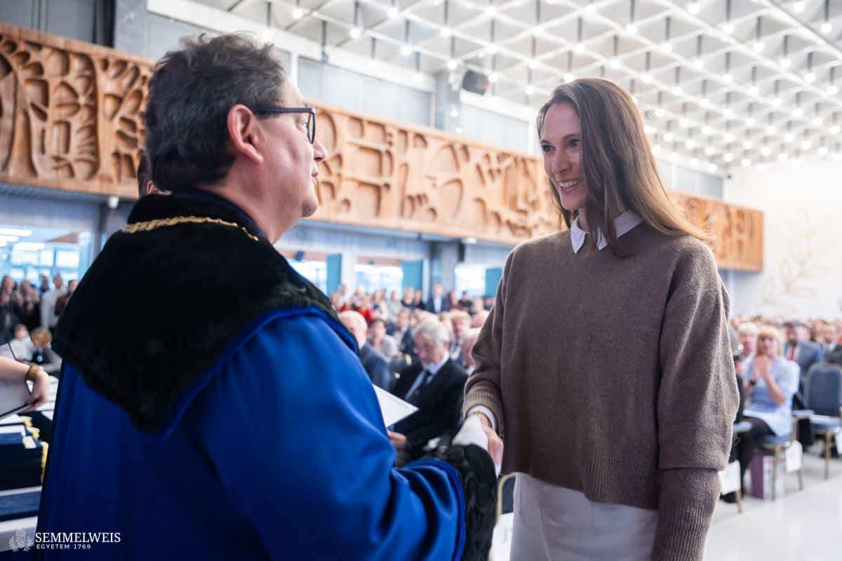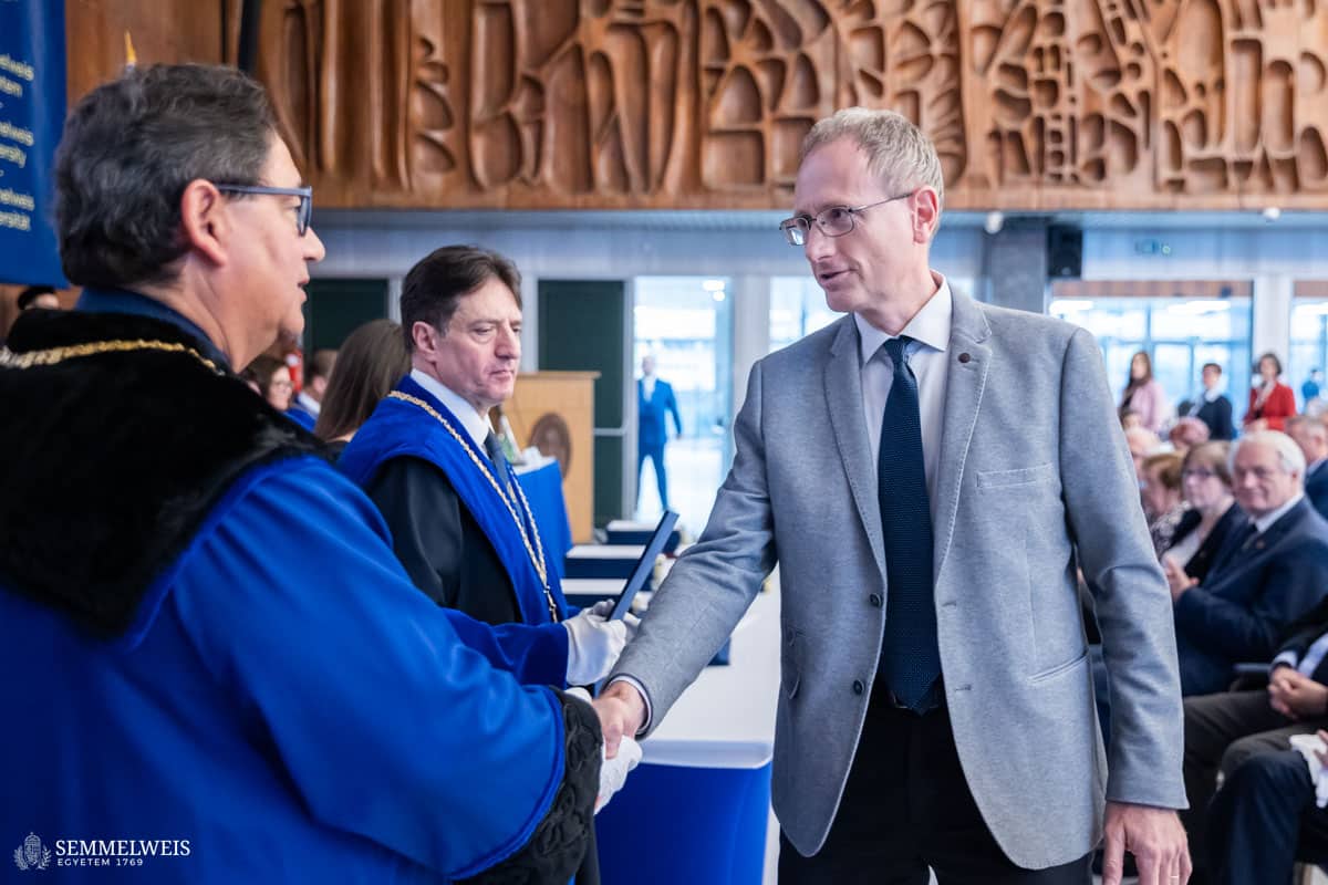 – mondta az ünnepségen dr. Benyó Zoltán, a Doktori Tanács elnöke. A magyar és a nemzetközi képzésben résztvevő, a képzésüket sikeresen teljesítő doktorjelöltek eskütétele után dr. Merkely Béla és dr. Benyó Zoltán kézfogásukkal PhD-fokozatú doktorrá avatta a jelölteket.
