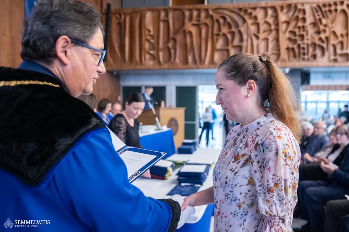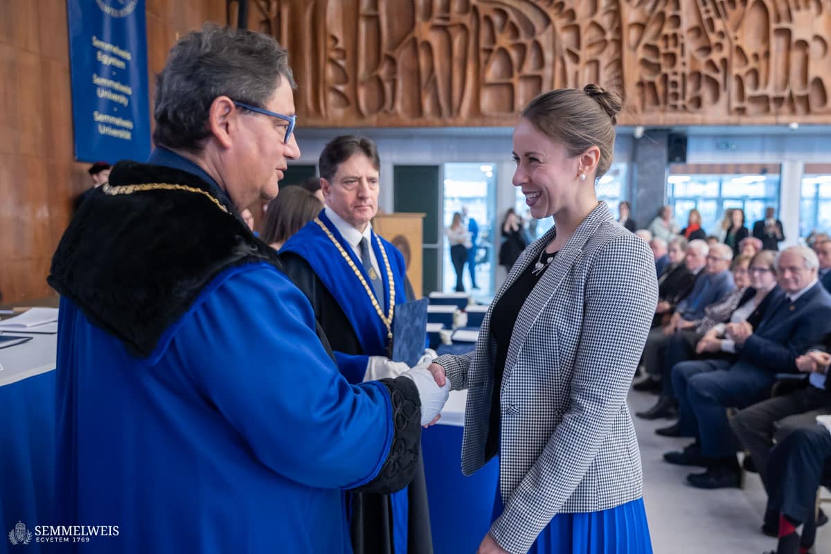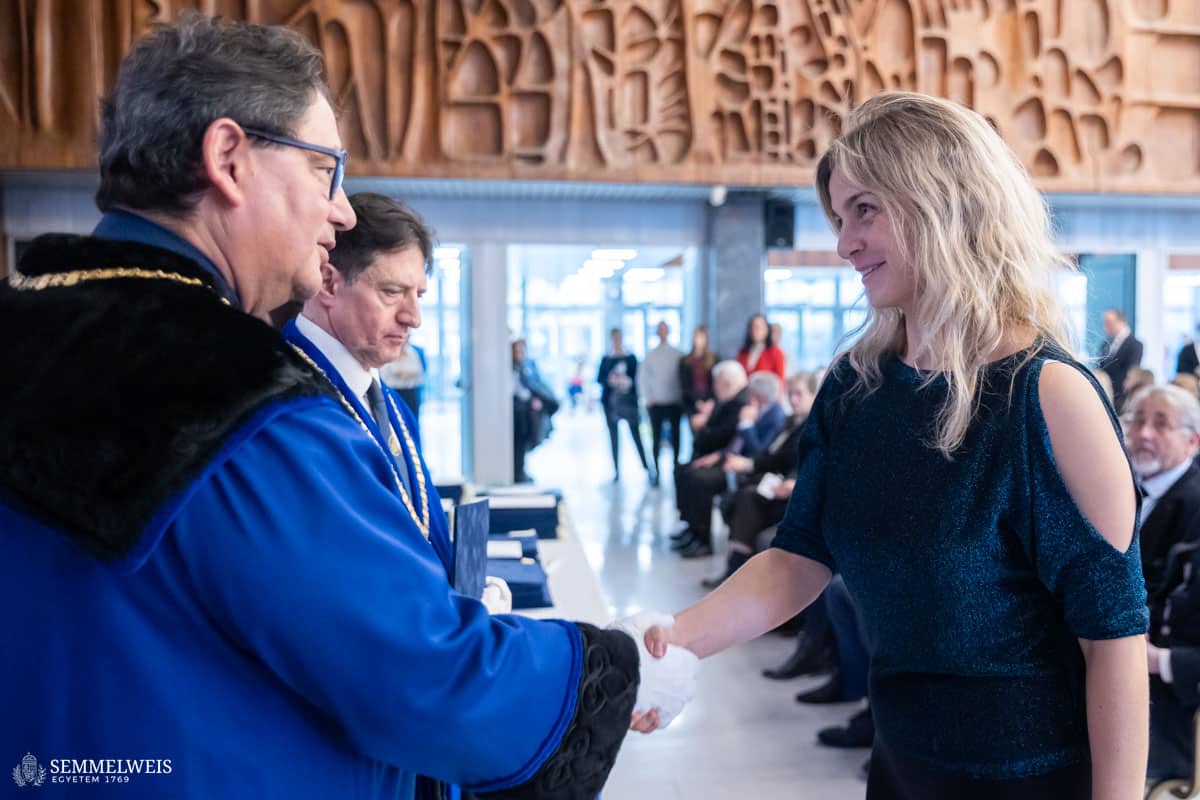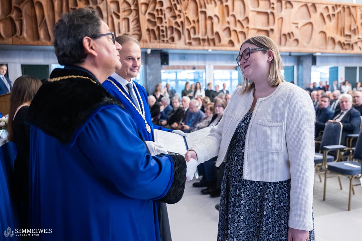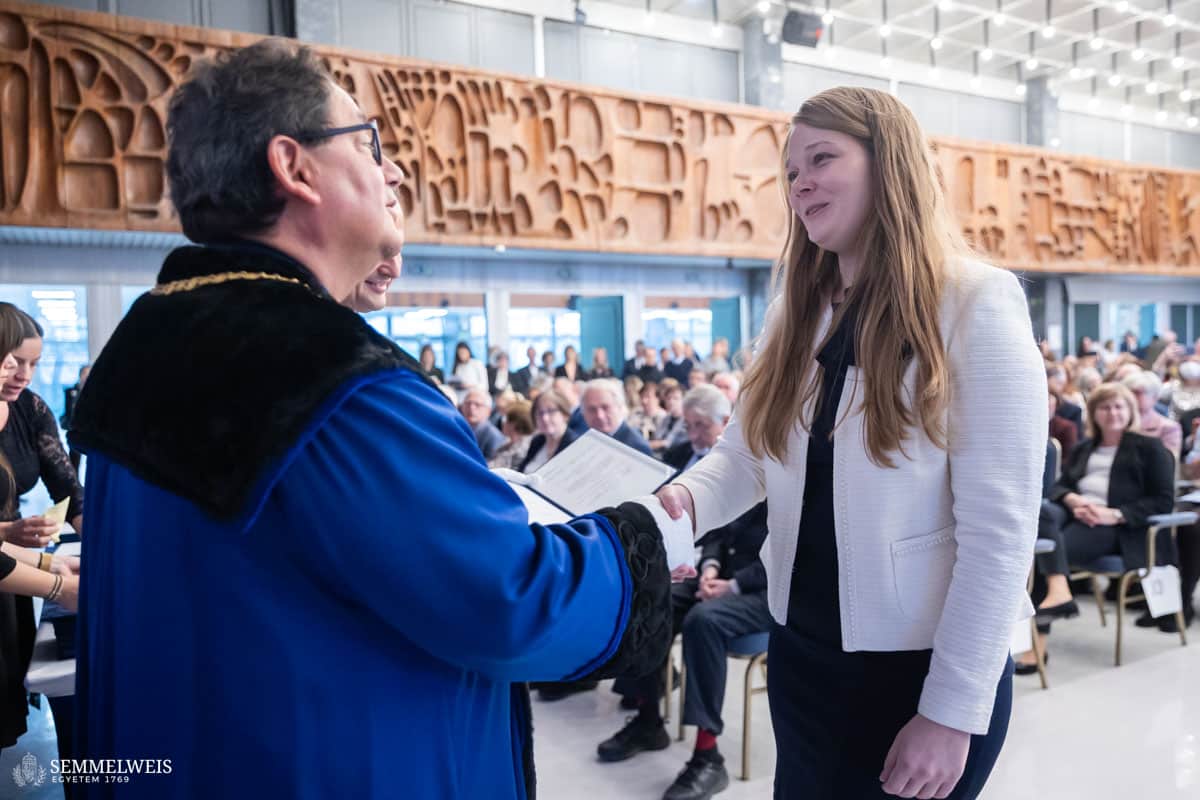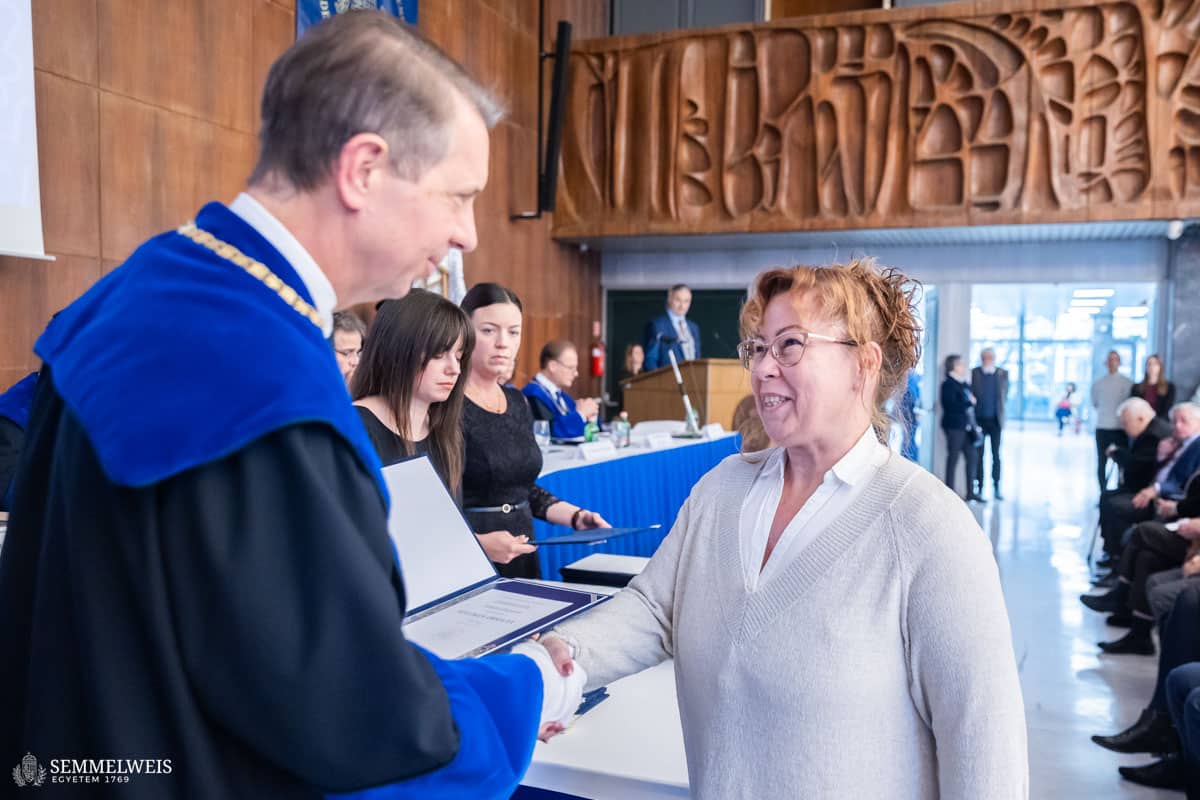 Dr. Merkely Béla rektori dicséret oklevelet adott át Mazán Mercédesz Melindának, a Bőr-, Nemikórtani és Bőronkológiai Klinika labormérnökének.