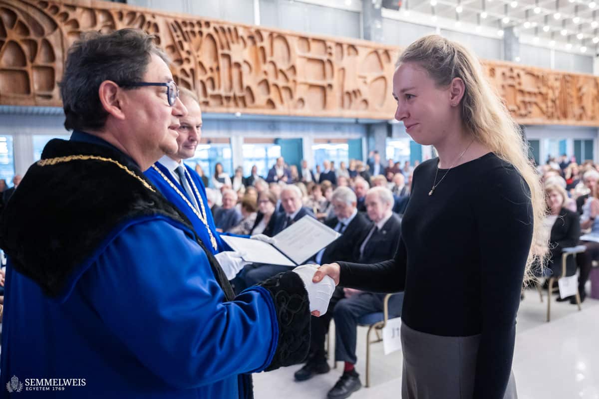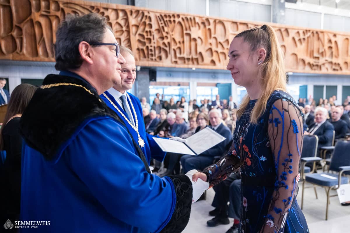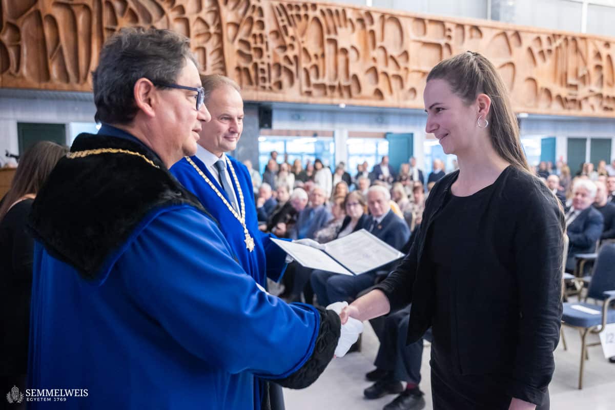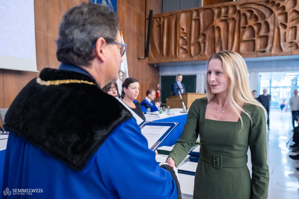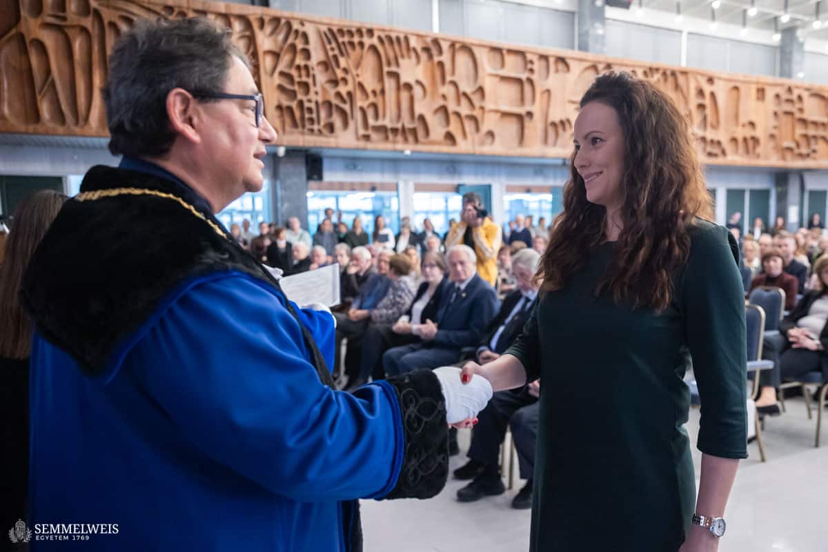 Dr. Merkely Béla rektori dicséret oklevelet adott át Mazán Mercédesz Melindának, a Bőr-, Nemikórtani és Bőronkológiai Klinika labormérnökének.