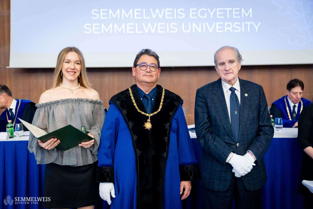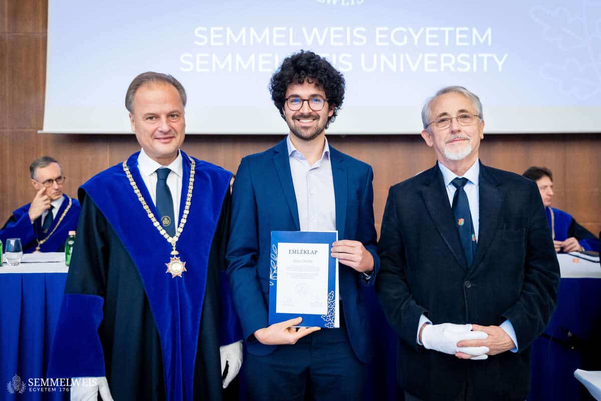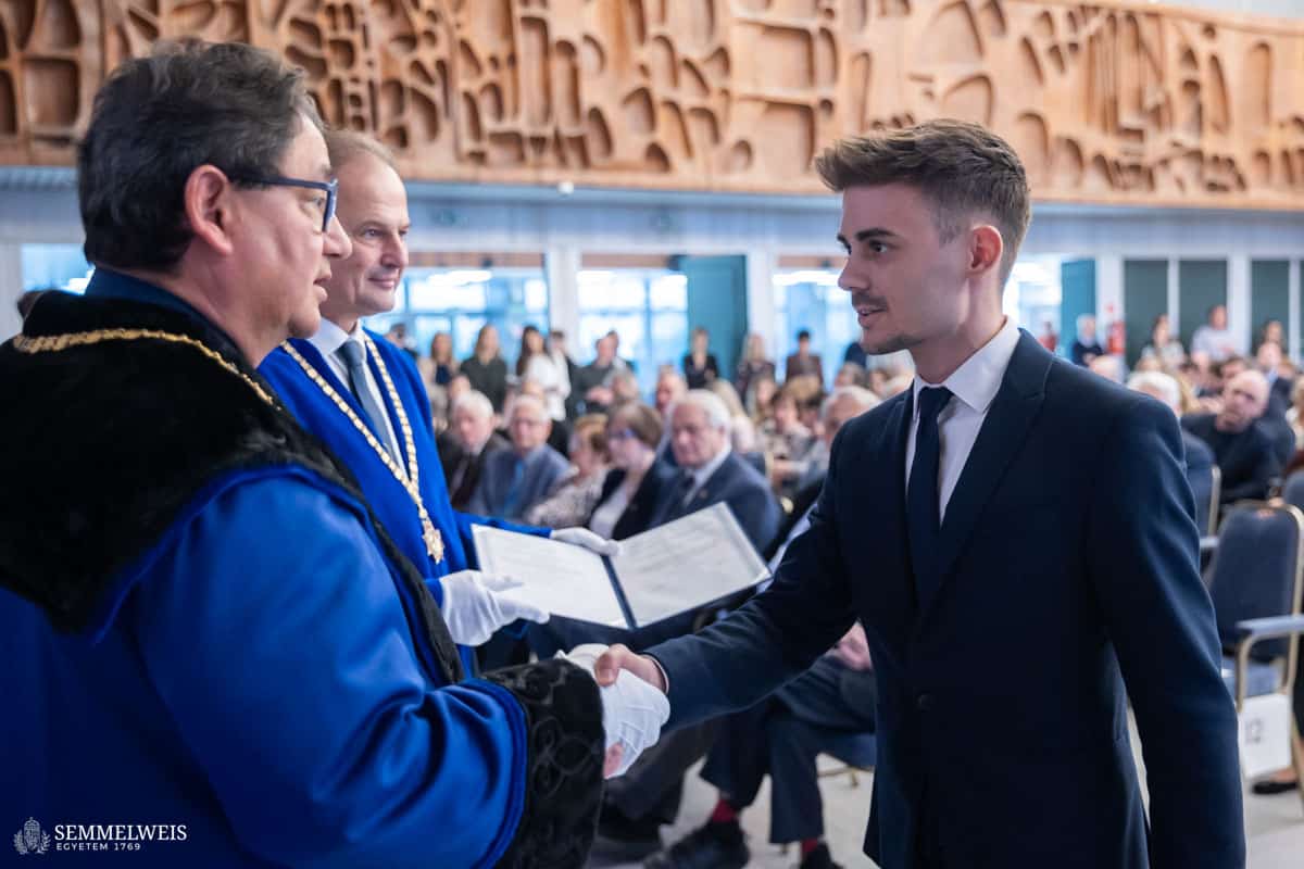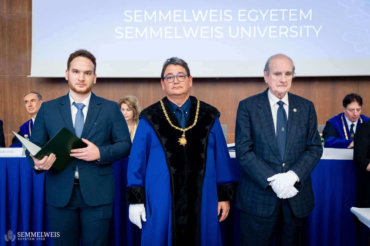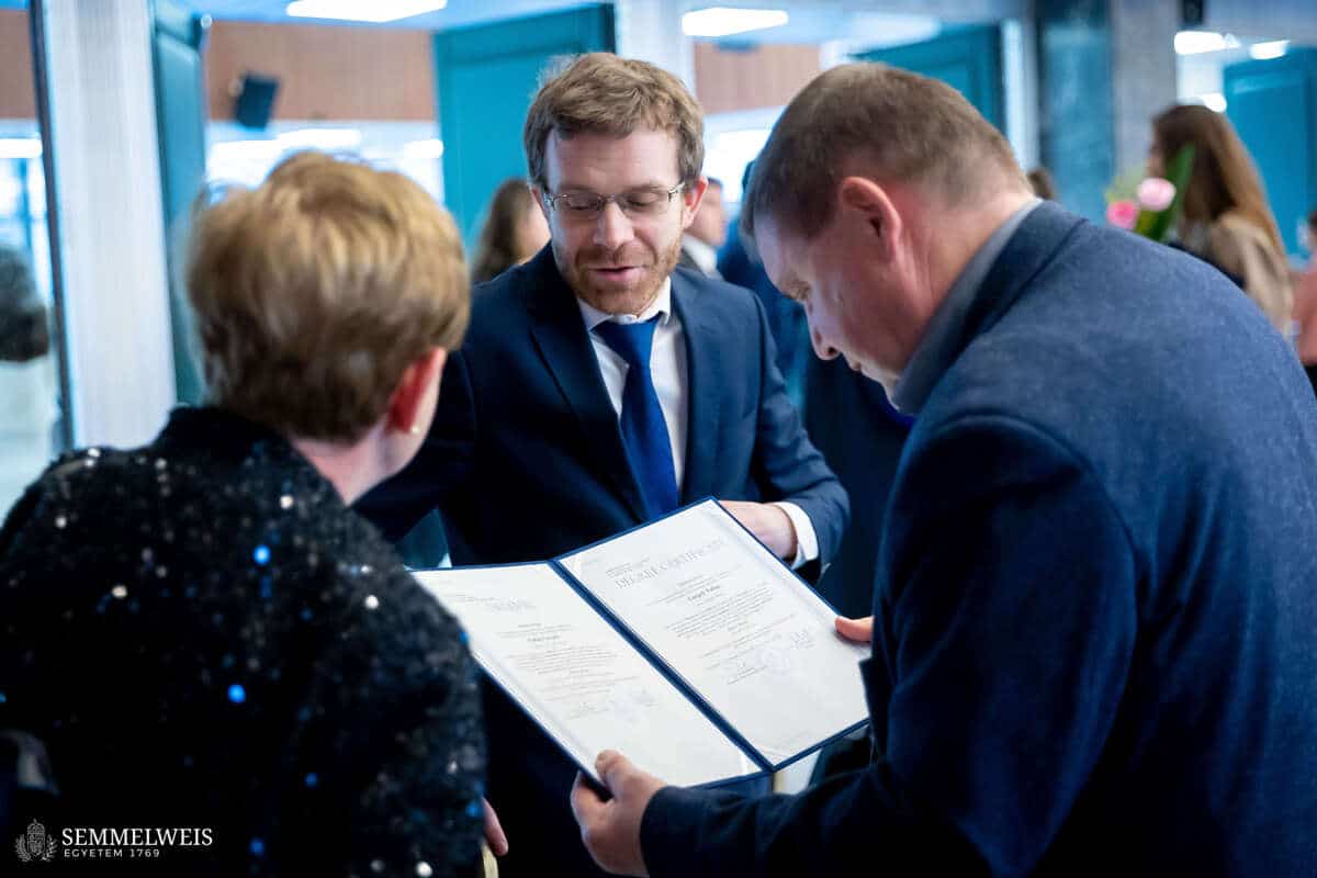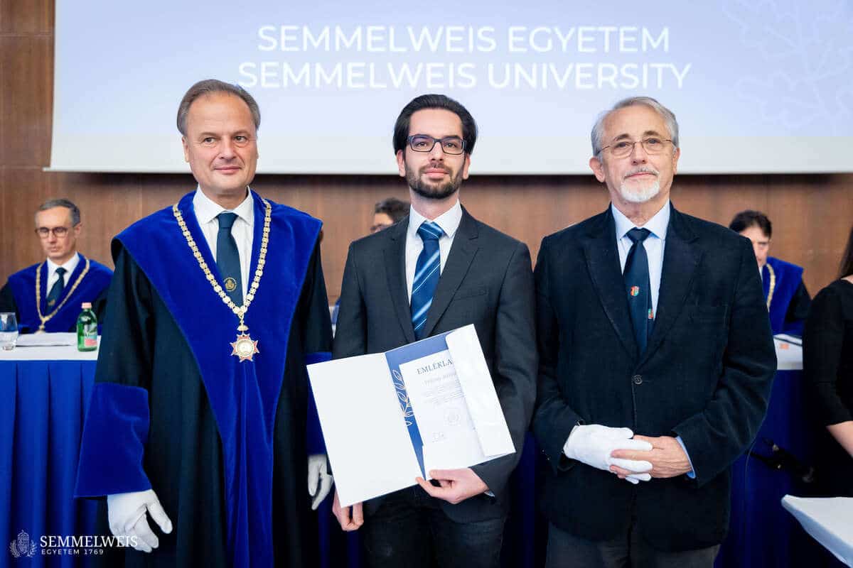 Dr. Benyó Zoltán, a Doktori Iskola elnöke és dr. Rosivall László, a Semmelweis Egyetem Baráti Köre elnöke átadták a Doktorandusz Kiválósági Díjakat. Az elismerésre idén 14 pályázat érkezett. Az ünnepségen a díjazottak közül Gergely Tamás, a Molekuláris Gyógyszertudományok és Egészségügyi Technológiák Tagozat; Idan Carmi, a Molekuláris Orvostudományi Tagozat és Vékony Bálint, Rácz Károly Konzervatív Orvostudományi Tagozat PhD-hallgatója vette át az elismerést.