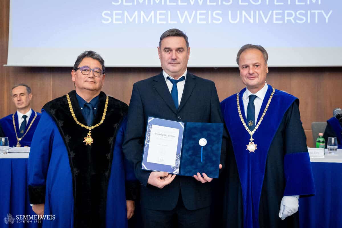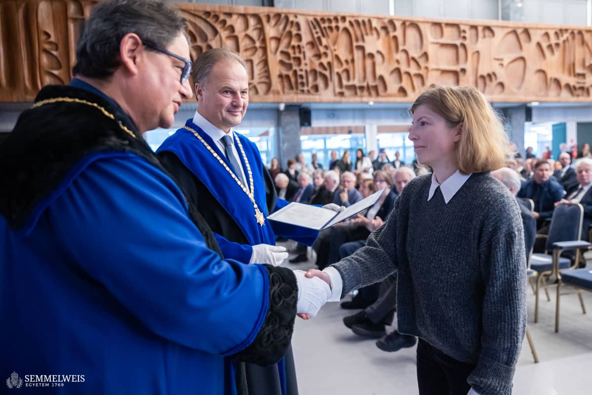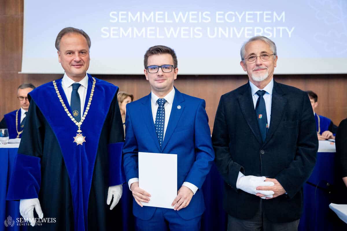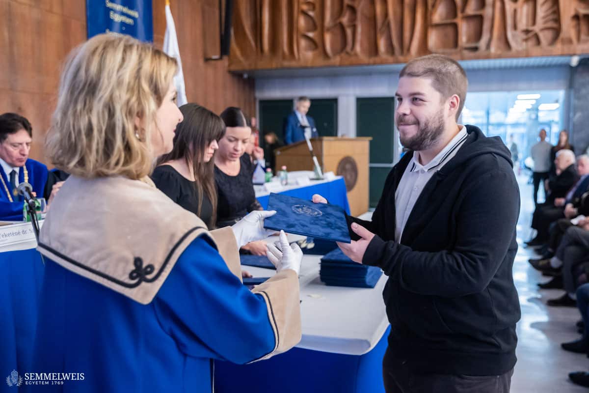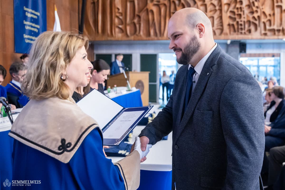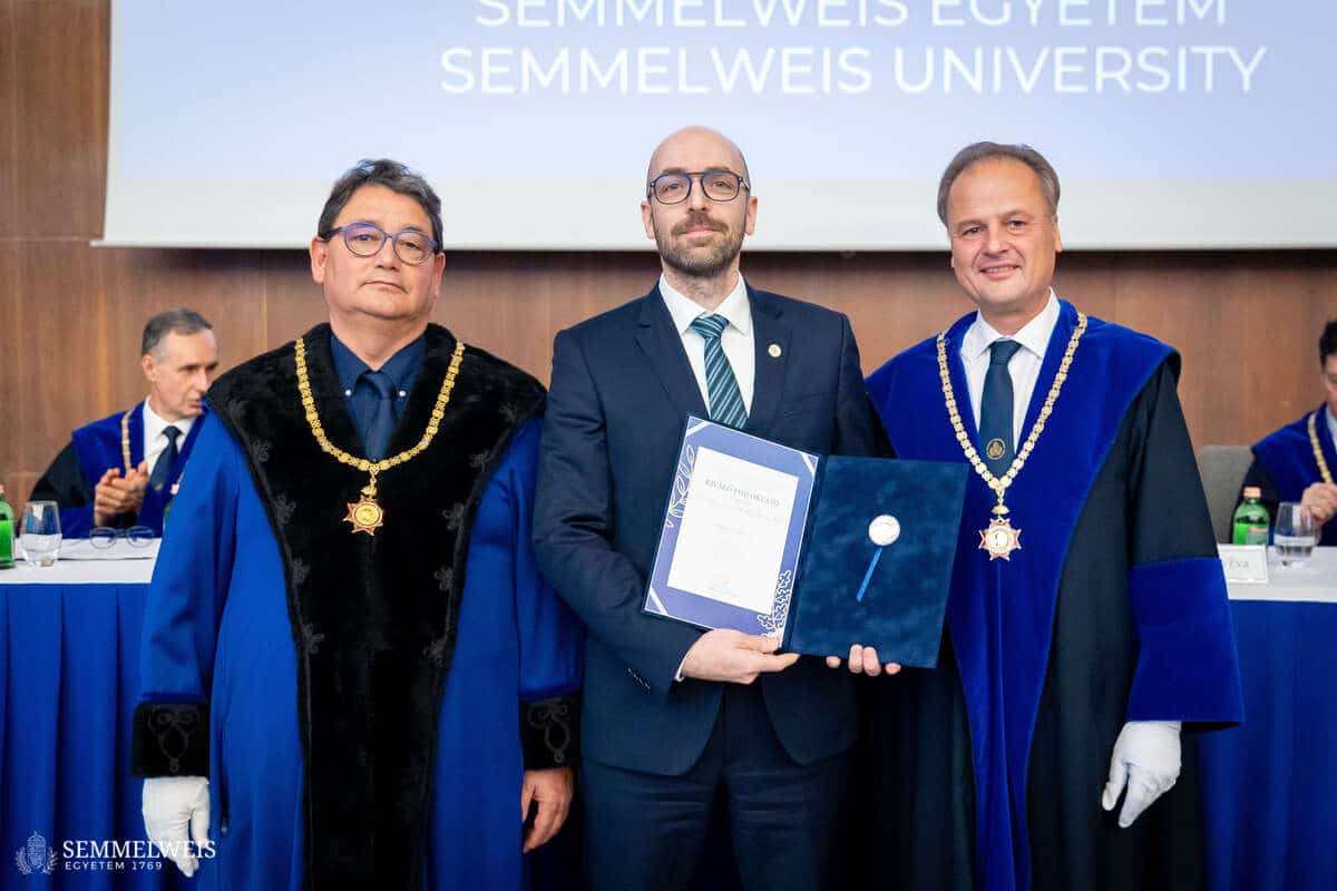 A Semmelweis Egyetem Kiváló Dolgozója kitüntetést adott át dr. Pavlik Lívia kancellár Lampert Bencének, az Informatikai Fejlesztési Igazgatóság Alkalmazásfejlesztési Osztály szoftverfejlesztőjének, valamint Virág Rolandnak, a Biztonságtechnikai Igazgatóság Biztonságszervezési Osztály műszaki vezetőjének.